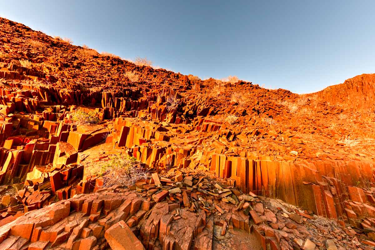 Dans l’après-midi, possibilité de visiter avec votre véhicule le célèbre site de Twyfelfontein, à la découverte des gravures et peintures rupestres, ainsi que la montagne brûlée et des orgues basaltiques.