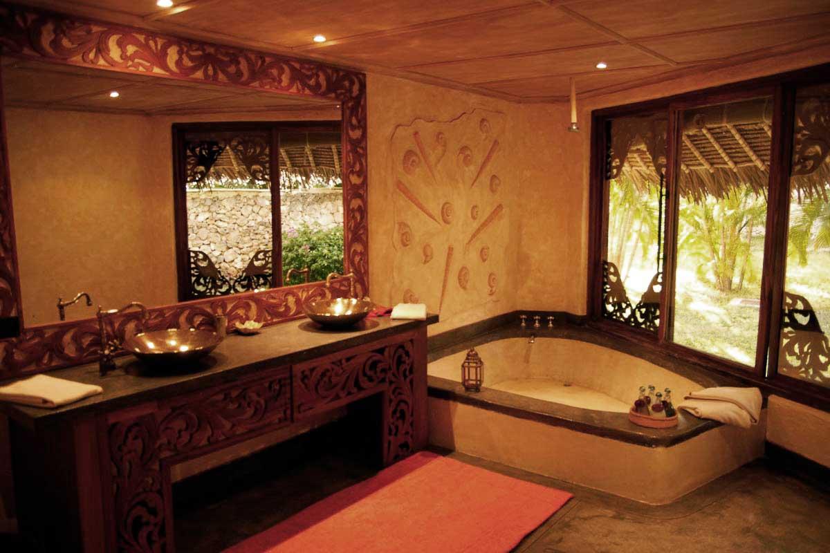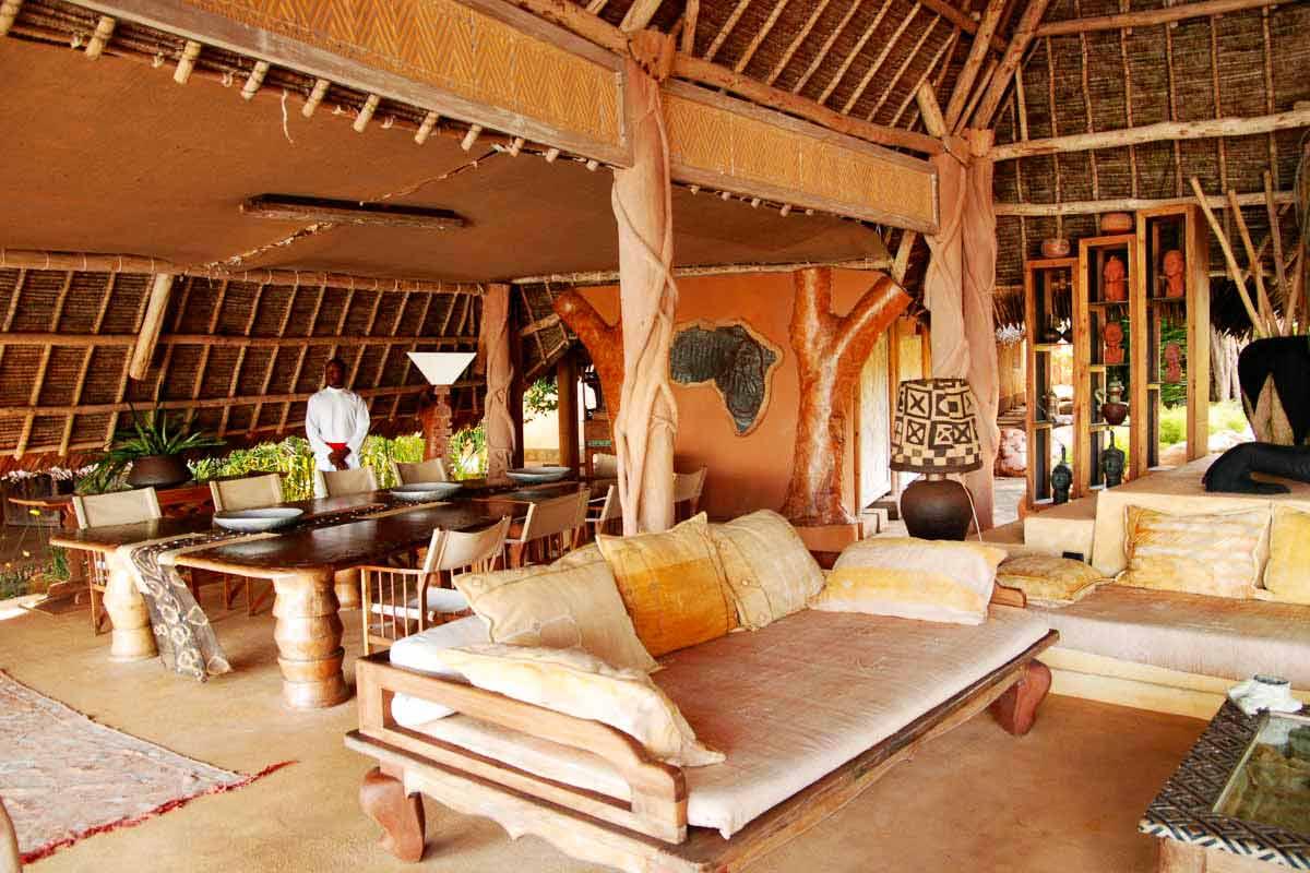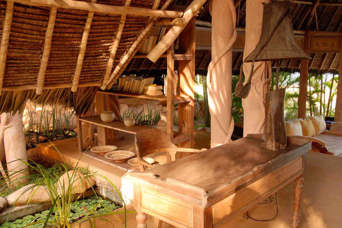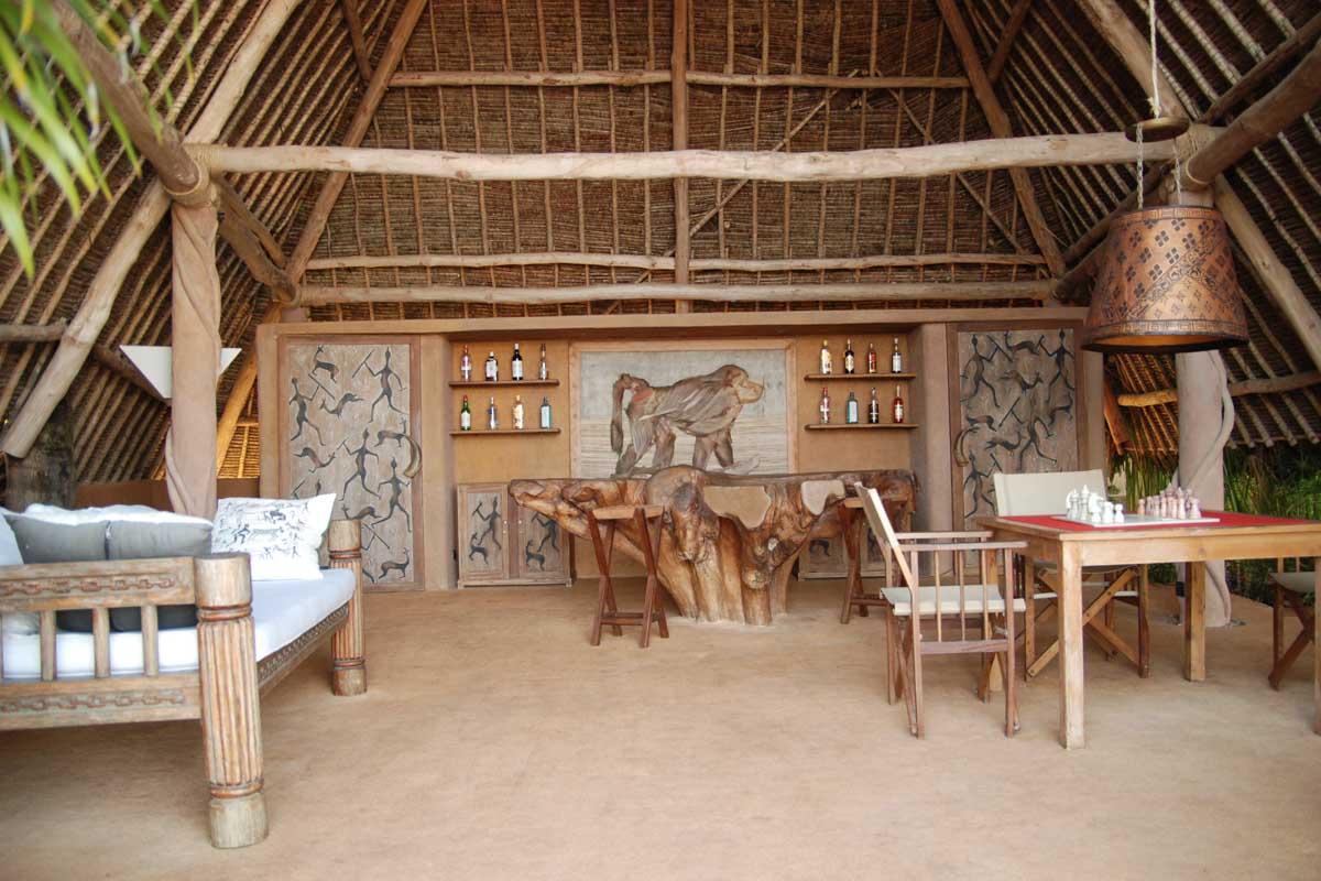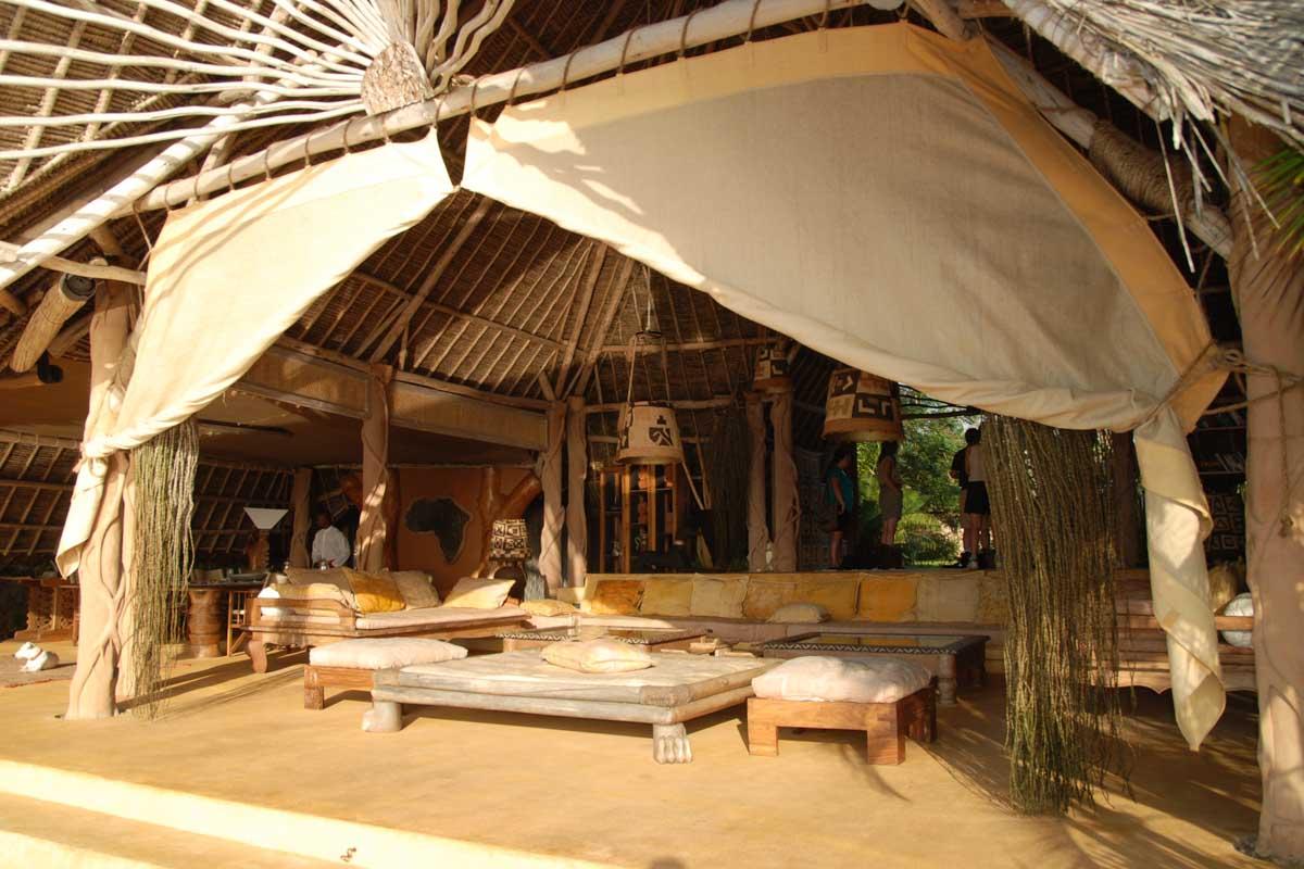ALFAJIRI GARDEN VILLA est largement ouverte sur l’extérieur, son salon et sa salle à manger étant juste couverts par un toit en makuti.