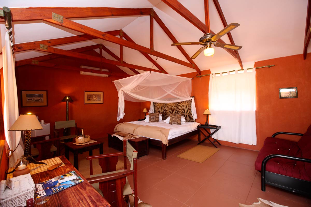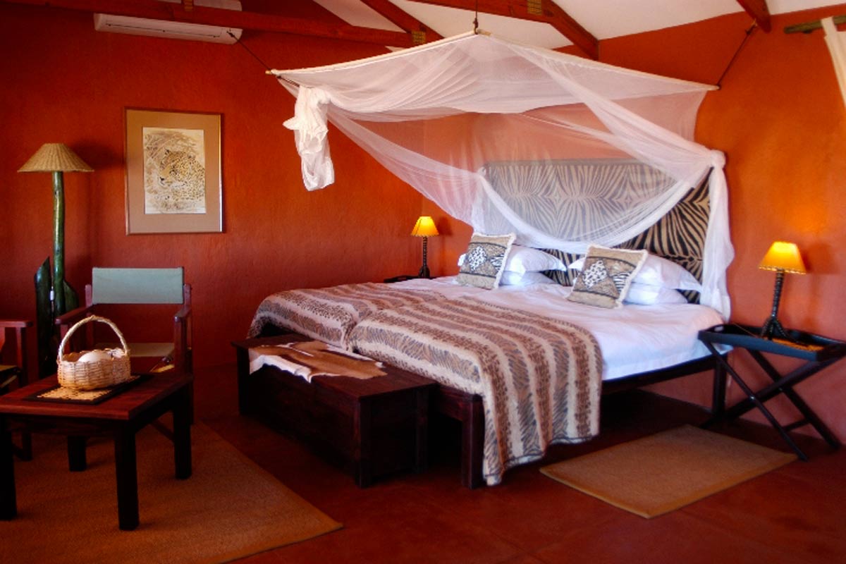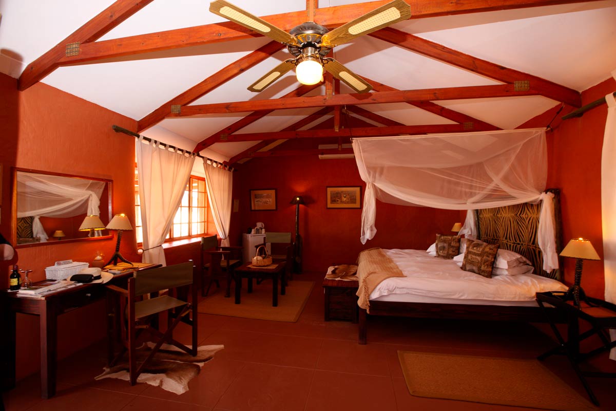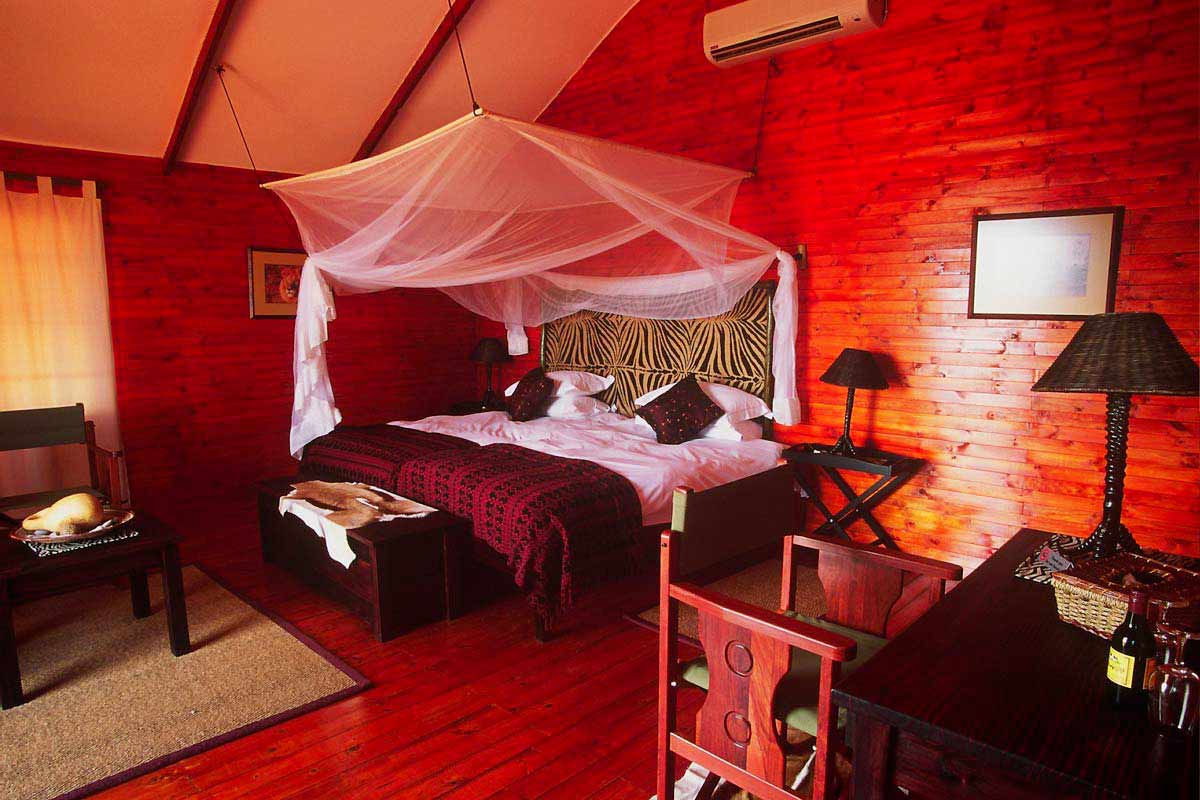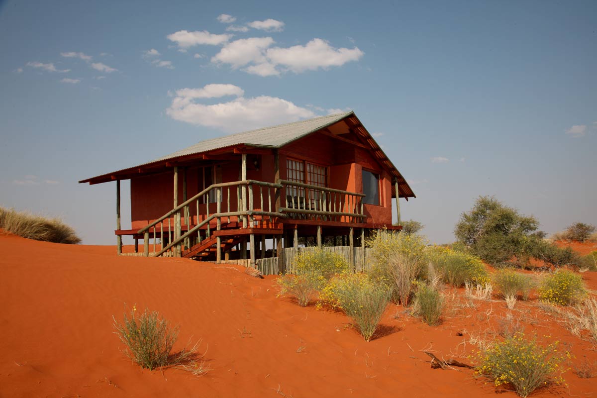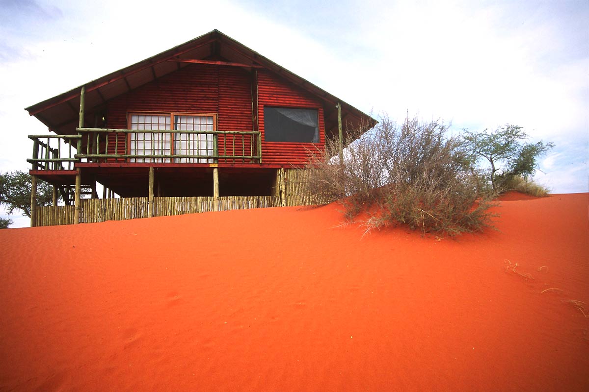 BAGATELLE KALAHARI GAME RANCH propose 10 chambres en bois : 4 sont construites sur pilotis, en haut de dunes et 6 autres aux pieds des dunes.