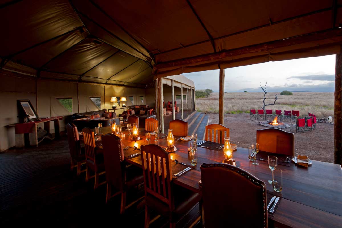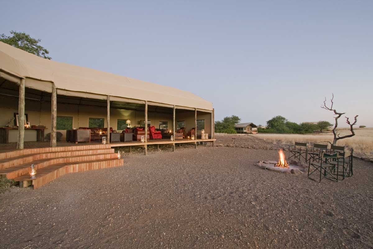 Les parties communes (restaurant et bar) du Desert Rhino Camp se dressent sur une grande plateforme et sont largement ouvertes sur l’extérieur.