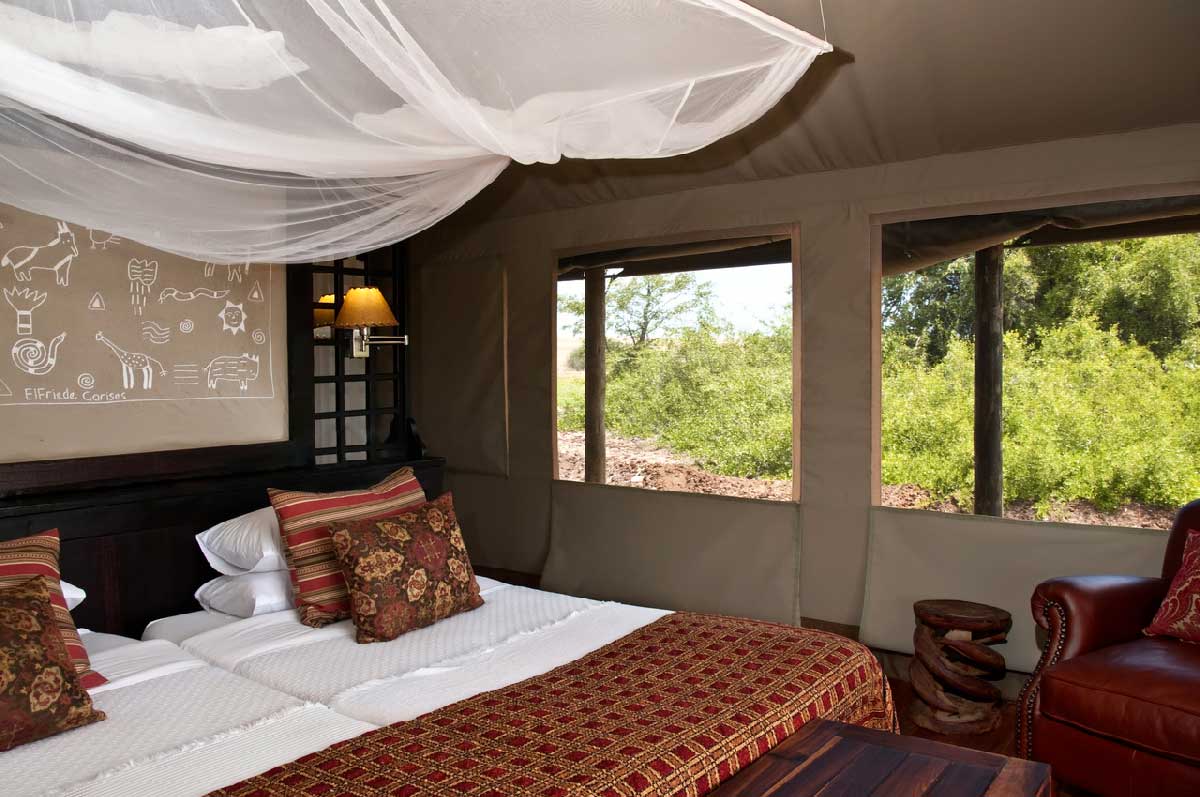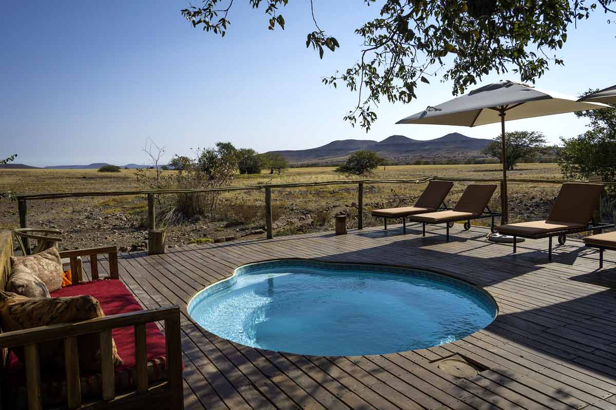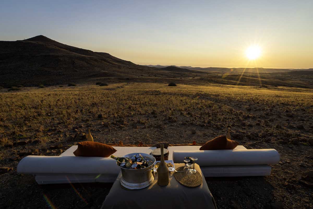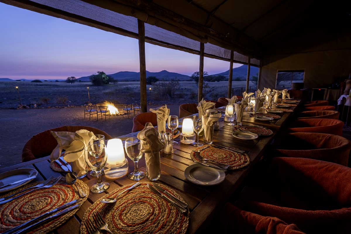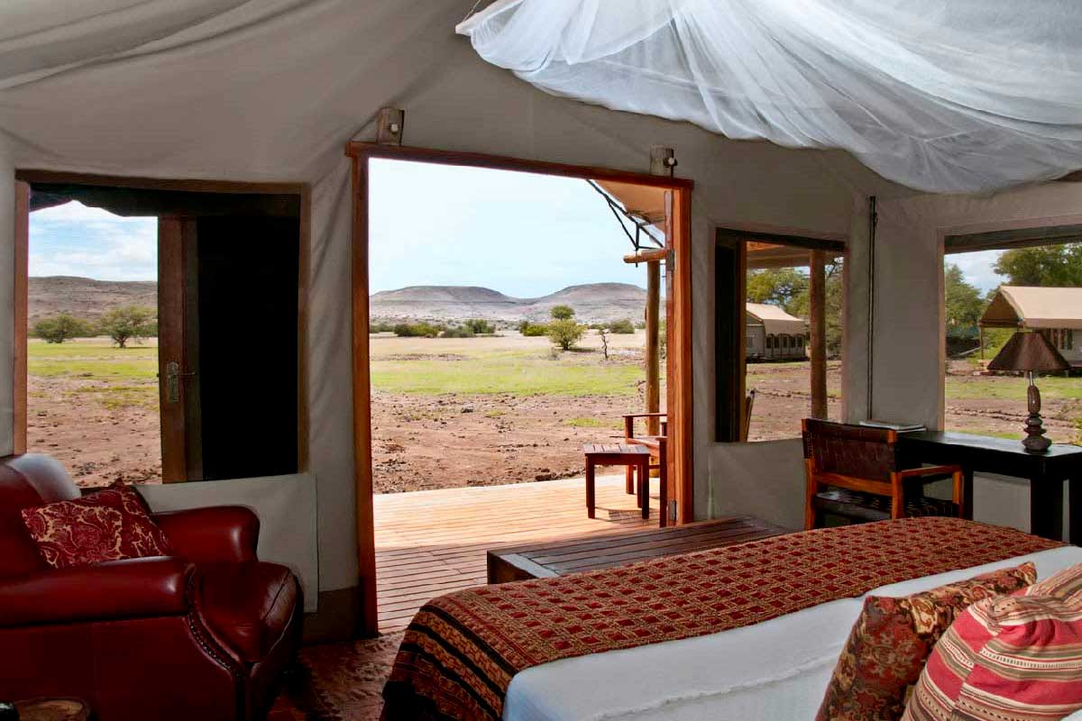 Le Desert Rhino Camp est situé dans le Damaraland dans une vaste concession privée de 450 000 hectares : la Palmwag Concession. Celle-ci abrite la plus large concentration de rhinocéros noirs vivant en liberté d’Afrique (plus d’une centaine).