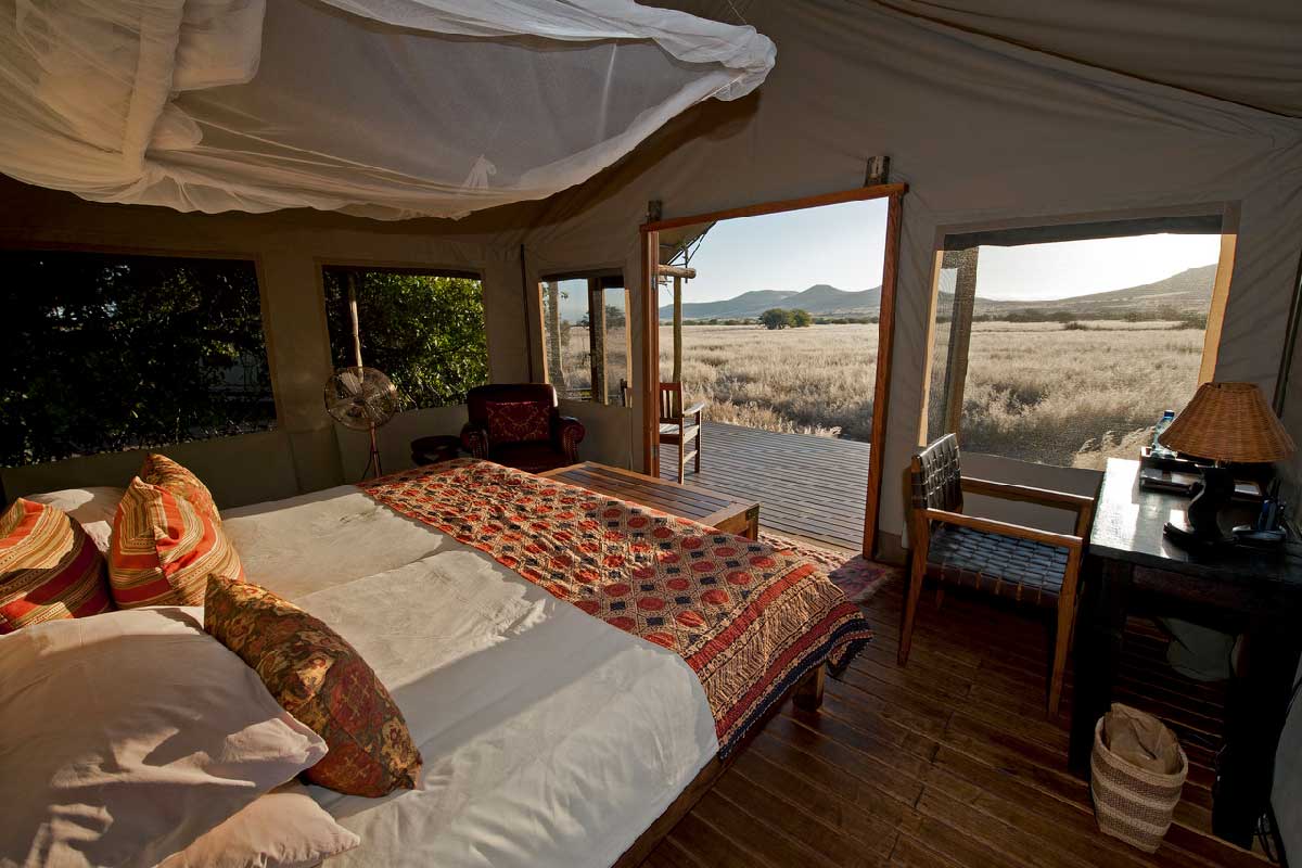 Le Desert Rhino Camp ne compte que 8 tentes sur plateformes en bois. La vue de la terrasse et le silence sont saisissants…