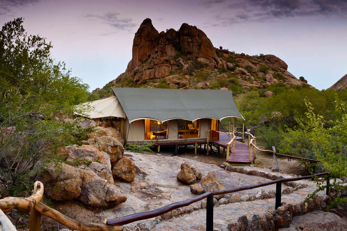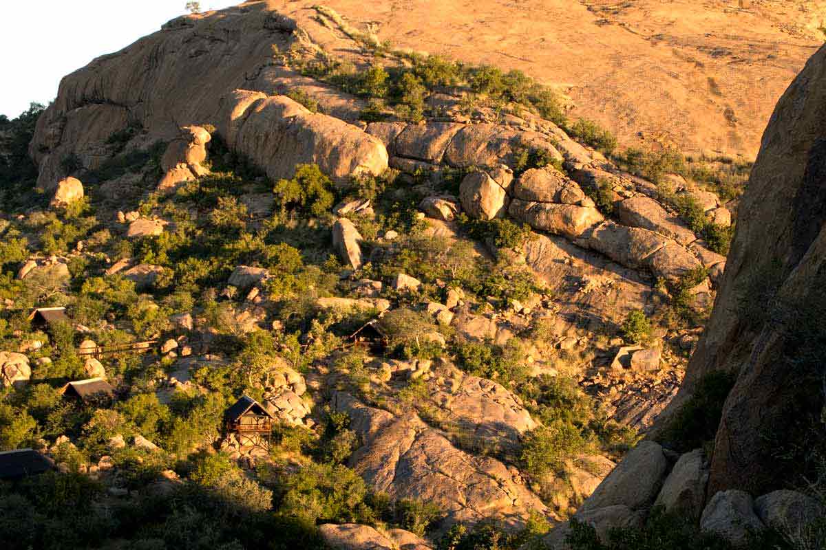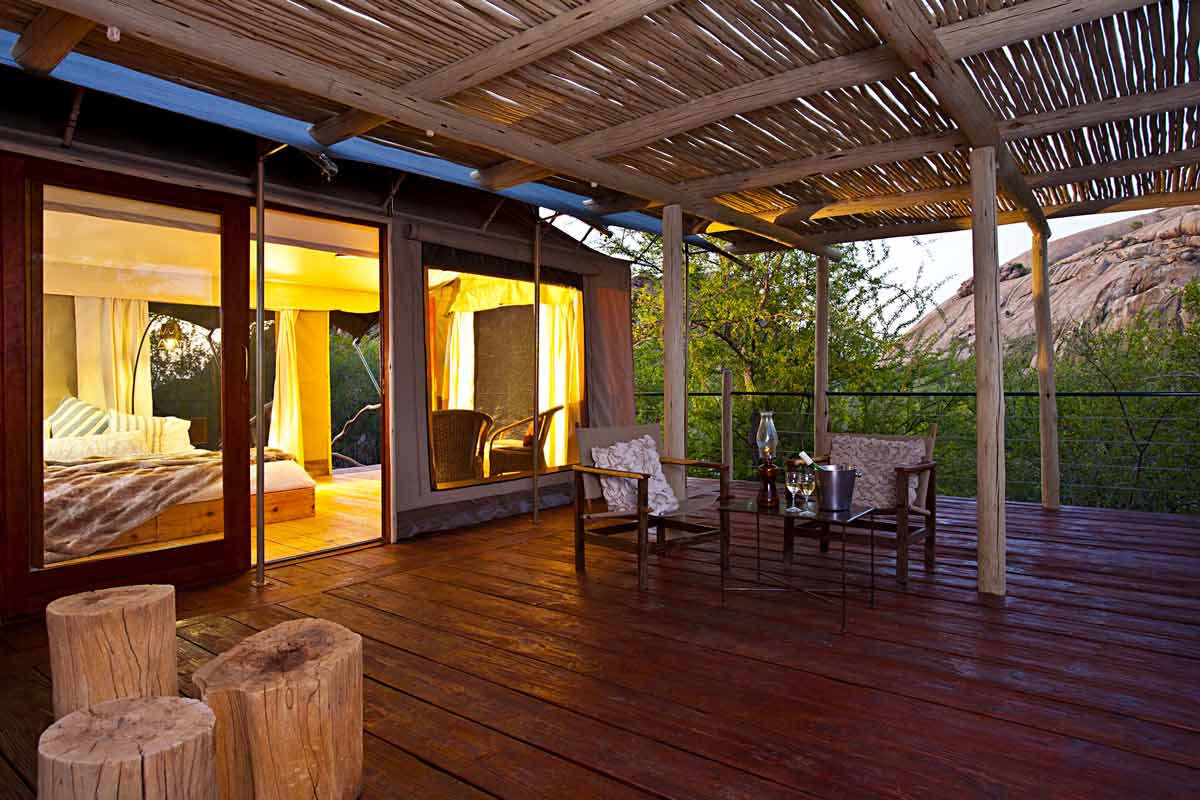 Les 10 tentes de l’ERONGO WILDERNESS LODGE se répartissent à flanc de colline et sont entourées de gros blocs de granit. Elles sont reliées par des pontons en bois et des escaliers taillés dans la pierre et sont sur pilotis. D’un bon confort, et d’une décoration soignée, elles offrent une belle vue. Elles ont été agrandies et rénovées début 2013.