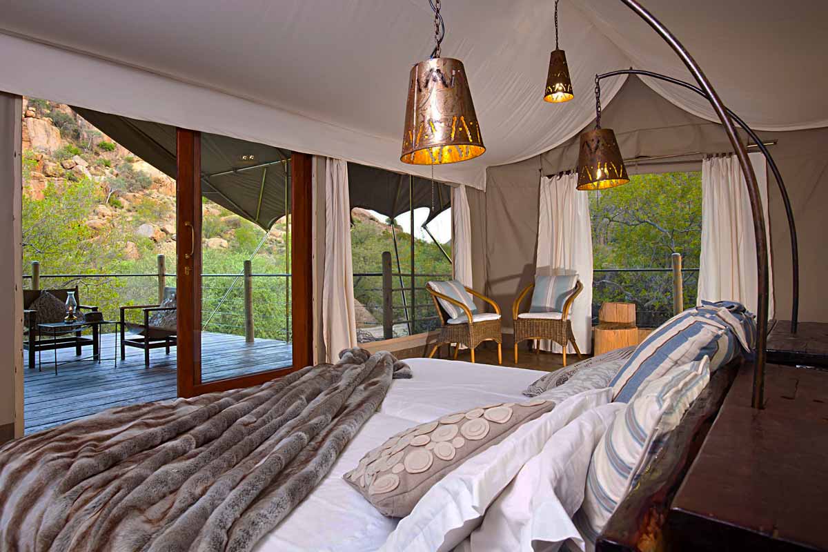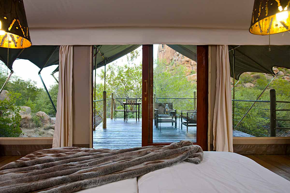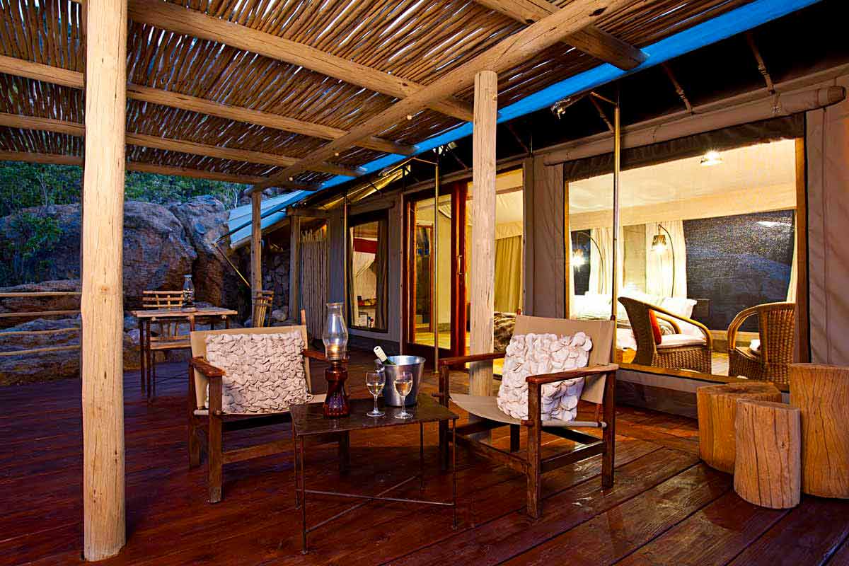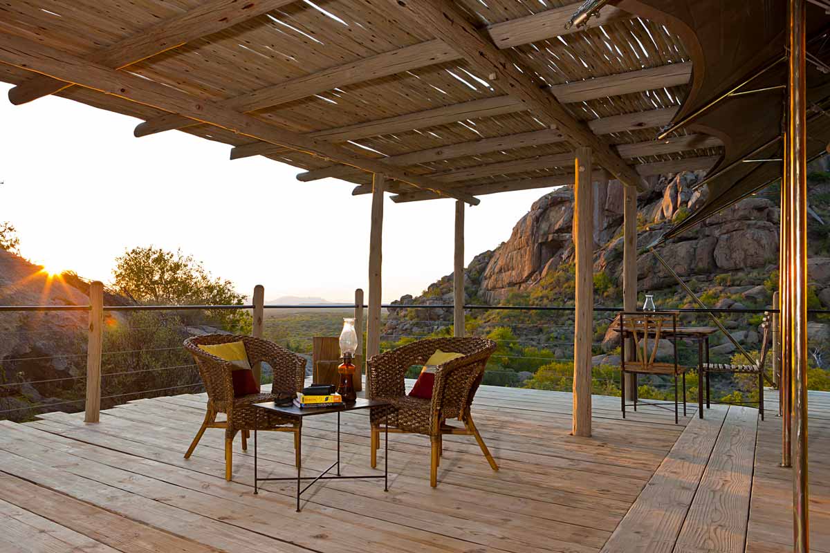 Les 10 tentes de l’ERONGO WILDERNESS LODGE se répartissent à flanc de colline et sont entourées de gros blocs de granit. Elles sont reliées par des pontons en bois et des escaliers taillés dans la pierre et sont sur pilotis. D’un bon confort, et d’une décoration soignée, elles offrent une belle vue. Elles ont été agrandies et rénovées début 2013.