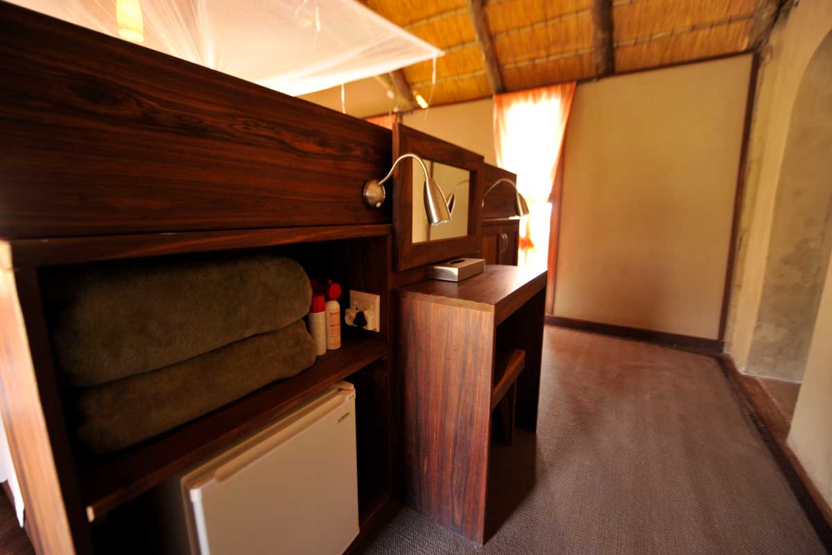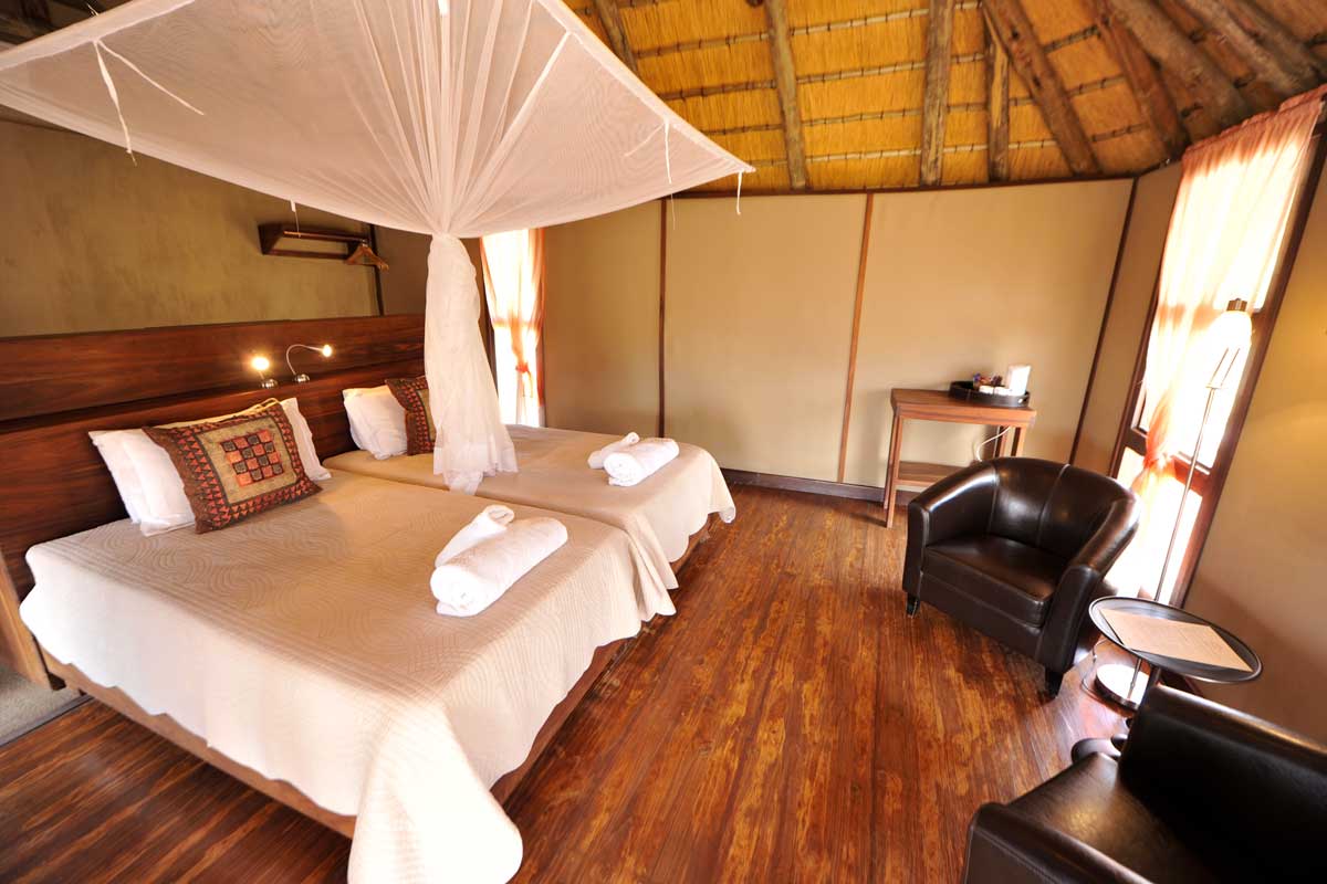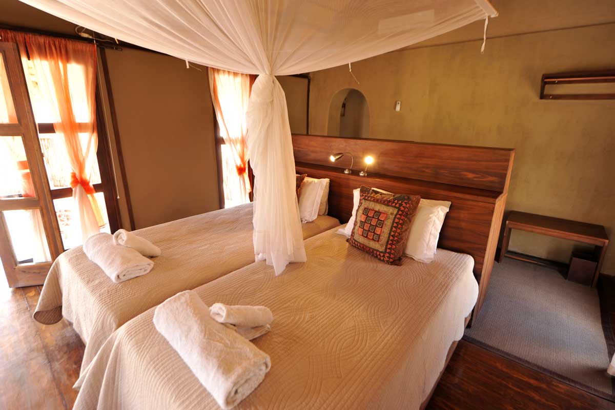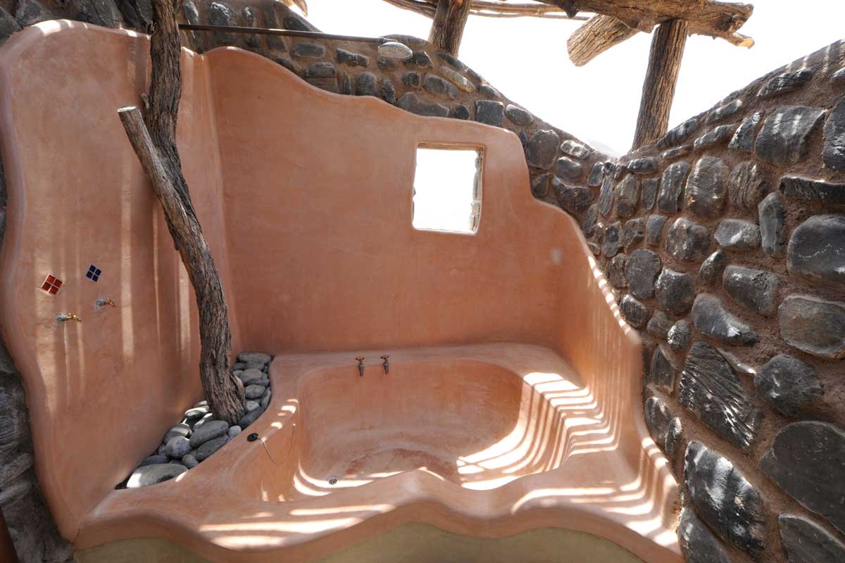 Les 12 chambres du HOODIA DESERT LODGE se répartissent de part et d’autre des parties communes. Elles offrent un bon niveau de confort : terrasse avec fauteuils, coin salon à l’intérieur avec fauteuils, climatisation, salle de bains avec double-vasques, douche intérieure et extérieure et même une baignoire extérieure…