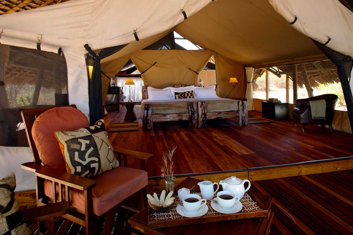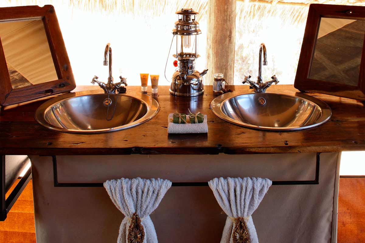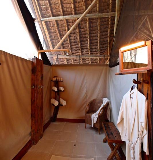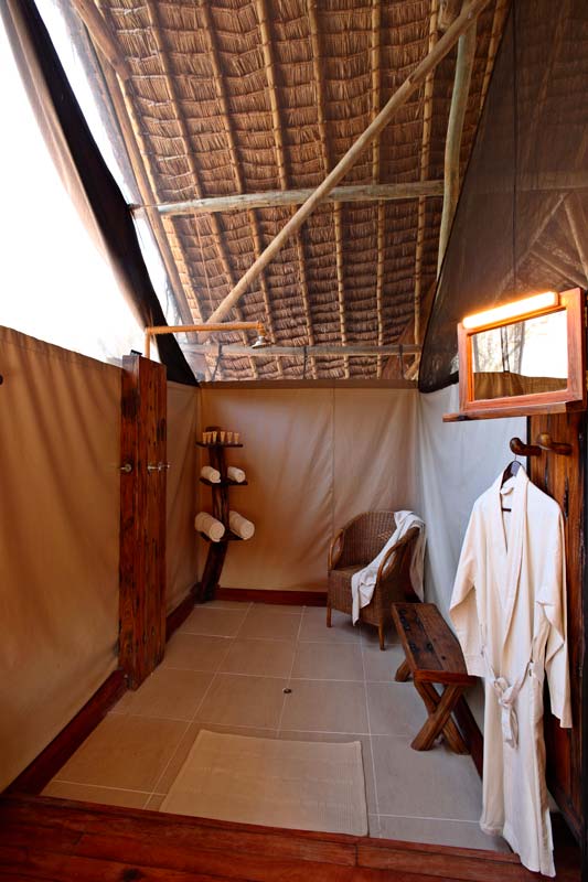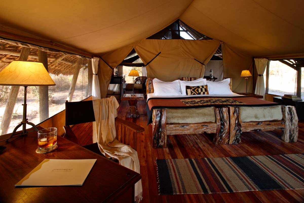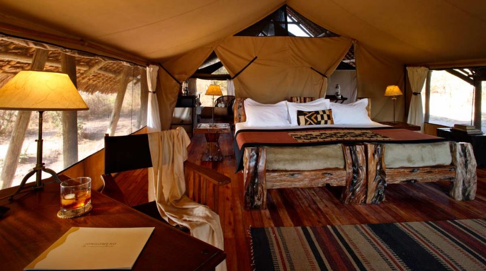 Les 8 tentes du JONGOMERO sont vastes et très confortables : véranda avec lit de repos et chaises longues, plancher en bois ciré, fauteuil en cuir, bureau, salle de bains avec 2 vasques, douche avec eau chaude…Elles sont espacées les unes des autres (de 30 à 40 m en moyenne).