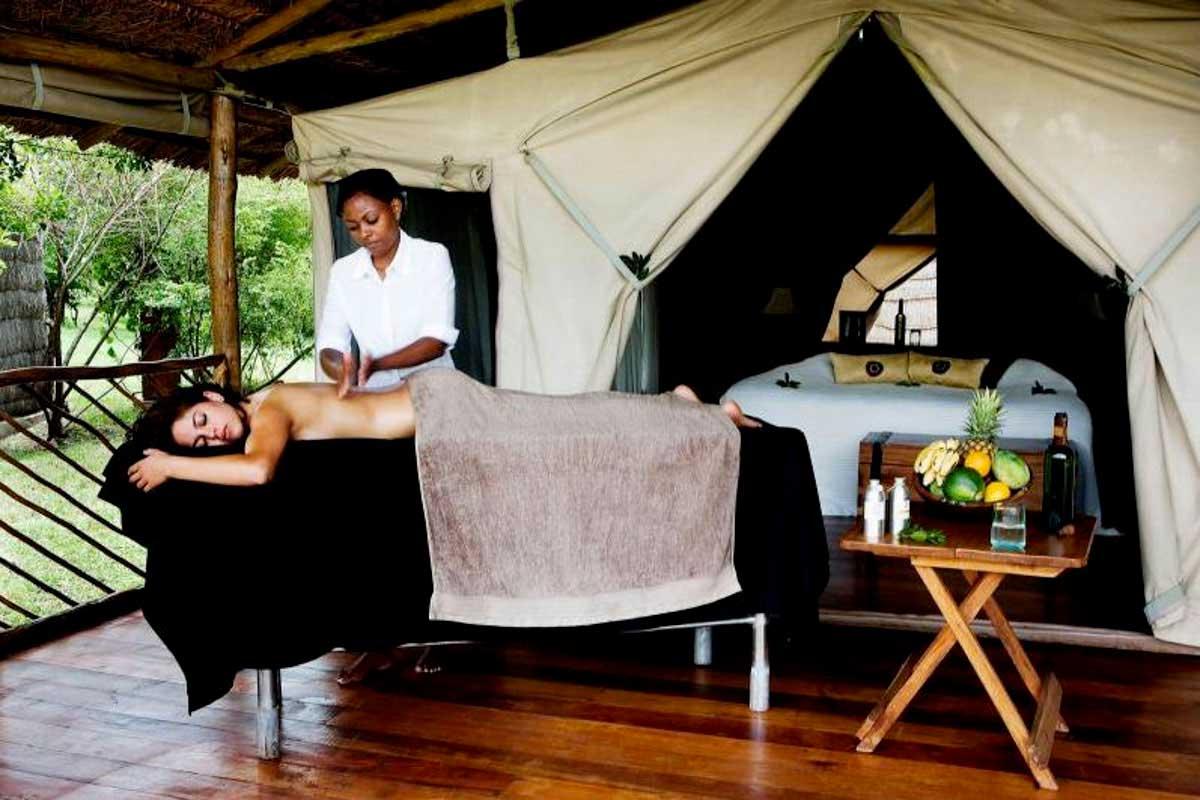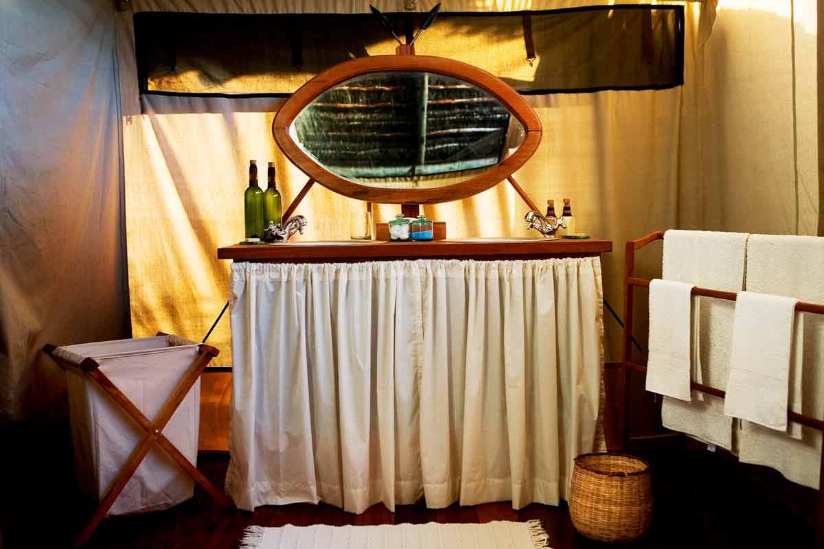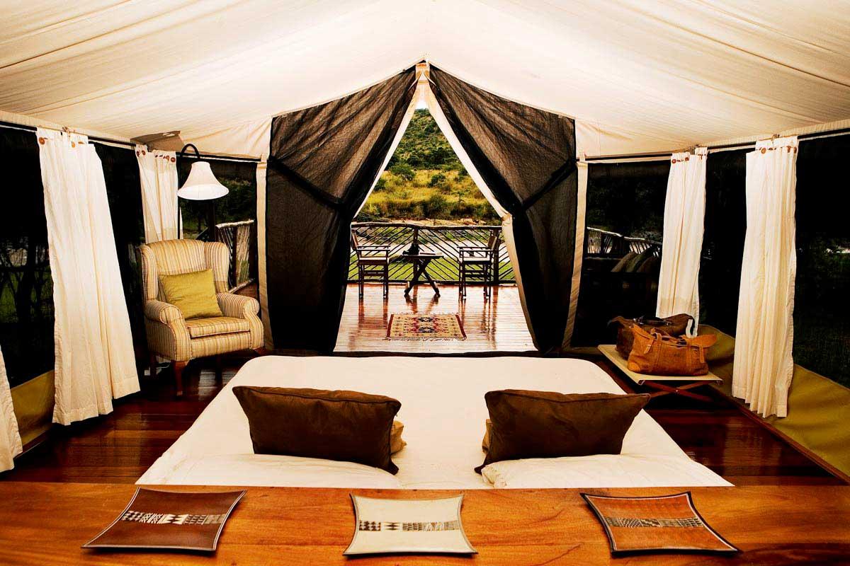 Les 22 tentes du KAREN BLIXEN CAMP se dressent également sur des plateformes en bois. Leur confort est très appréciable : grande terrasse (avec lit de repos, fauteuils et petite table), fauteuil, minibar, belle salle de bains avec douche extérieure…