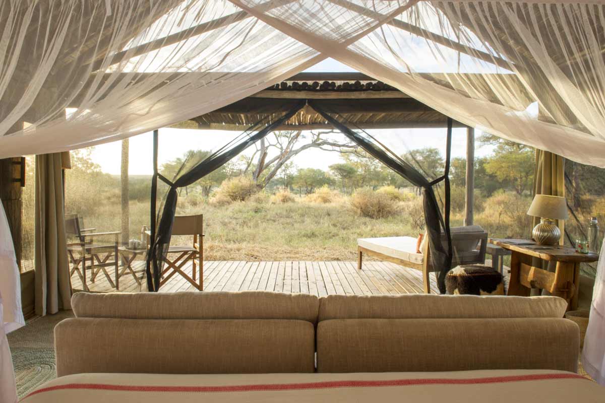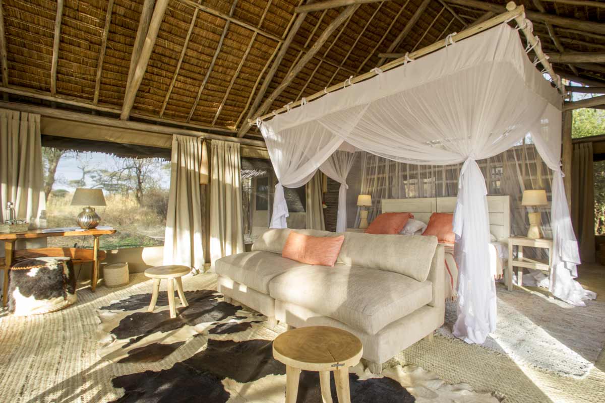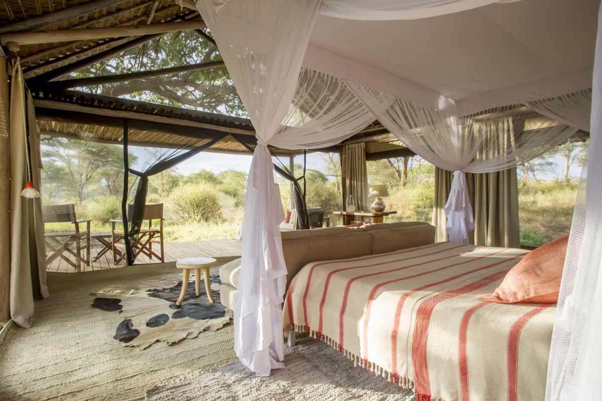 Les 6 tentes du Kuro Tarangire se dressent à l’ombre d’acacias. Elles offrent un très bon confort : belle terrasse, lit à baldaquin, canapé, coin bureau, dressing, salle de bains avec douche et douche extérieure. De beaux tapis complètent cet ensemble harmonieux.