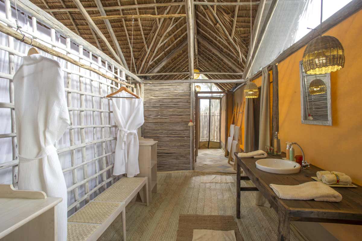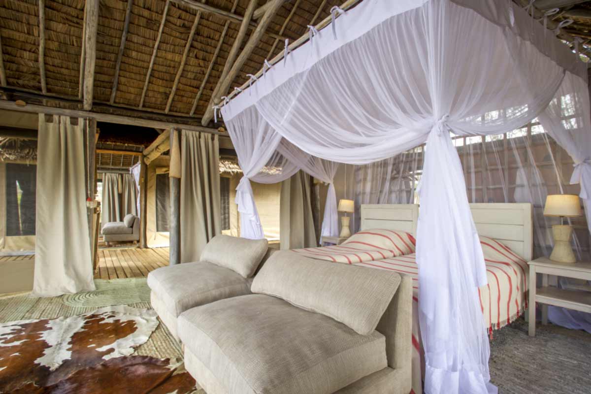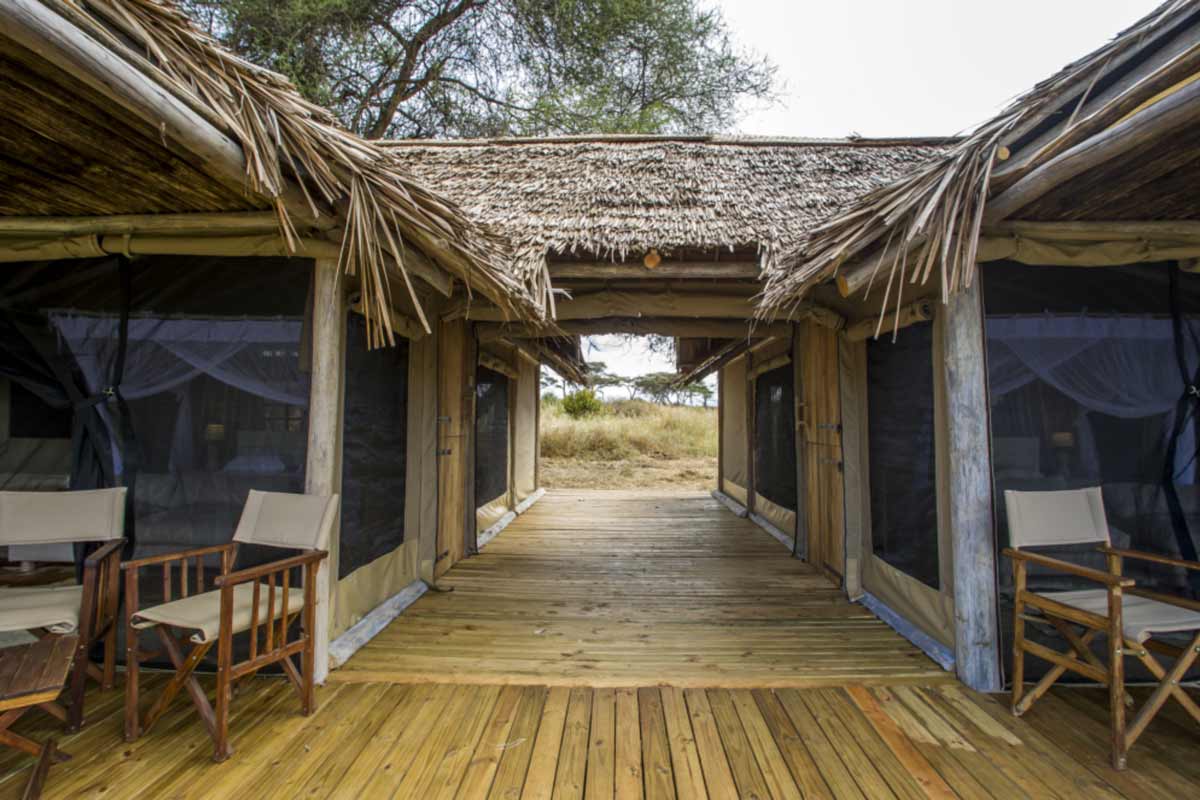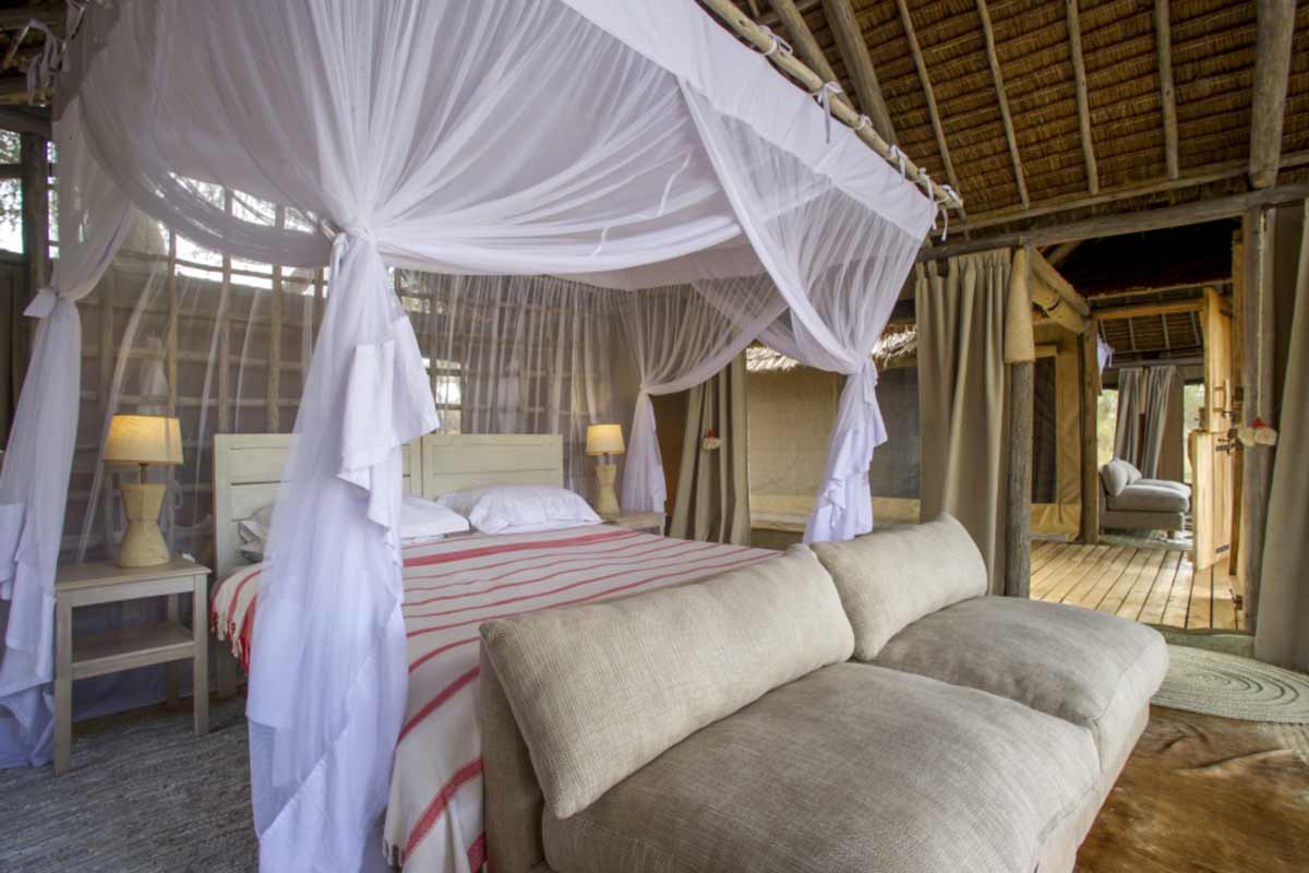 Les 6 tentes du Kuro Tarangire se dressent à l’ombre d’acacias. Elles offrent un très bon confort : belle terrasse, lit à baldaquin, canapé, coin bureau, dressing, salle de bains avec douche et douche extérieure. De beaux tapis complètent cet ensemble harmonieux.