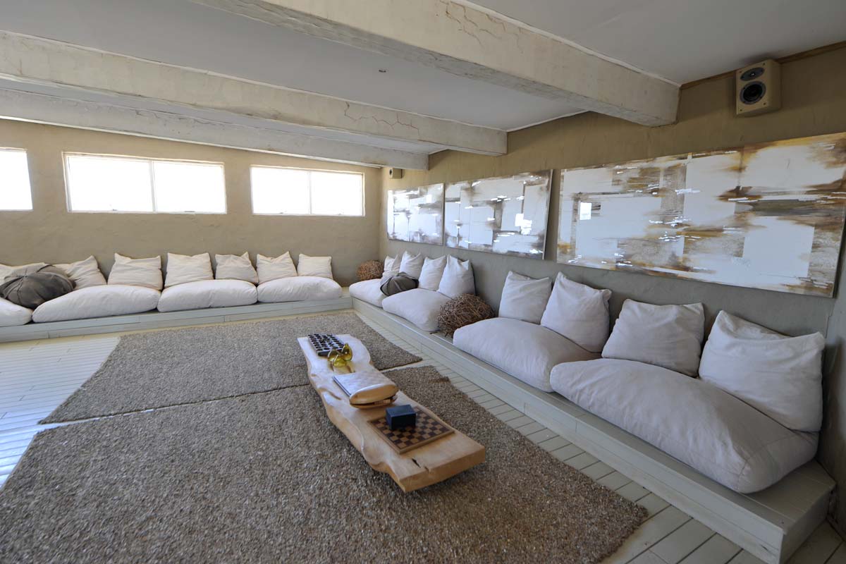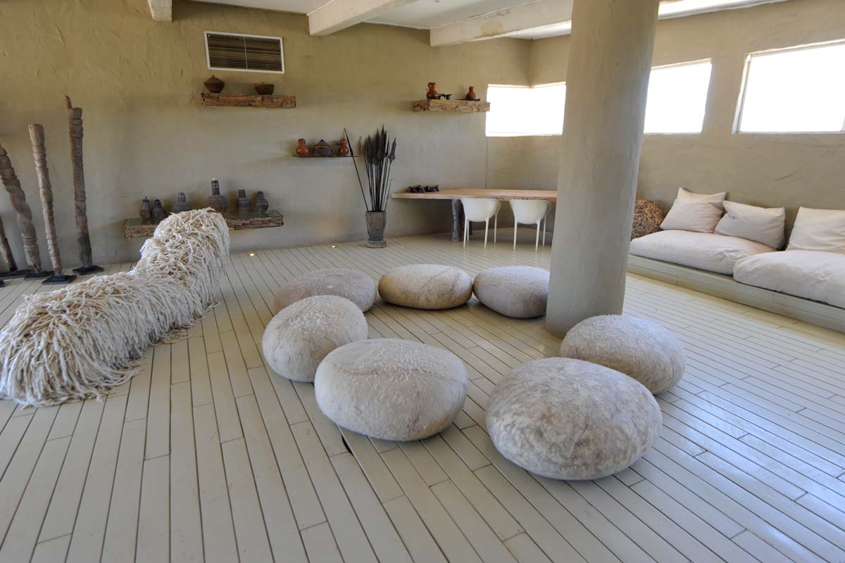 Ses vastes parties communes font écho à la lumière du désert. Aucune couleur vive ne vient accrocher le regard. La décoration moderne et sobre s’harmonise parfaitement avec l’environnement minéral.