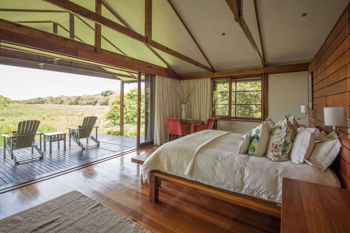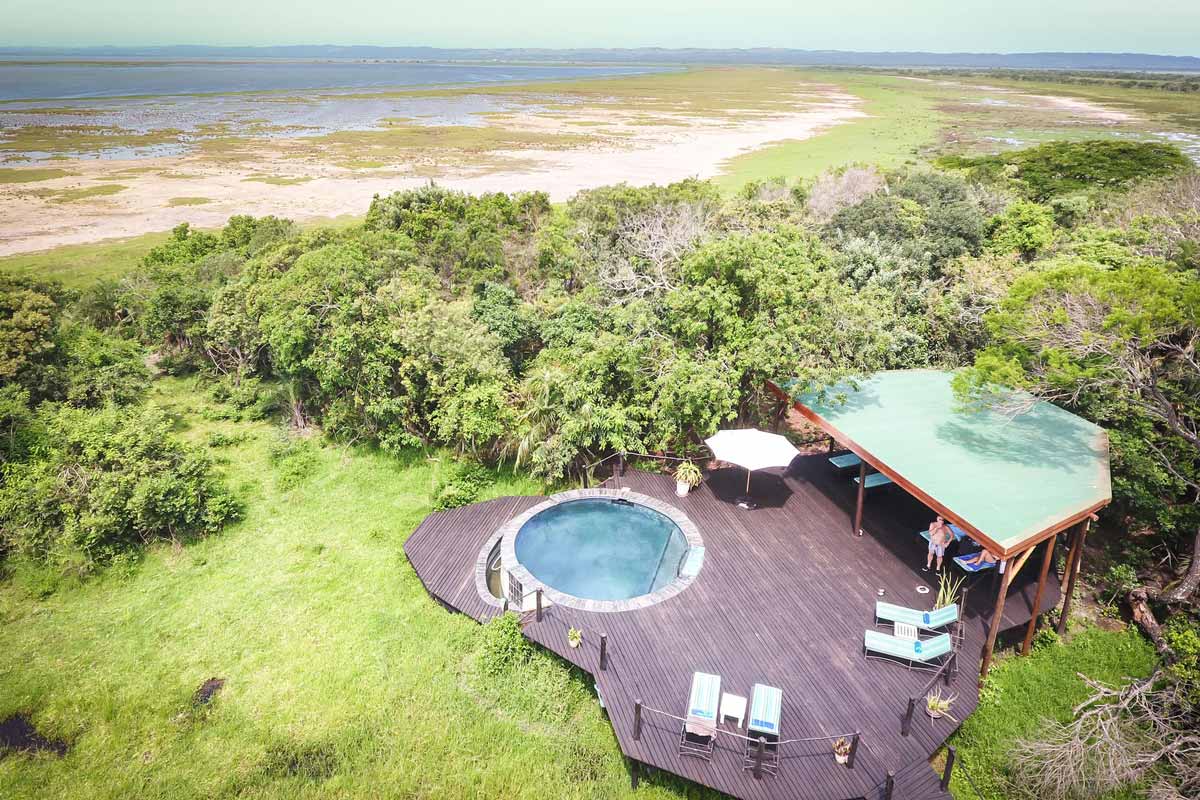 MAKAKATANA BAY LODGE, se trouve aux abords du lac de Sainte Lucie (35 000 hectares), au sein de la réserve naturelle d’iSimangaliso. Cet endroit protégé est principalement habité par des pêcheurs. Le lieu est préservé et offre des sites uniques avec de longues plages sauvages et des réserves où se côtoient zèbres, girafes, buffles et éléphants. Le lodge est à environ 1h20 de route de l’aéroport de Richard’s Bay. Il s’agit d’un hébergement de petite capacité de 6 suites uniquement. Les suites sont grandes et dotées de belles terrasses avec une vue infinie sur la nature.