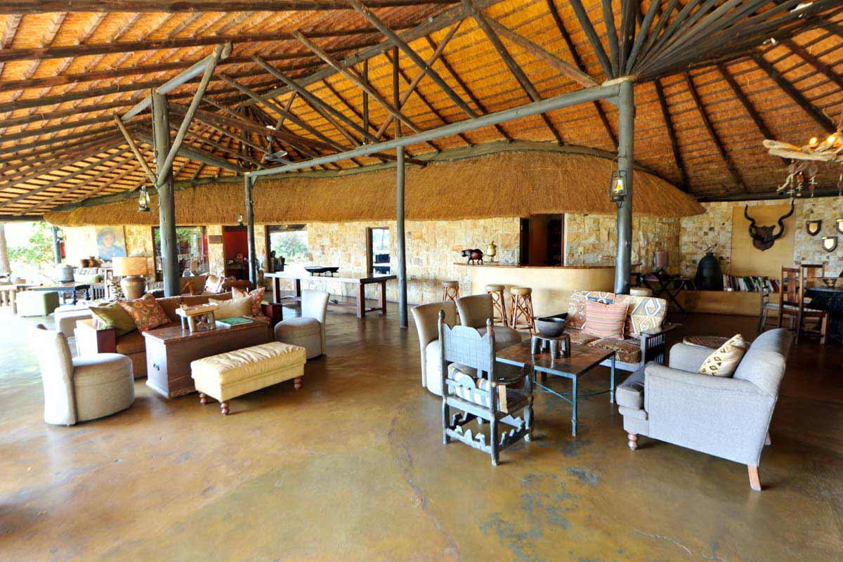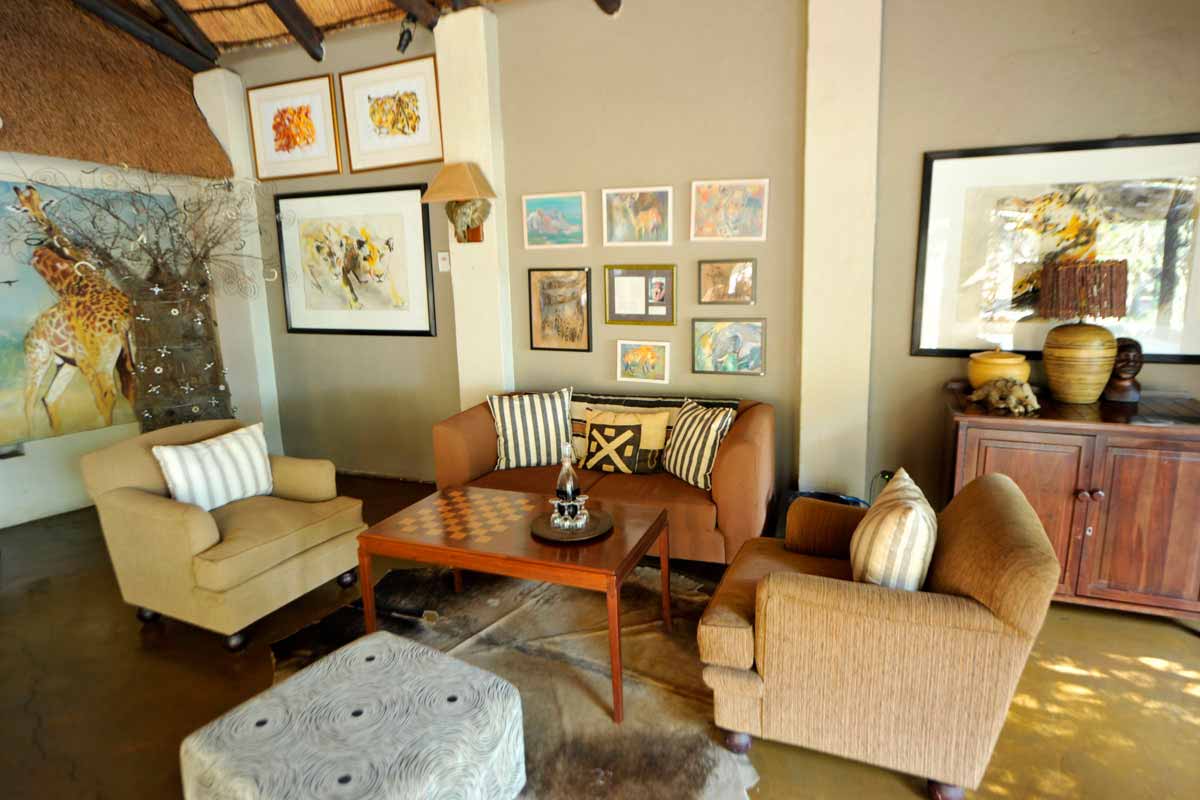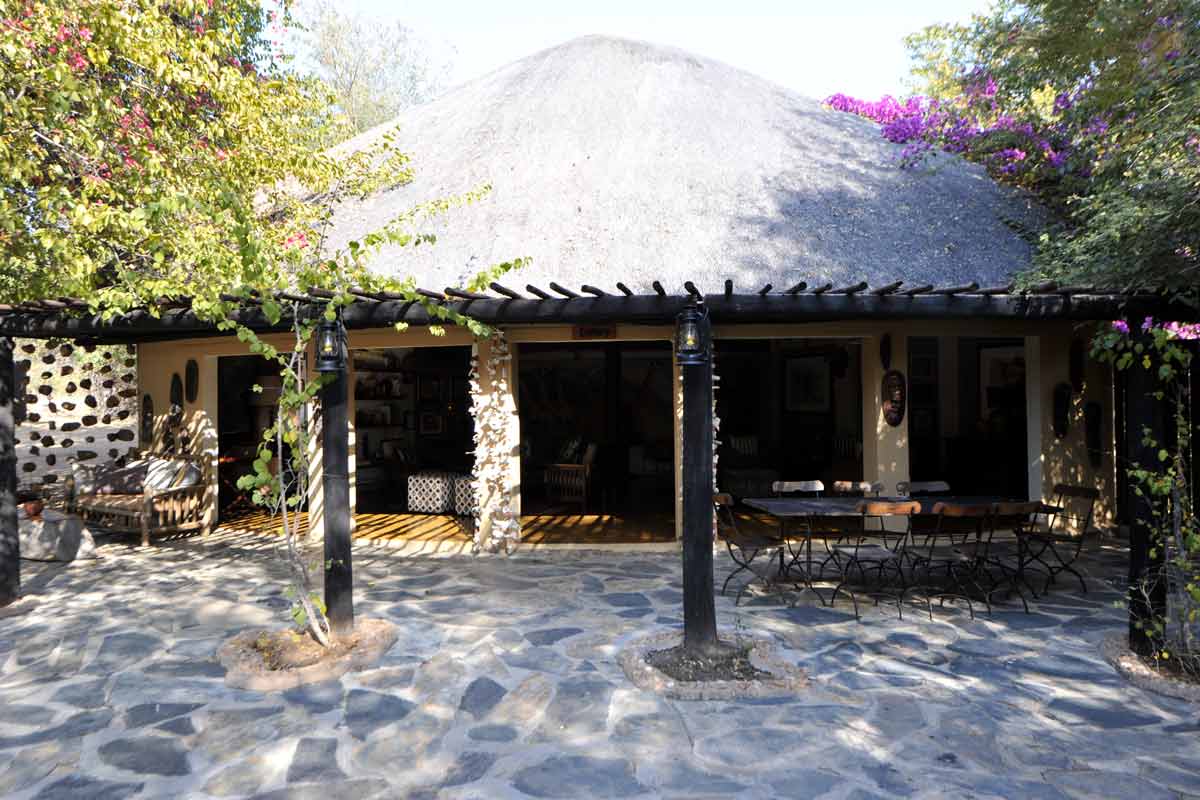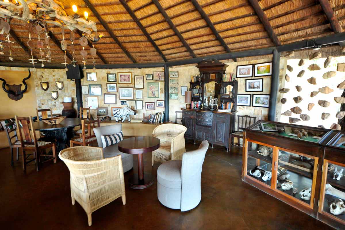 Les parties communes de MOTSWARI se répartissent dans 3 bâtiments aux toits de chaume. Ouverts sur l’extérieur, ils offrent une vue agréable sur le lit d’une petite rivière et un point d’eau. Leur décoration éclectique est fort sympathique.