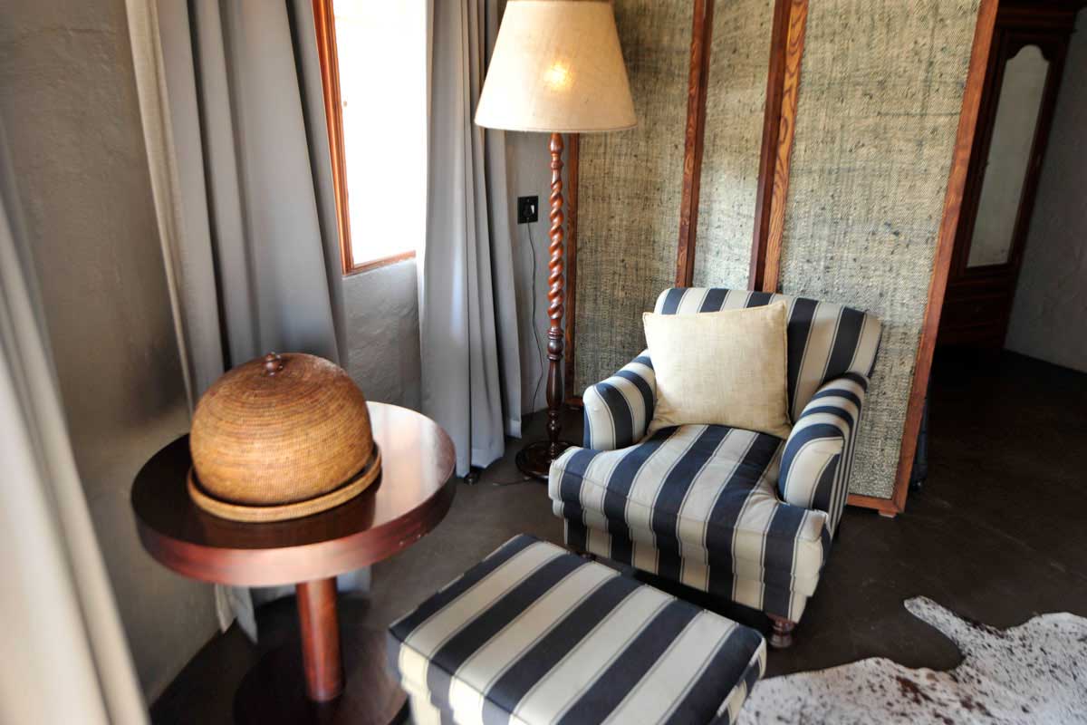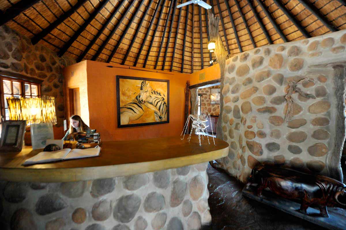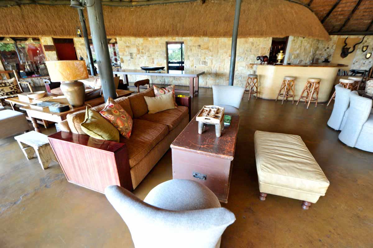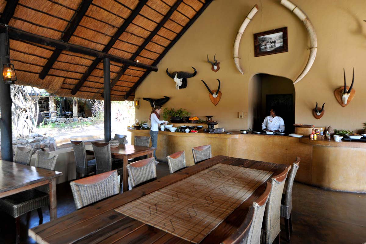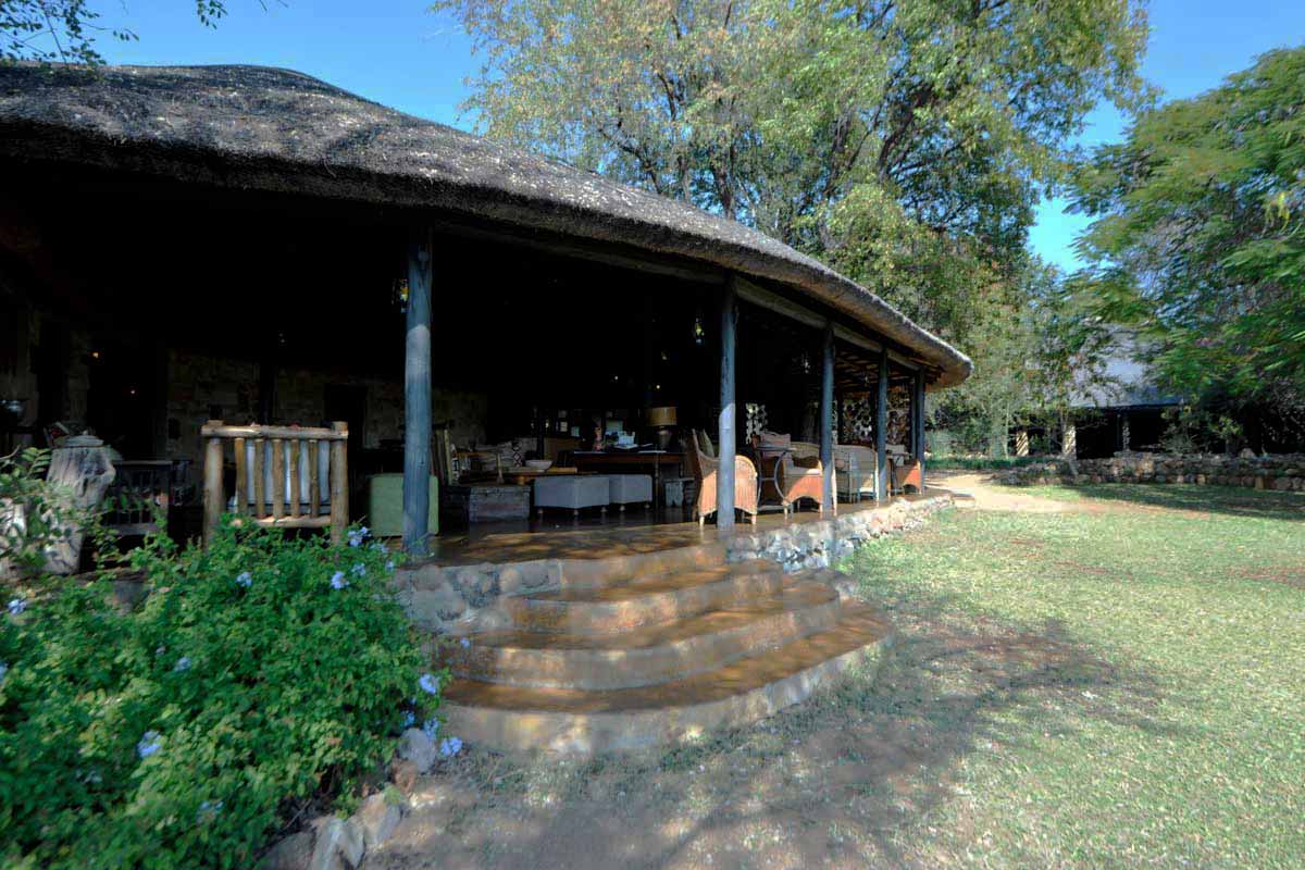 Les parties communes de MOTSWARI se répartissent dans 3 bâtiments aux toits de chaume. Ouverts sur l’extérieur, ils offrent une vue agréable sur le lit d’une petite rivière et un point d’eau. Leur décoration éclectique est fort sympathique.