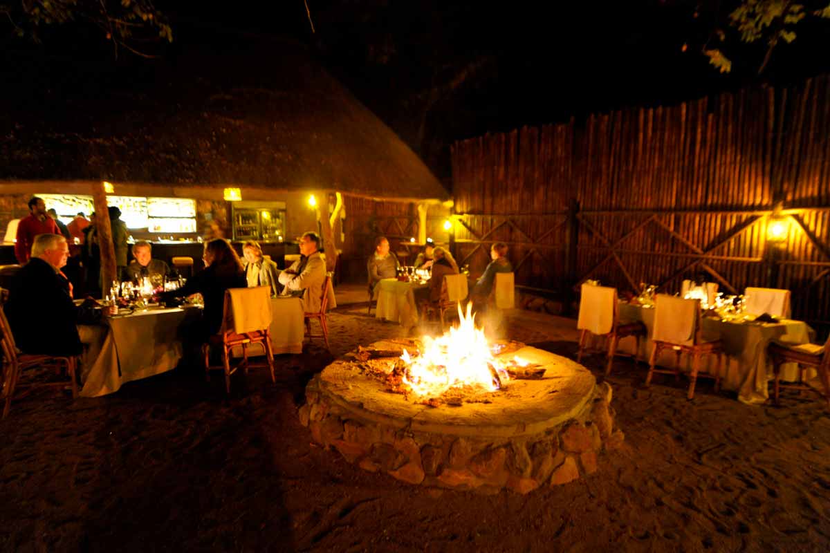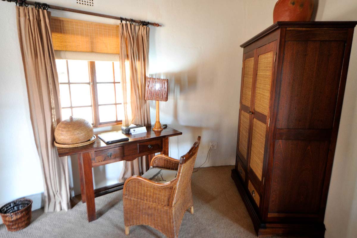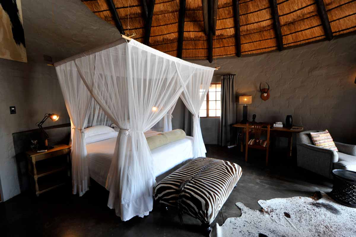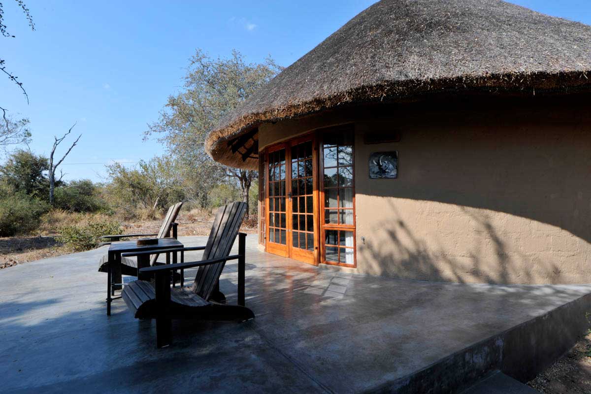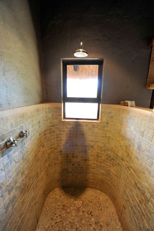 Les parties communes de MOTSWARI se répartissent dans 3 bâtiments aux toits de chaume. Ouverts sur l’extérieur, ils offrent une vue agréable sur le lit d’une petite rivière et un point d’eau. Leur décoration éclectique est fort sympathique.