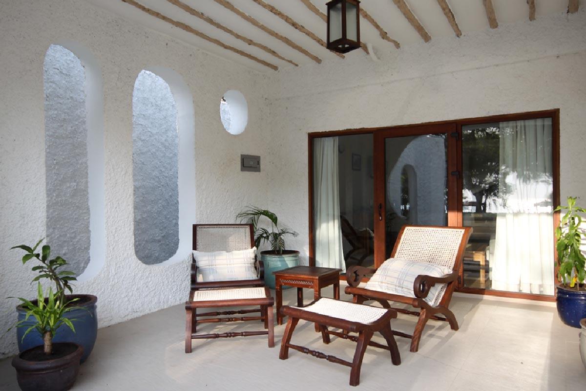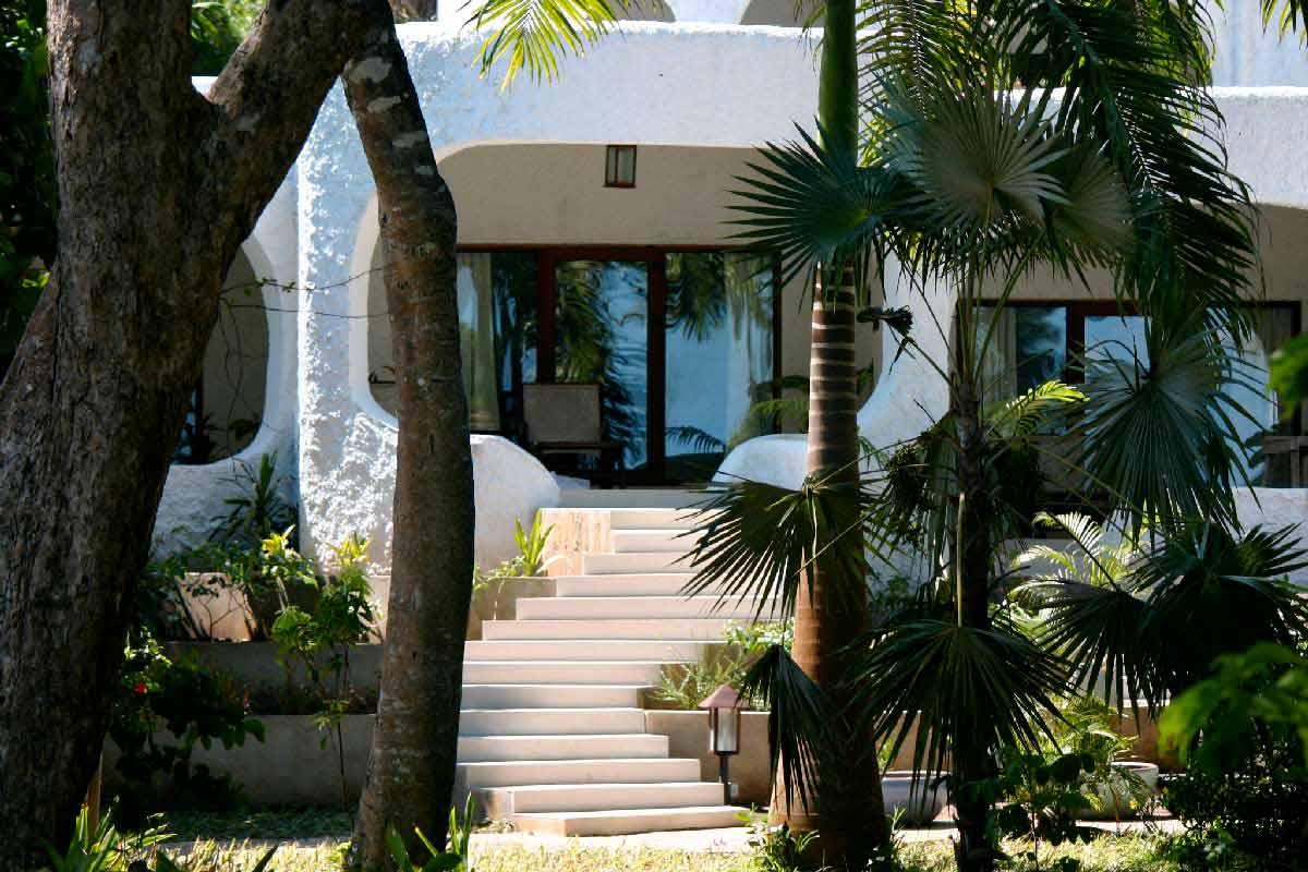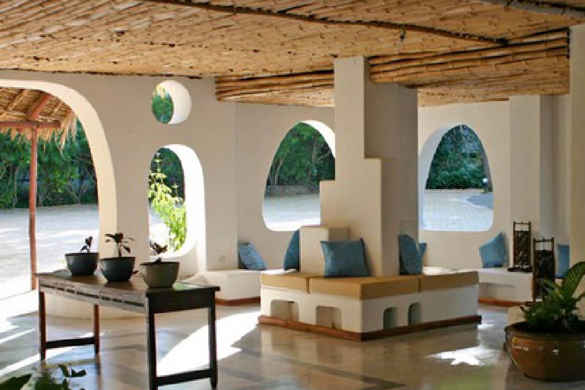L’hôtel surplombe légèrement les eaux turquoise de l’océan indien, face à une plage au sable blanc merveilleux. A marée basse toutefois (comme partout le long de la côte), la baignade n’est pas possible, l’eau se retirant au-delà de la barrière de corail.