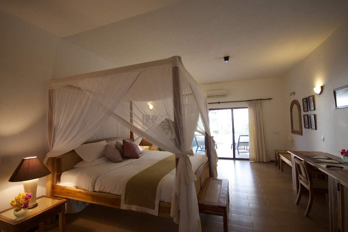 Les chambres « standard » se situent au rez-de-chaussée et partagent parfois une terrasse (2 chambres dans un bungalow avec terrasse commune), une disposition appréciée par les familles. D’une taille confortable mais sans excès (22 m² environ), elles offrent un bon niveau de confort : climatisation, moustiquaire, salle de bains avec douche et toilettes, sèche-cheveux…