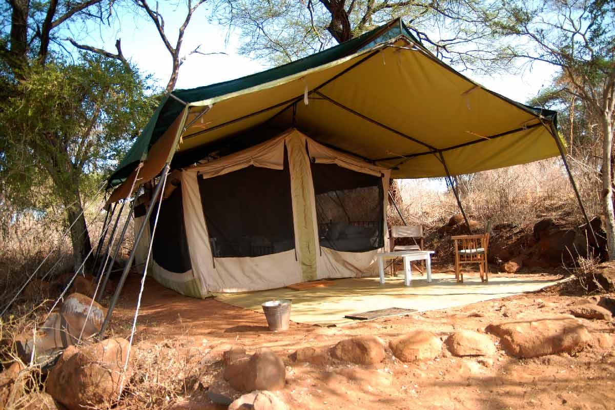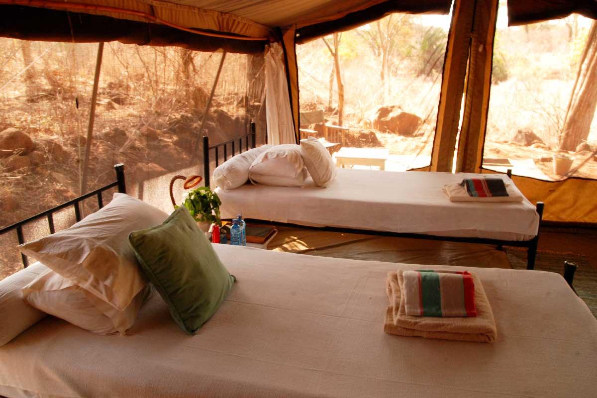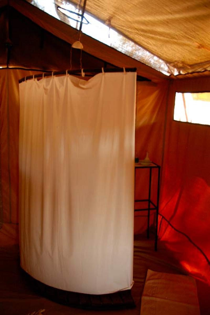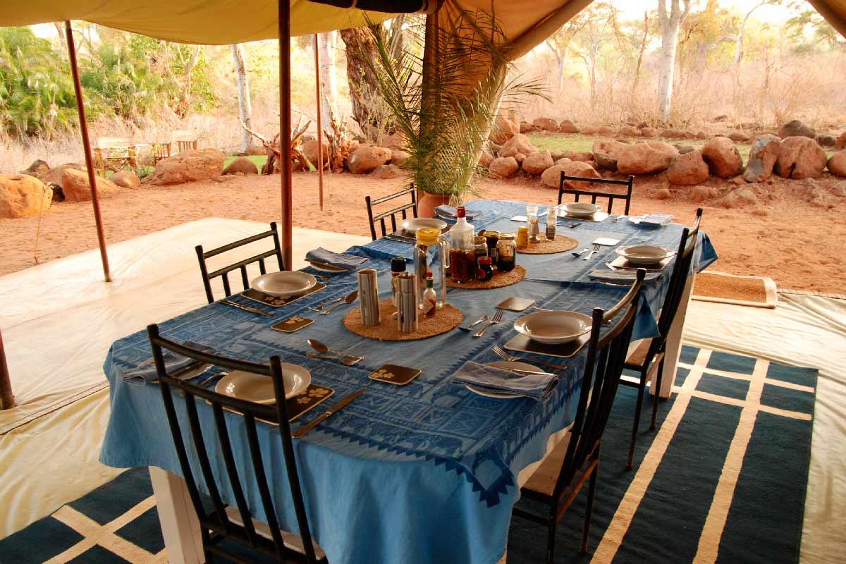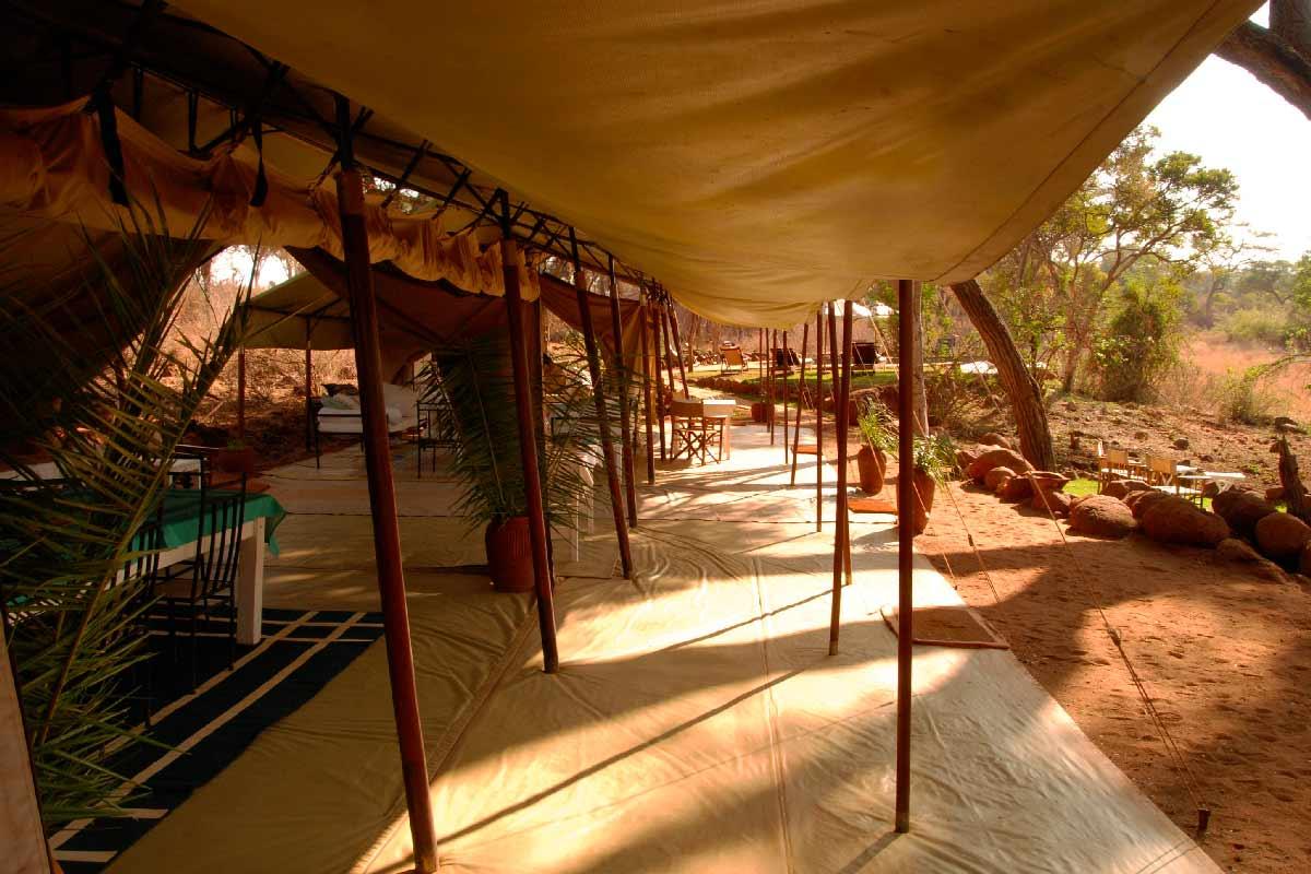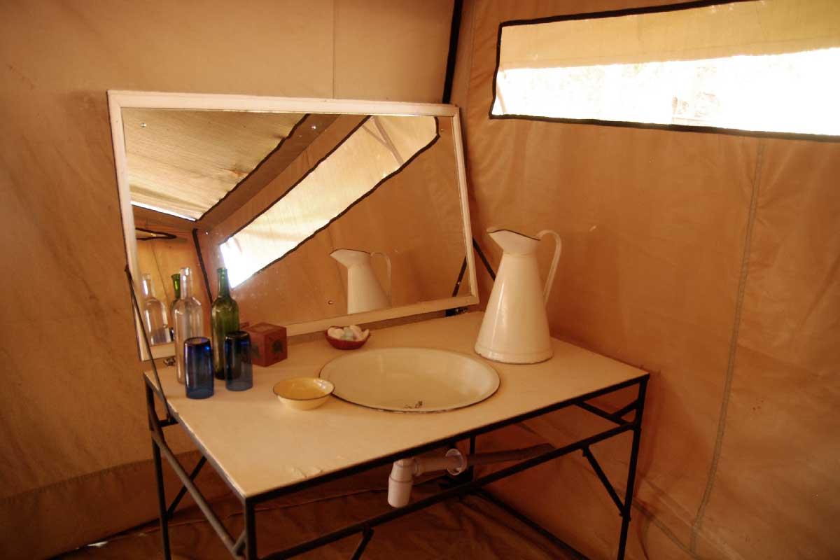 Il s’agit d’un petit camp de 6 tentes uniquement (3 tentes doubles et 3 tentes twins). Elles offrent tout le confort imaginable dans une région aussi reculée et des salles de bains équipées (toilettes avec eau courante, lavabo avec cruche à eau, douche de brousse avec sac d’eau chaude rempli chaque soir). Elles se répartissent de part et d’autre des « mess tents », à l’ombre des arbres qui borde le lit (souvent asséché) d’une rivière.