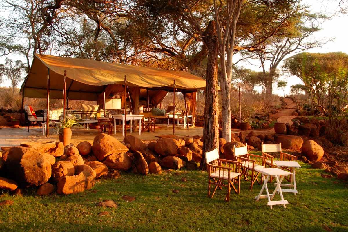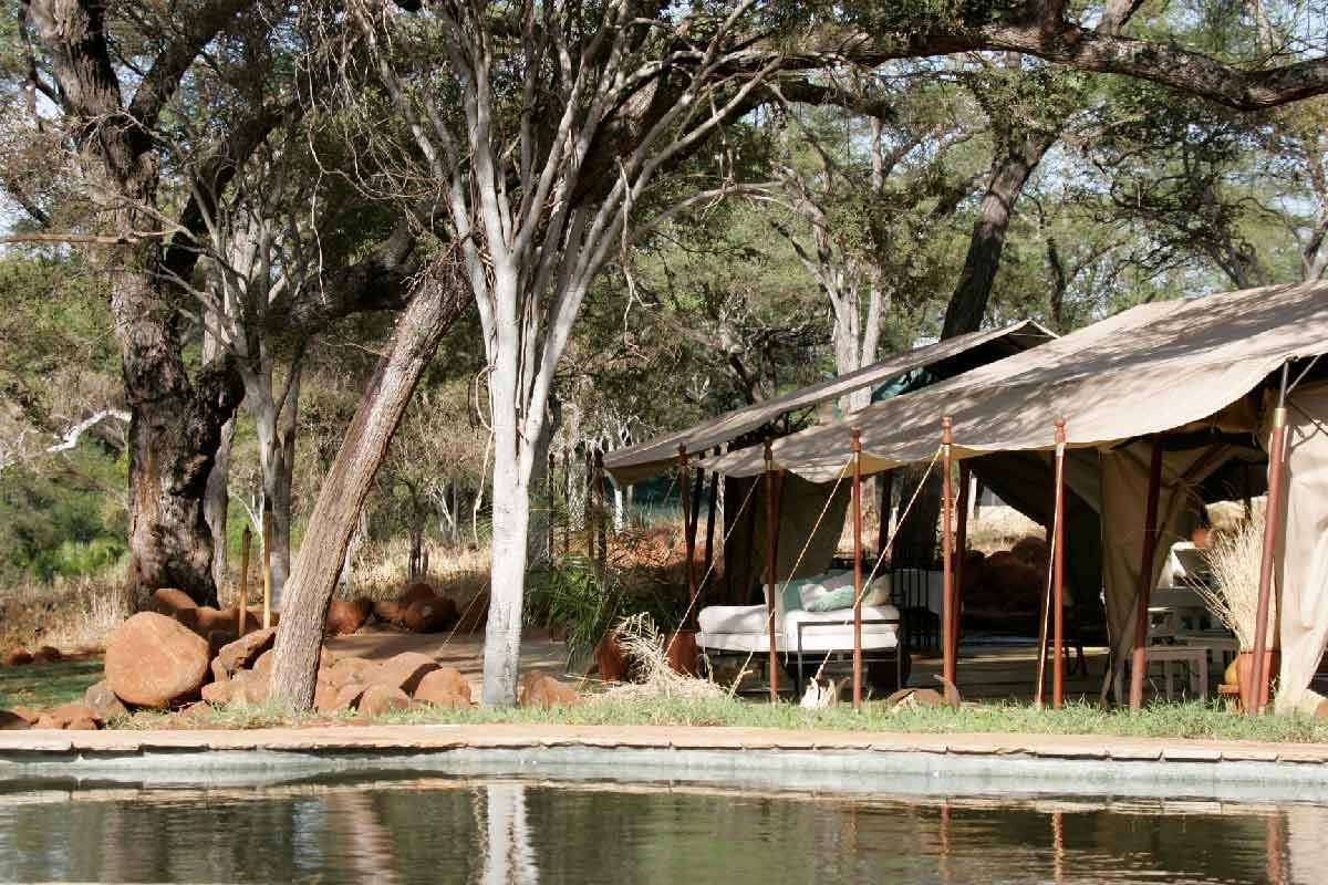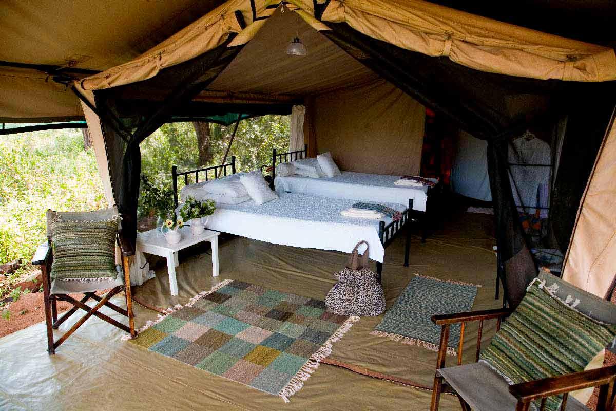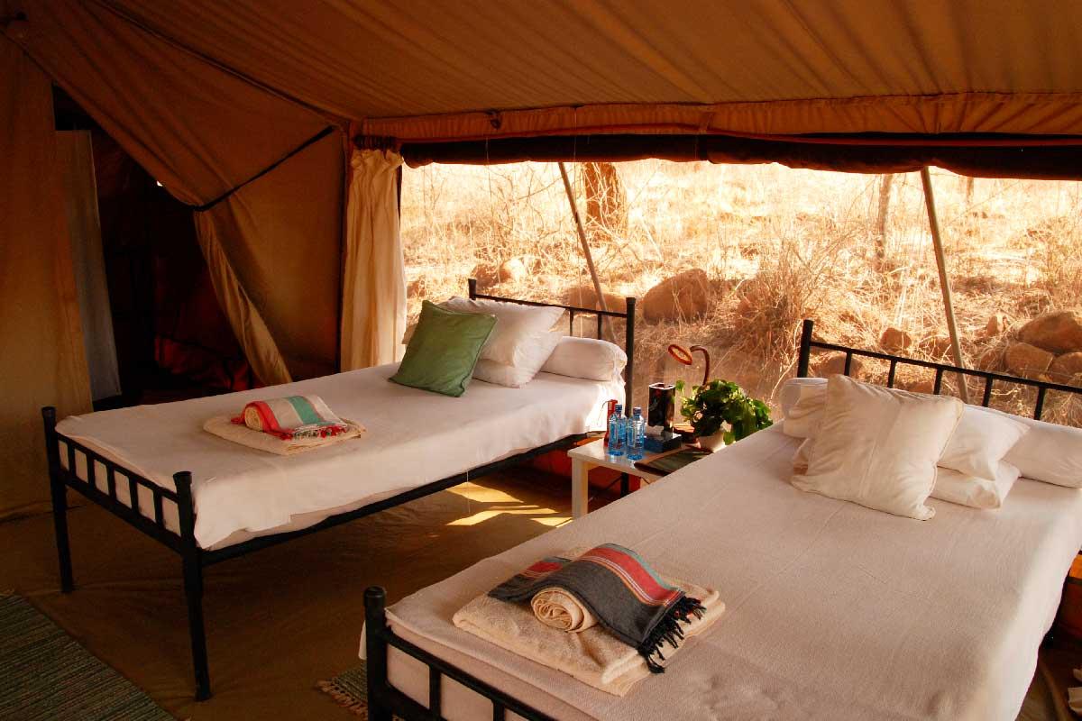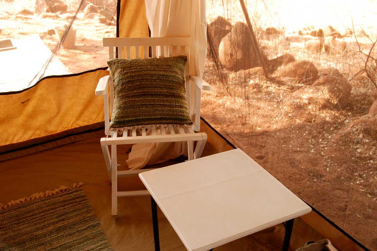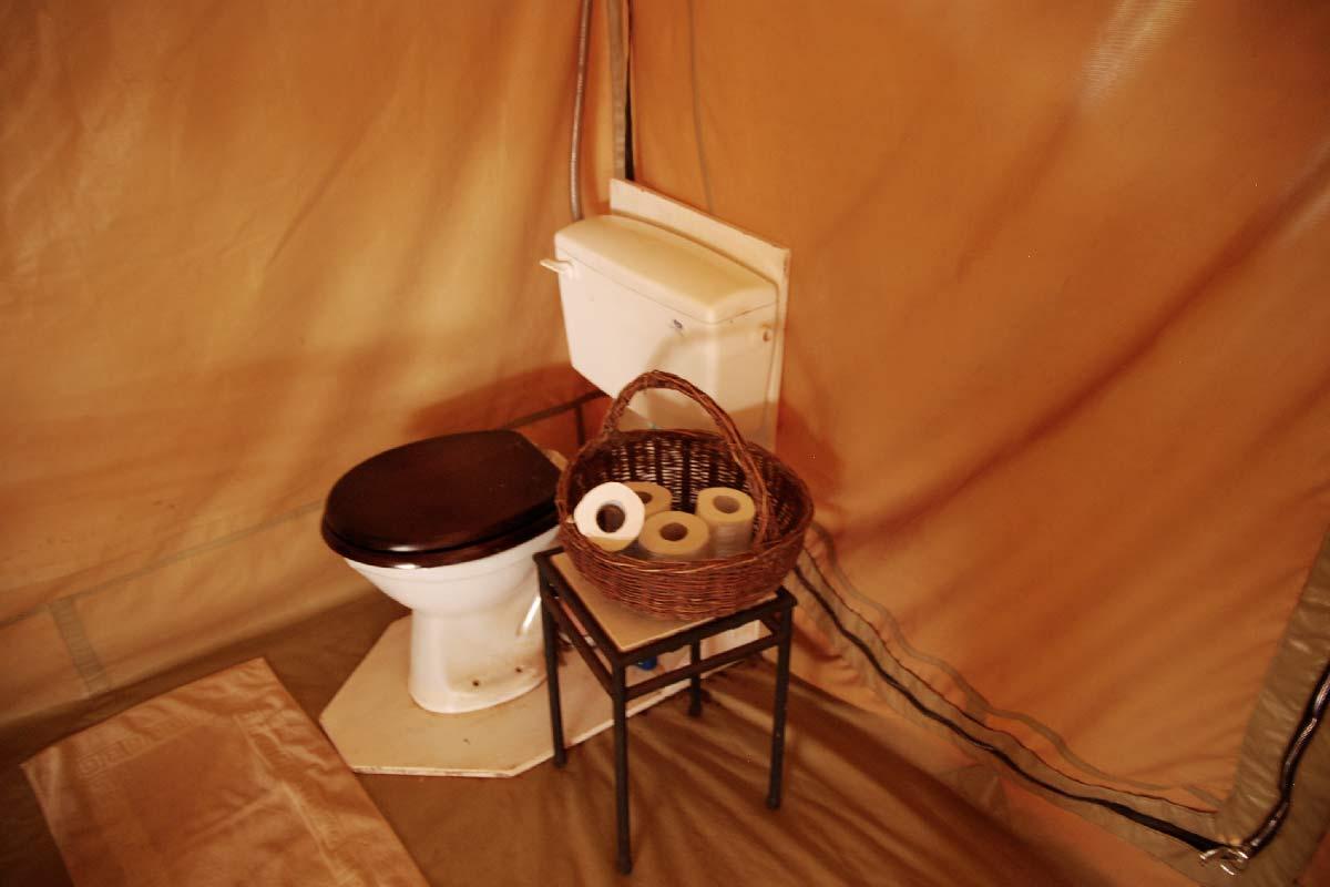 Il s’agit d’un petit camp de 6 tentes uniquement (3 tentes doubles et 3 tentes twins). Elles offrent tout le confort imaginable dans une région aussi reculée et des salles de bains équipées (toilettes avec eau courante, lavabo avec cruche à eau, douche de brousse avec sac d’eau chaude rempli chaque soir). Elles se répartissent de part et d’autre des « mess tents », à l’ombre des arbres qui borde le lit (souvent asséché) d’une rivière.