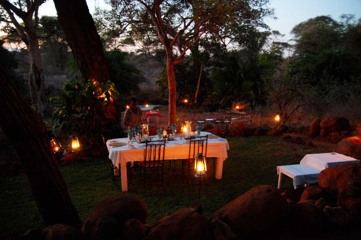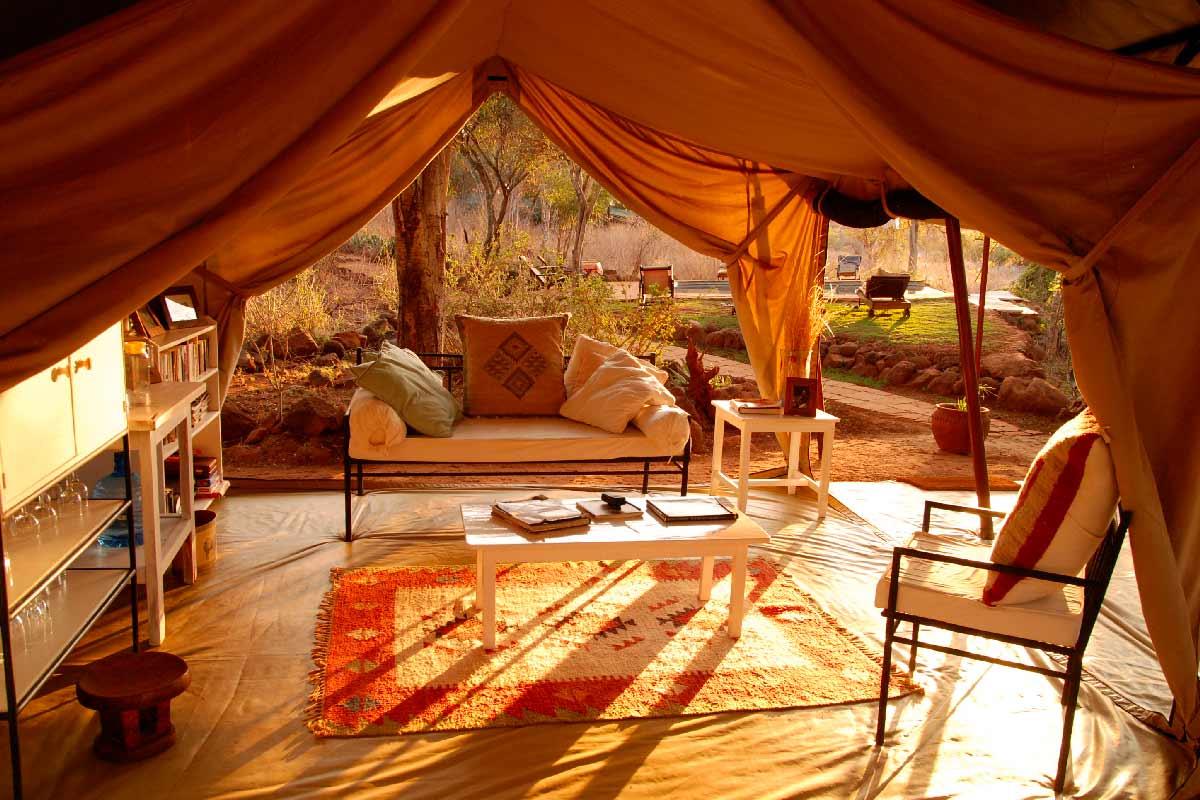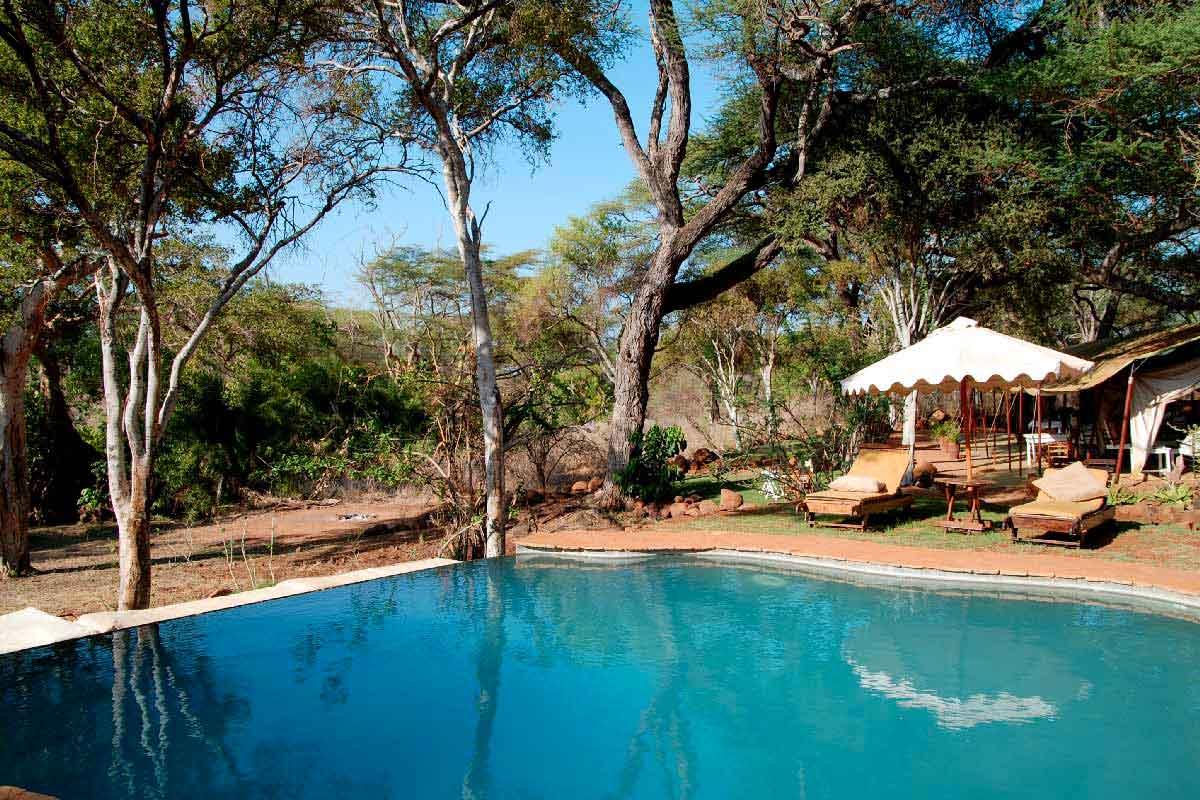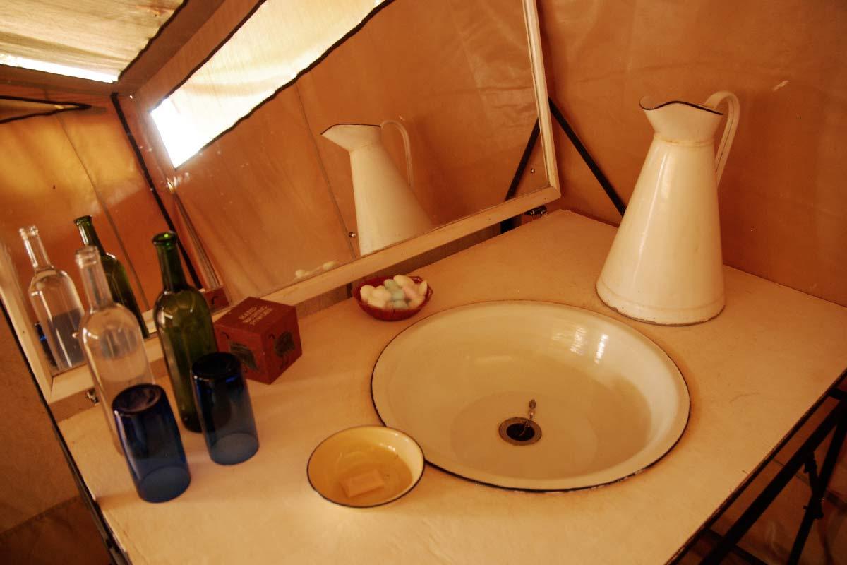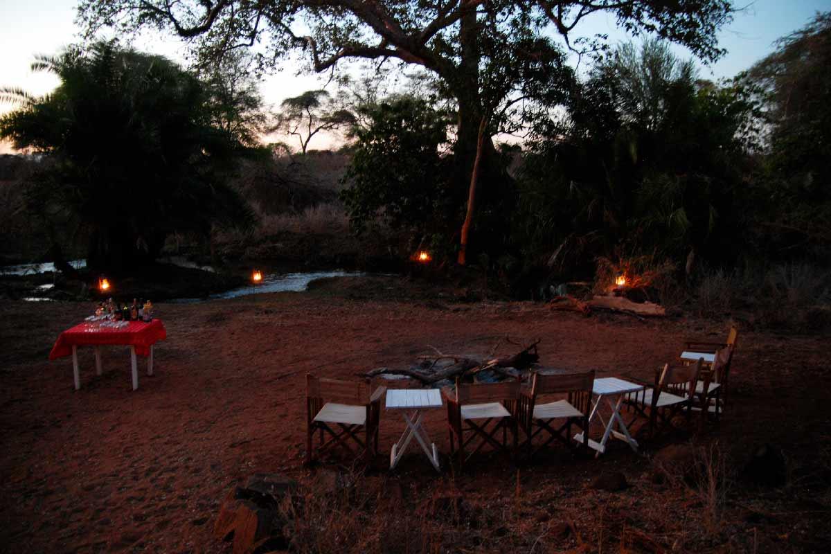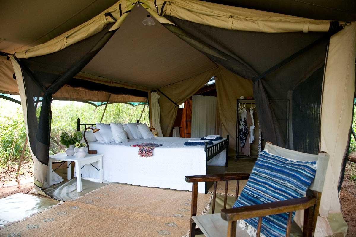 Il s’agit d’un petit camp de 6 tentes uniquement (3 tentes doubles et 3 tentes twins). Elles offrent tout le confort imaginable dans une région aussi reculée et des salles de bains équipées (toilettes avec eau courante, lavabo avec cruche à eau, douche de brousse avec sac d’eau chaude rempli chaque soir). Elles se répartissent de part et d’autre des « mess tents », à l’ombre des arbres qui borde le lit (souvent asséché) d’une rivière.