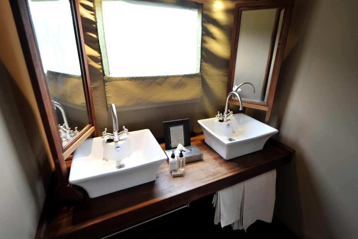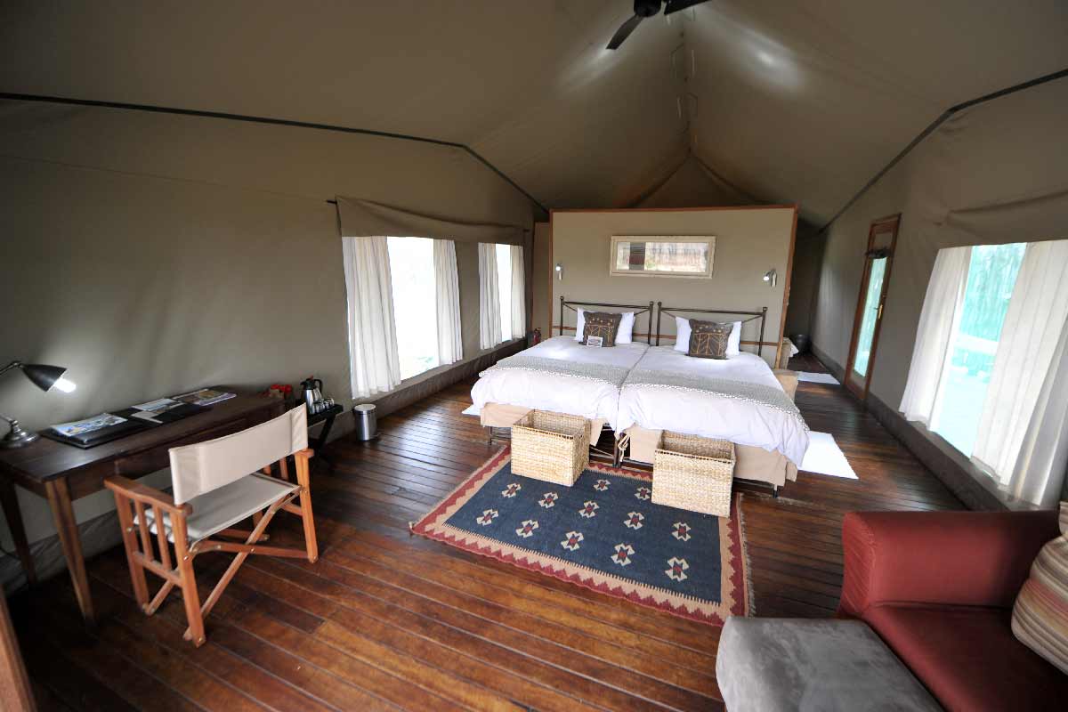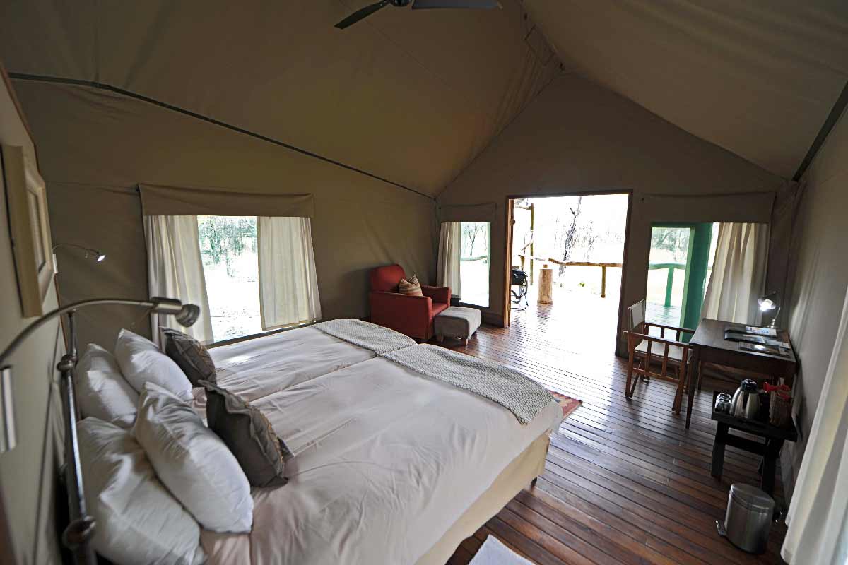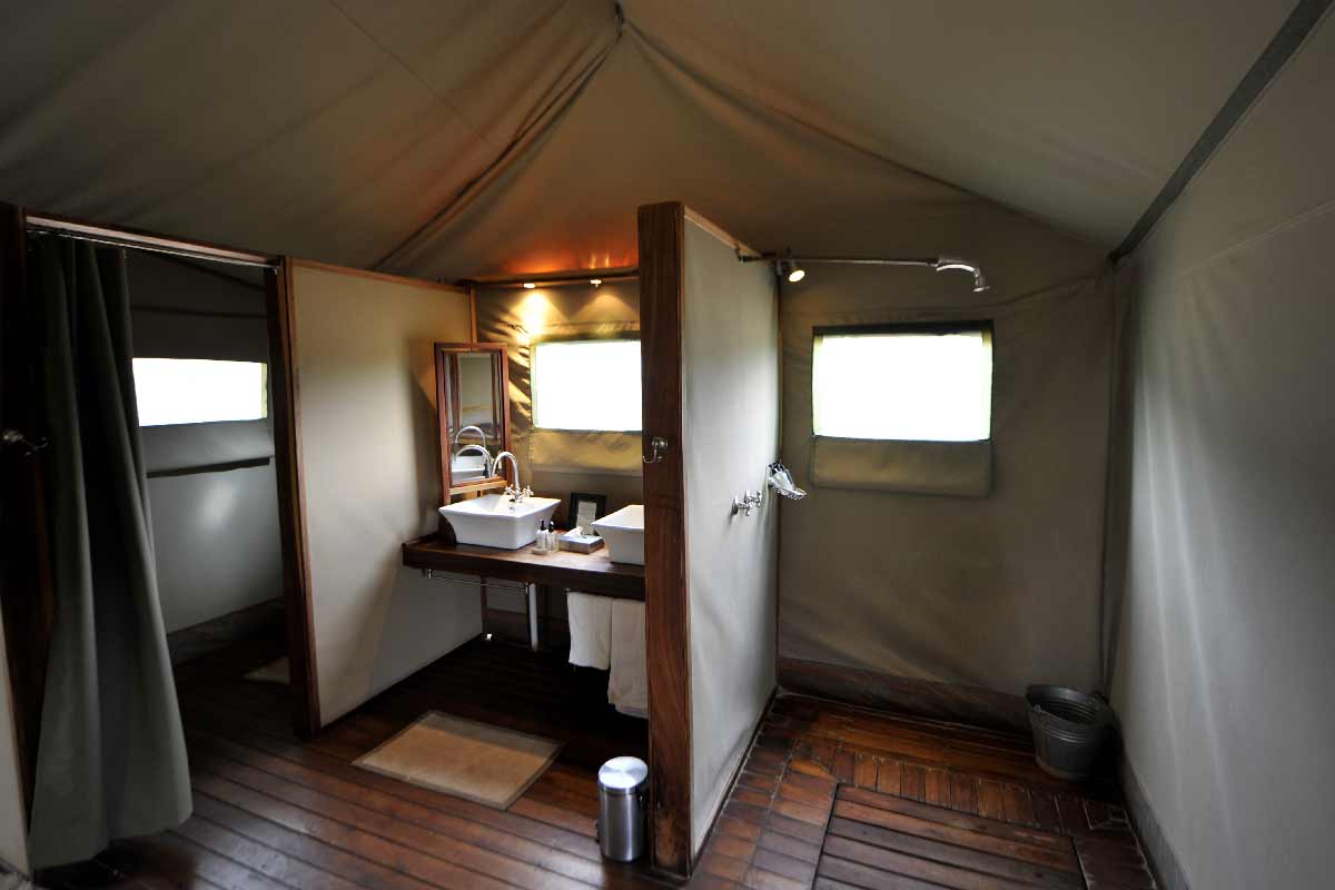 ONGAVA TENTED CAMP ne compte que 8 tentes très confortables (terrasse, ventilateur, coin bureau, salle de bains avec 2 vasques, toilettes séparées, douche intérieure et extérieure…) dont 1 familiale pour 4 personnes.