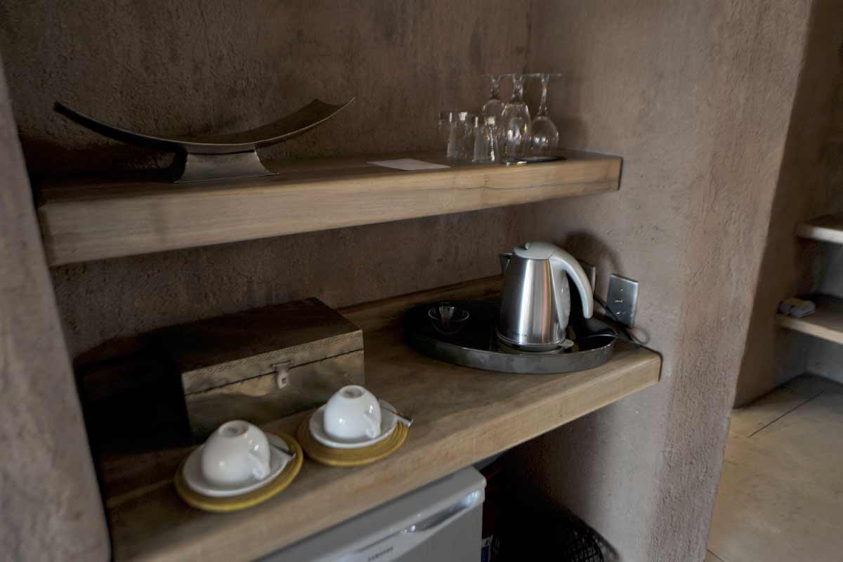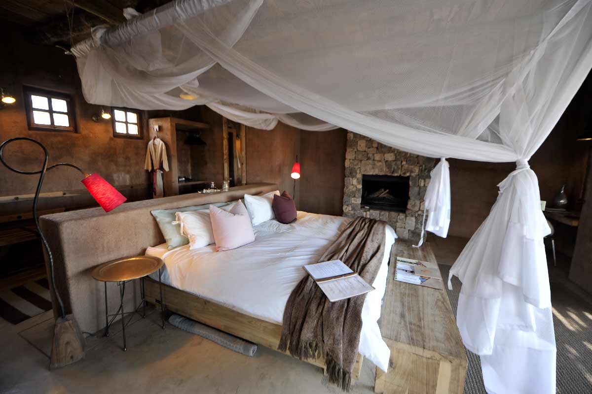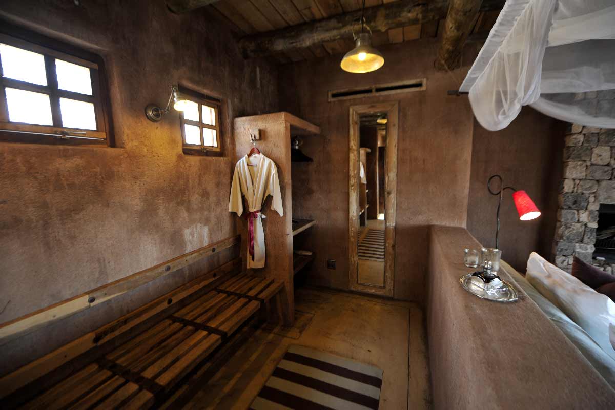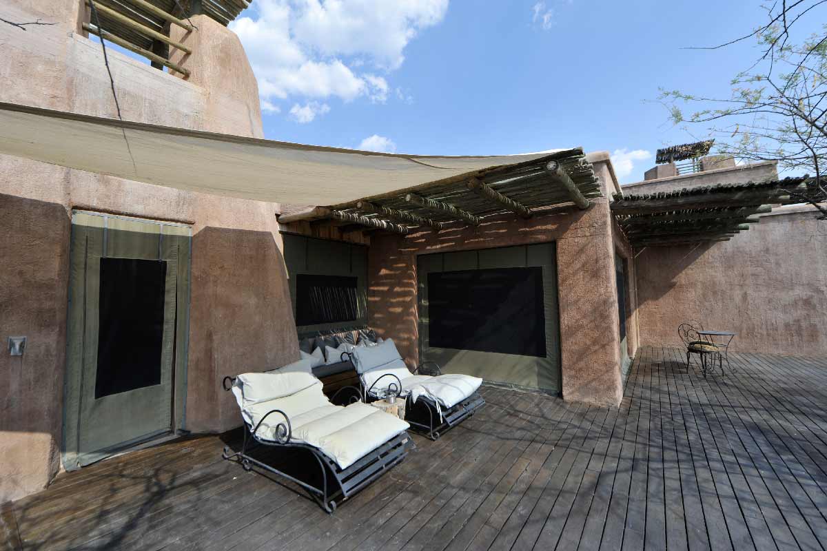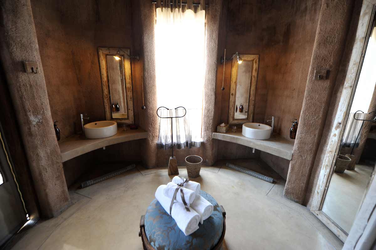 ONGUMA THE FORT propose 13 suites spacieuses situées autour du bâtiment principal : chambre, dressing, grande salle de bains avec douche intérieure et extérieure, climatisation, cheminée…