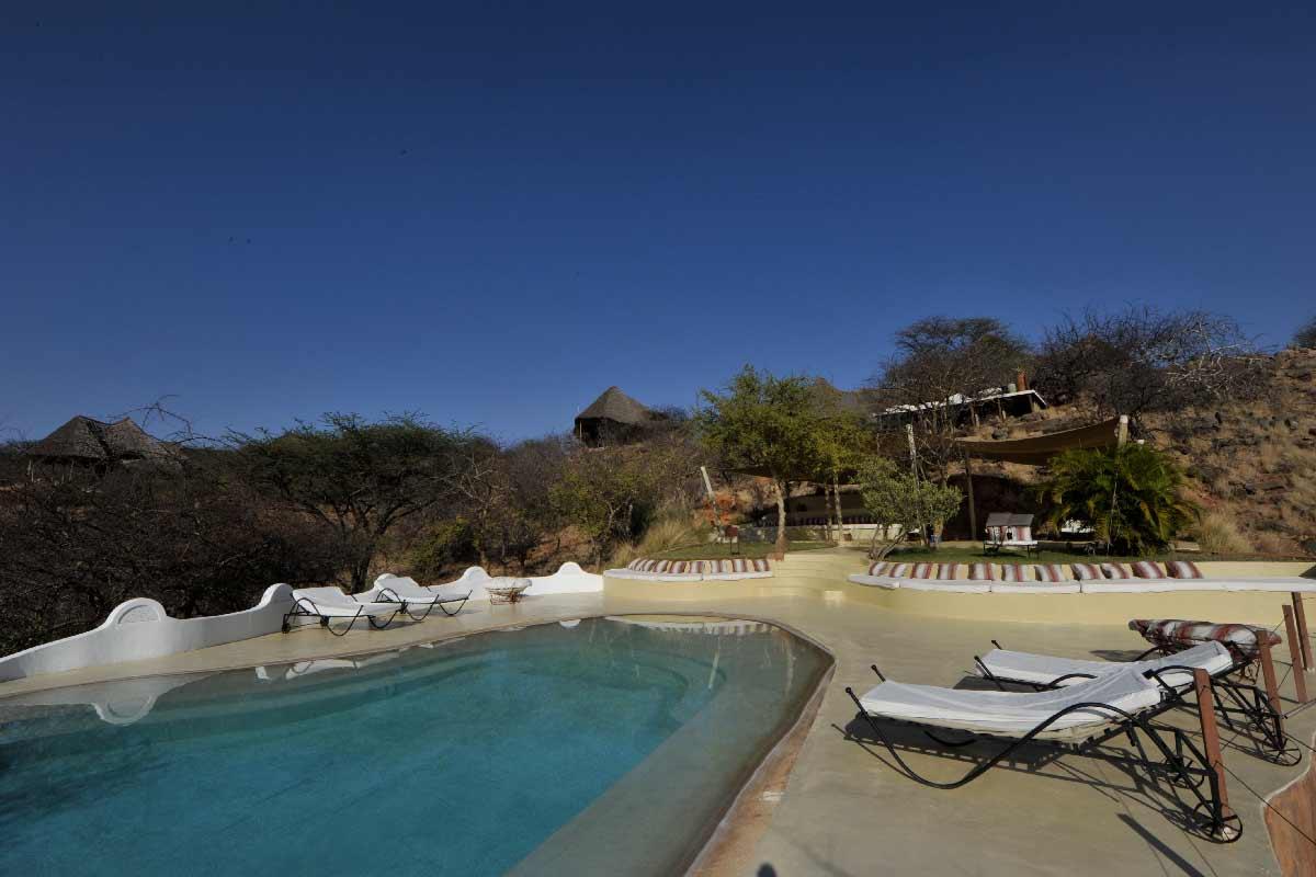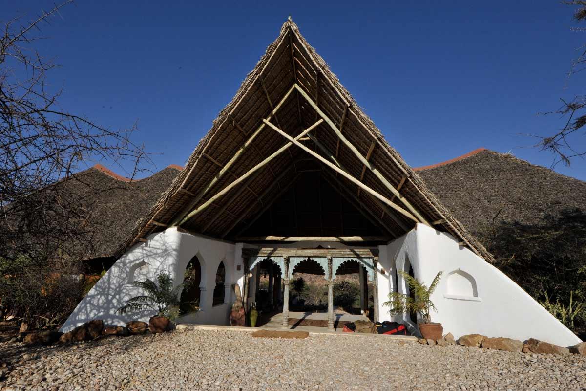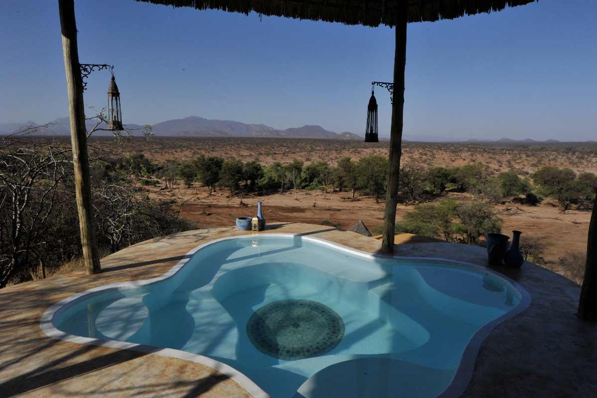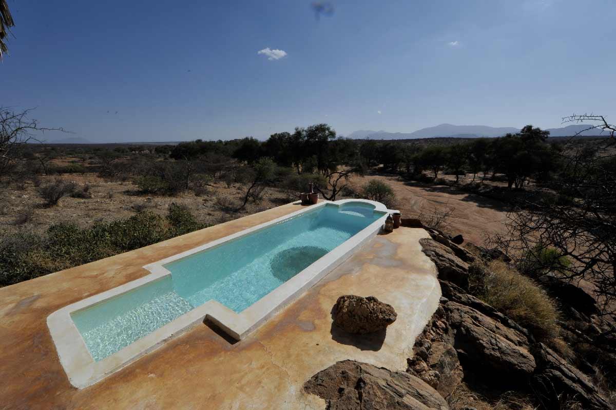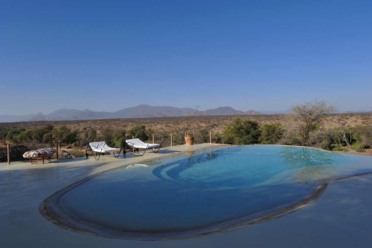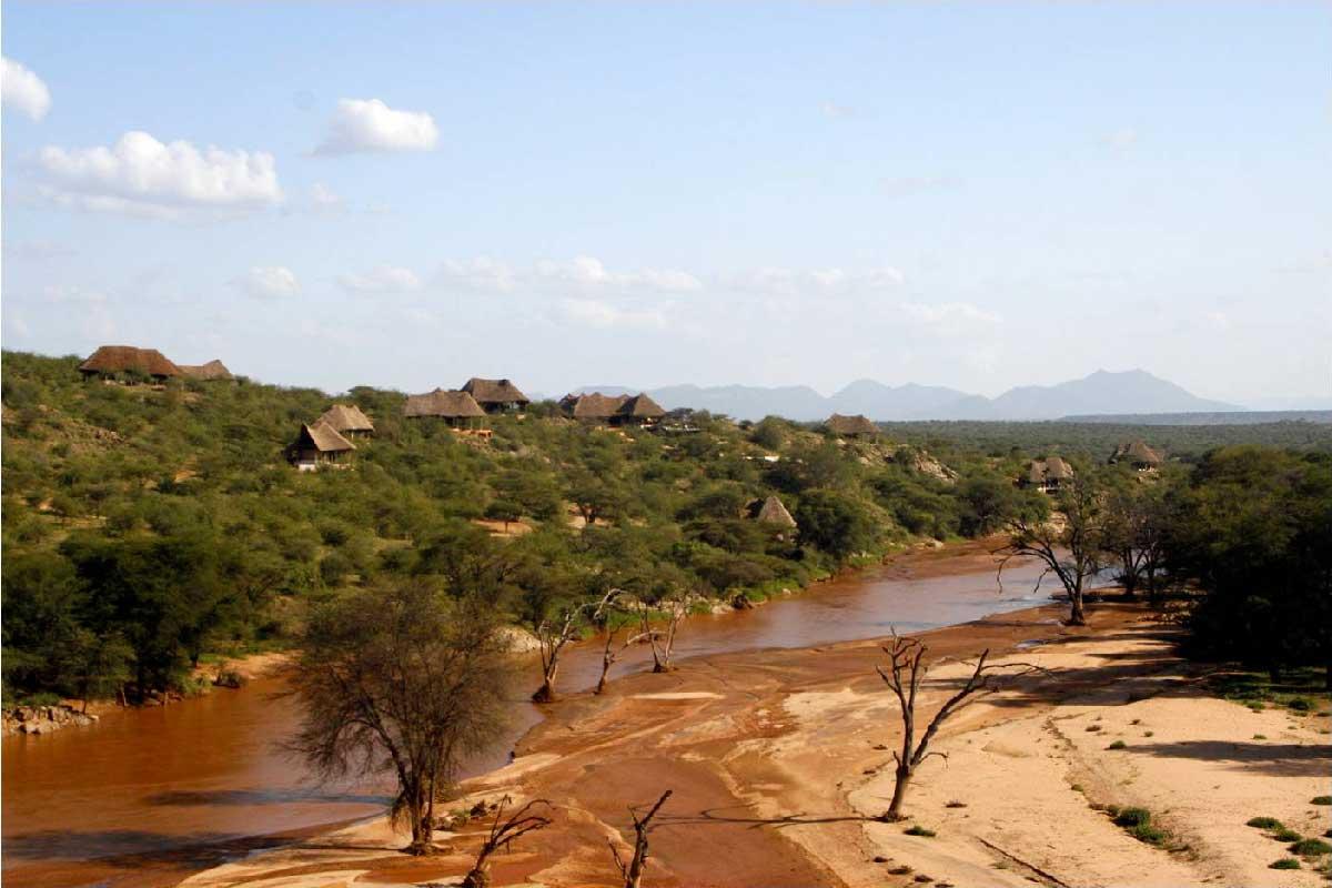 Perché sur une colline, le lodge domine la rivière Ewaso Ngiro et offre une vue spectaculaire sur des montagnes qui s’étendent au loin majestueusement. Les parties communes mêlent toits mauriciens, décoration swahilie et marocaine…Elles sont largement ouvertes sur l’extérieur et procurent une ombre bienfaitrice aux heures les plus chaudes de la journée.