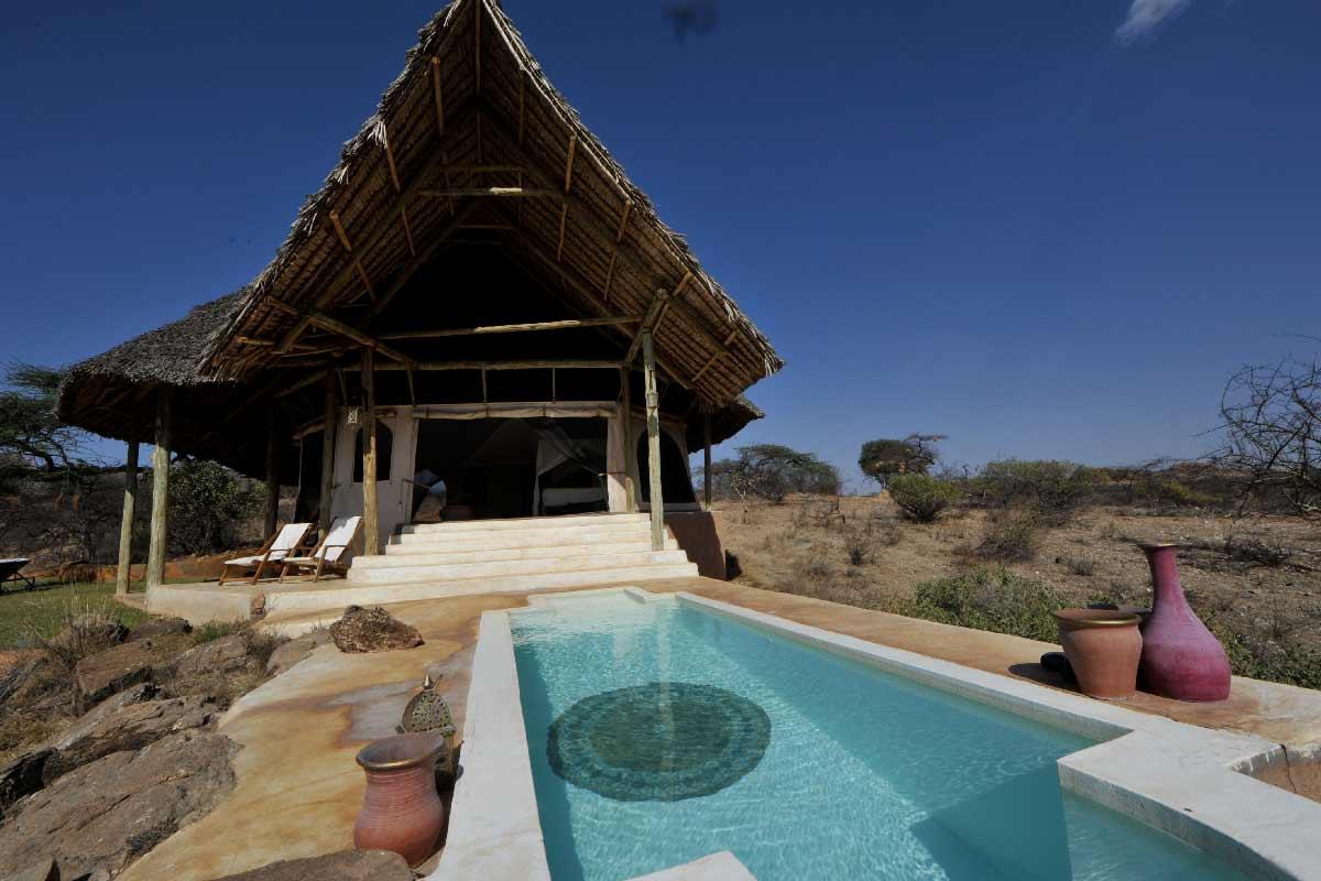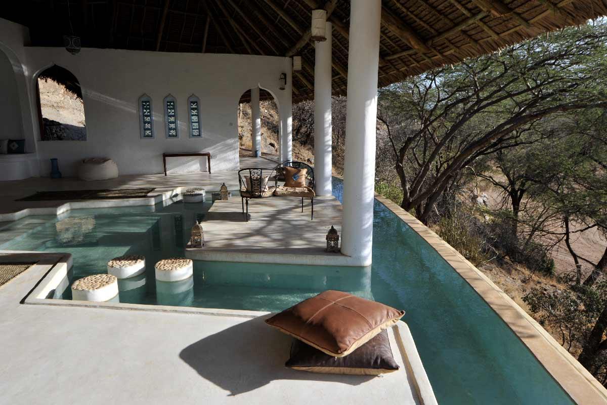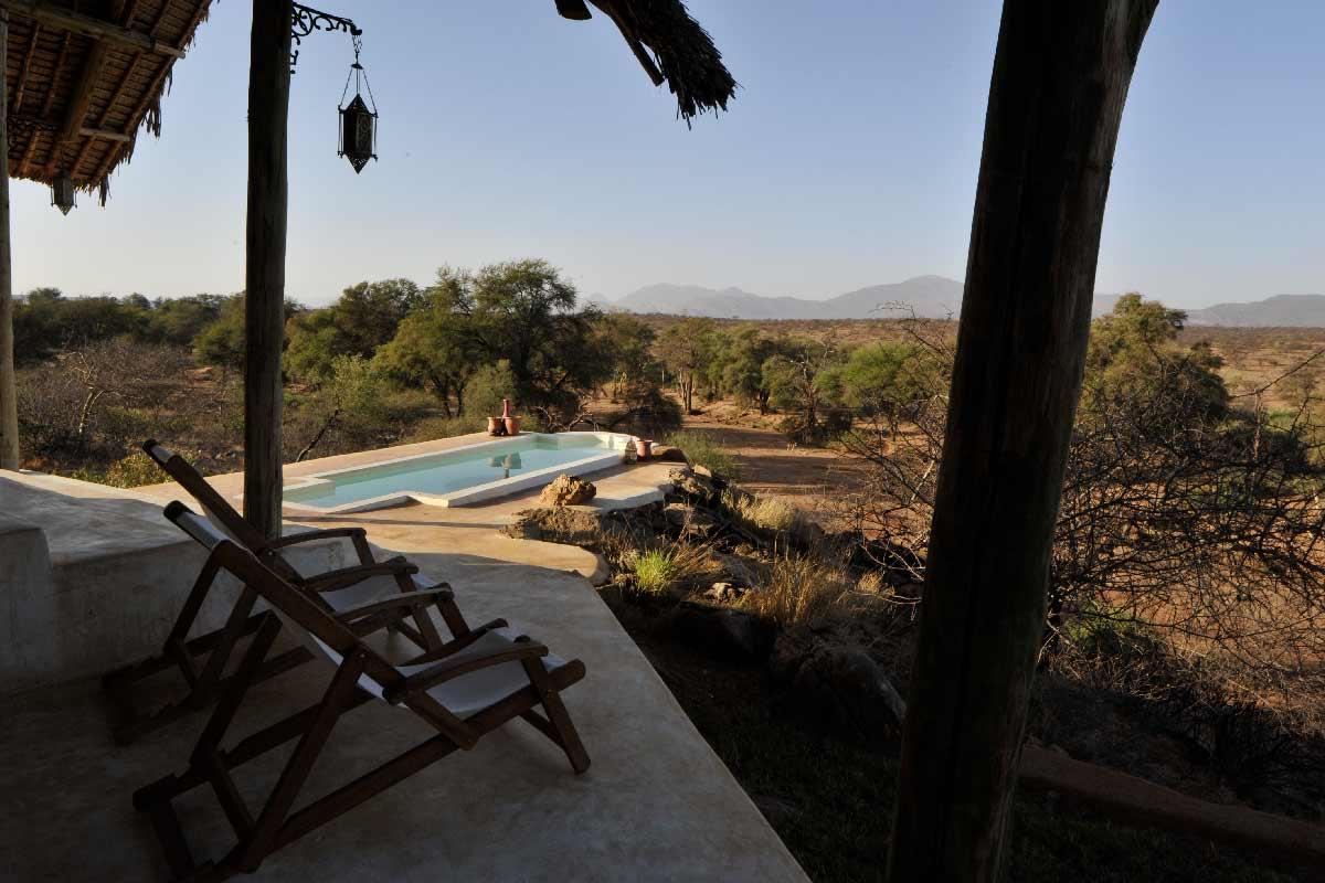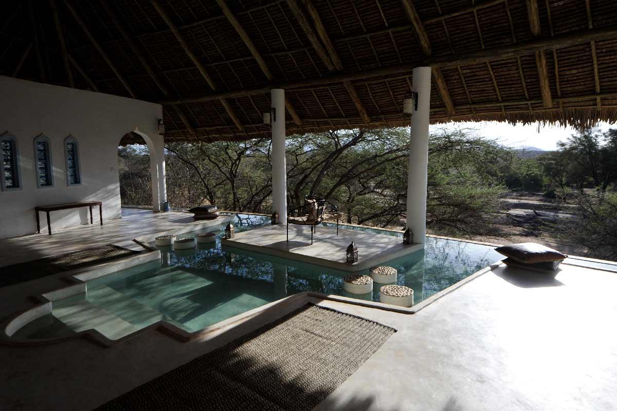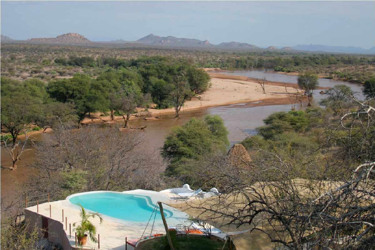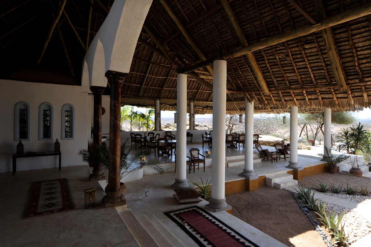 Perché sur une colline, le lodge domine la rivière Ewaso Ngiro et offre une vue spectaculaire sur des montagnes qui s’étendent au loin majestueusement. Les parties communes mêlent toits mauriciens, décoration swahilie et marocaine…Elles sont largement ouvertes sur l’extérieur et procurent une ombre bienfaitrice aux heures les plus chaudes de la journée.