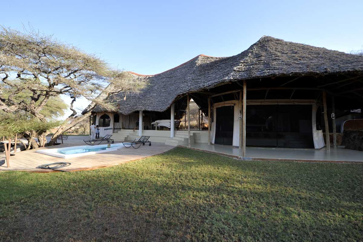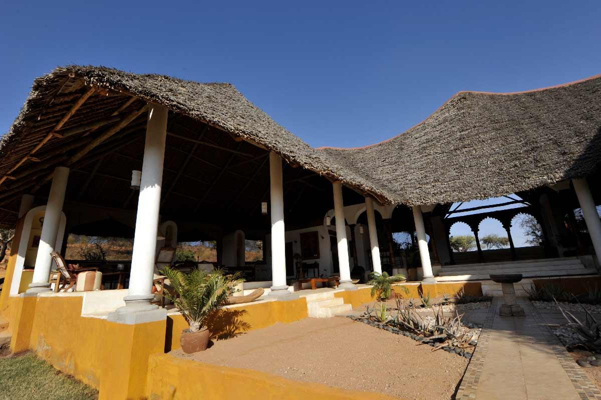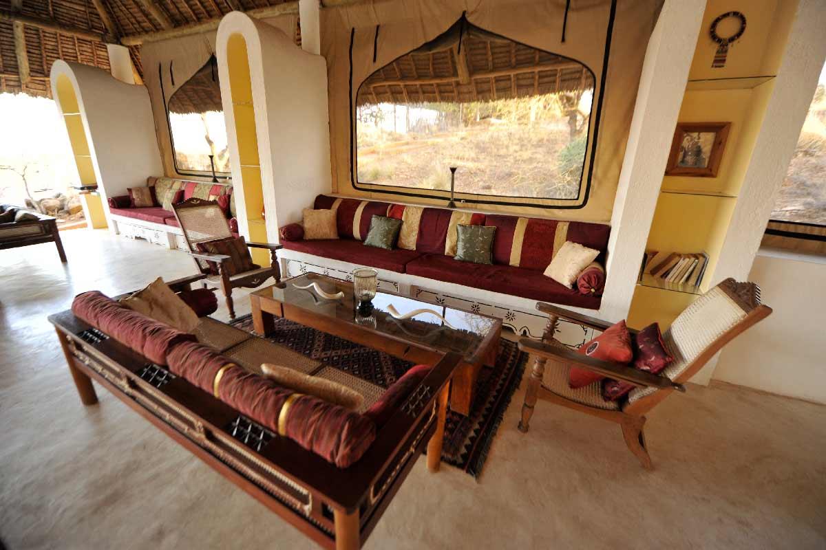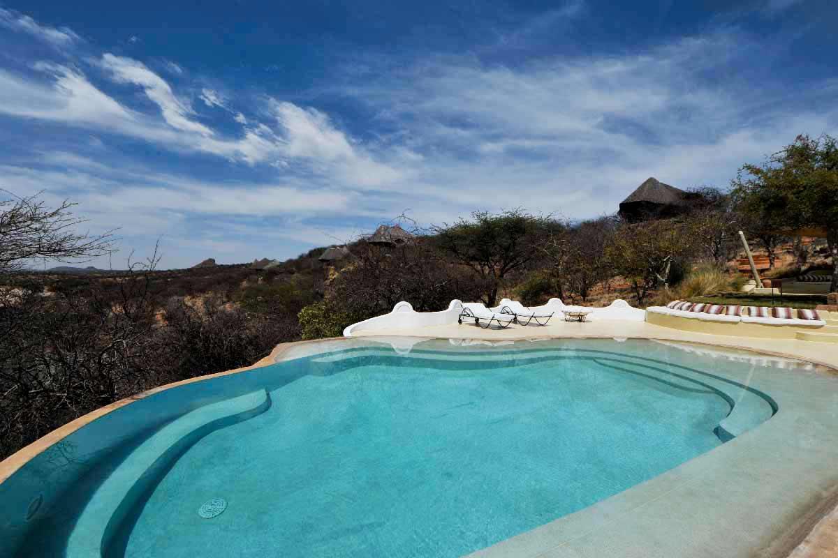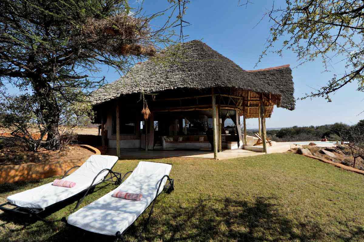 Perché sur une colline, le lodge domine la rivière Ewaso Ngiro et offre une vue spectaculaire sur des montagnes qui s’étendent au loin majestueusement. Les parties communes mêlent toits mauriciens, décoration swahilie et marocaine…Elles sont largement ouvertes sur l’extérieur et procurent une ombre bienfaitrice aux heures les plus chaudes de la journée.