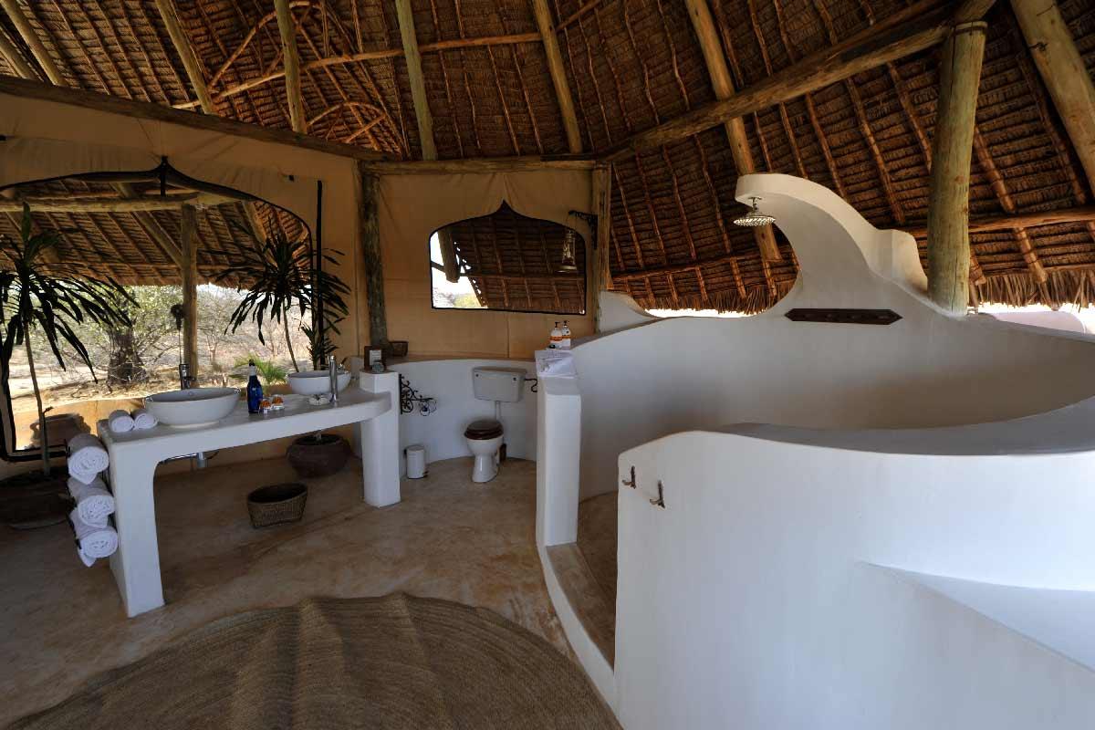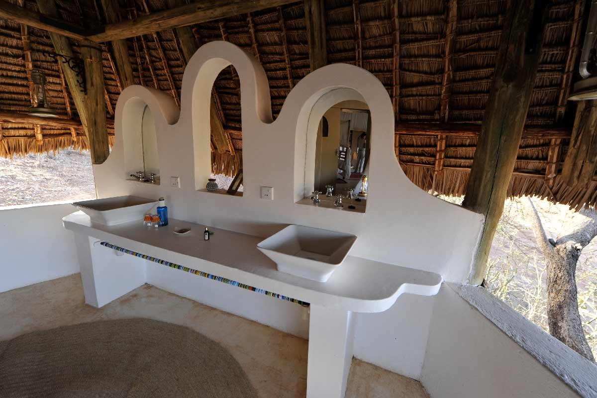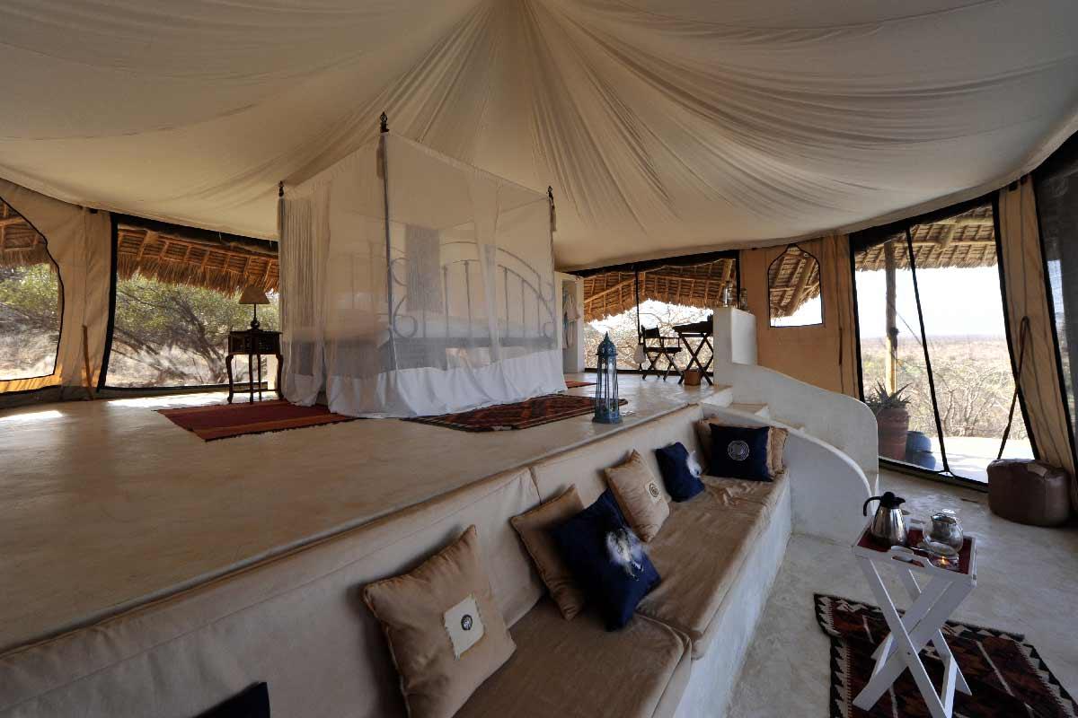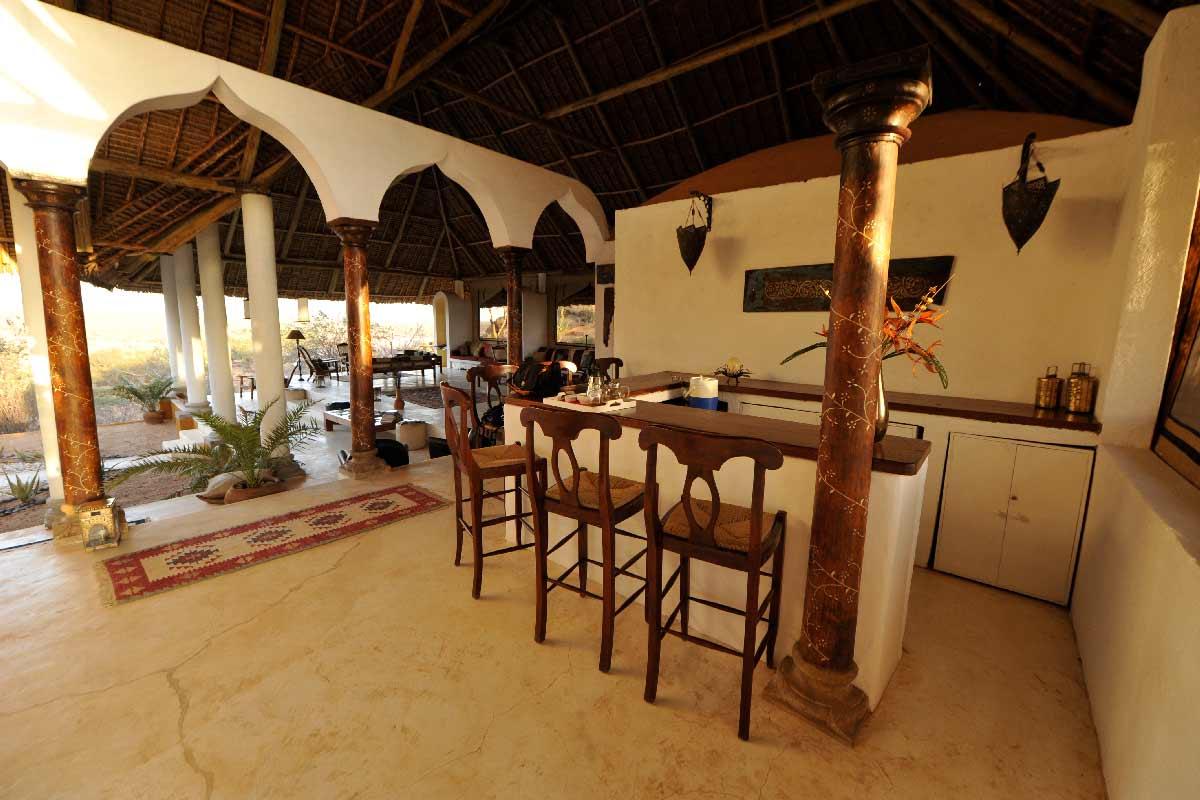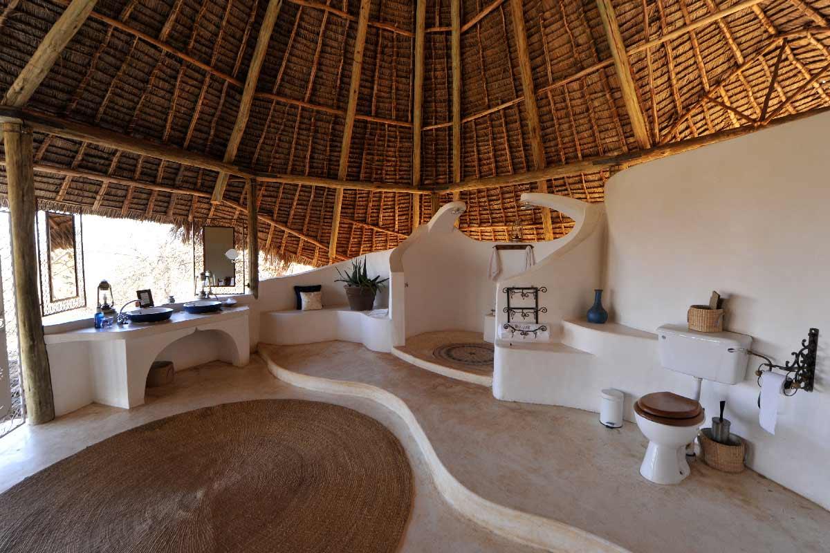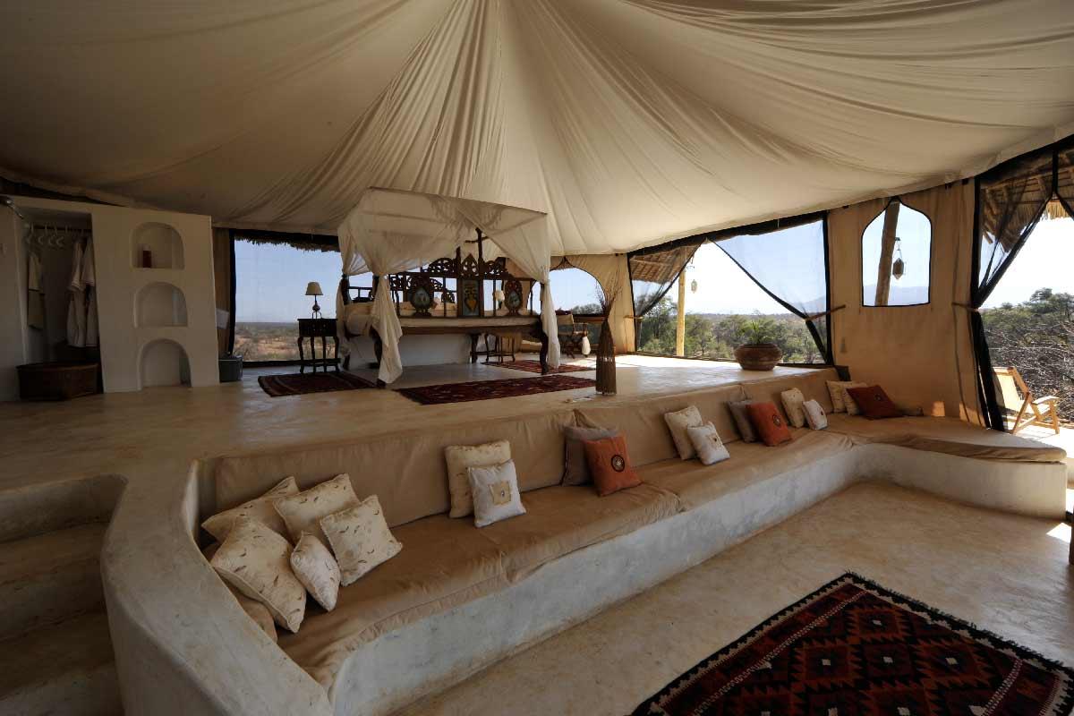 Perché sur une colline, le lodge domine la rivière Ewaso Ngiro et offre une vue spectaculaire sur des montagnes qui s’étendent au loin majestueusement. Les parties communes mêlent toits mauriciens, décoration swahilie et marocaine…Elles sont largement ouvertes sur l’extérieur et procurent une ombre bienfaitrice aux heures les plus chaudes de la journée.