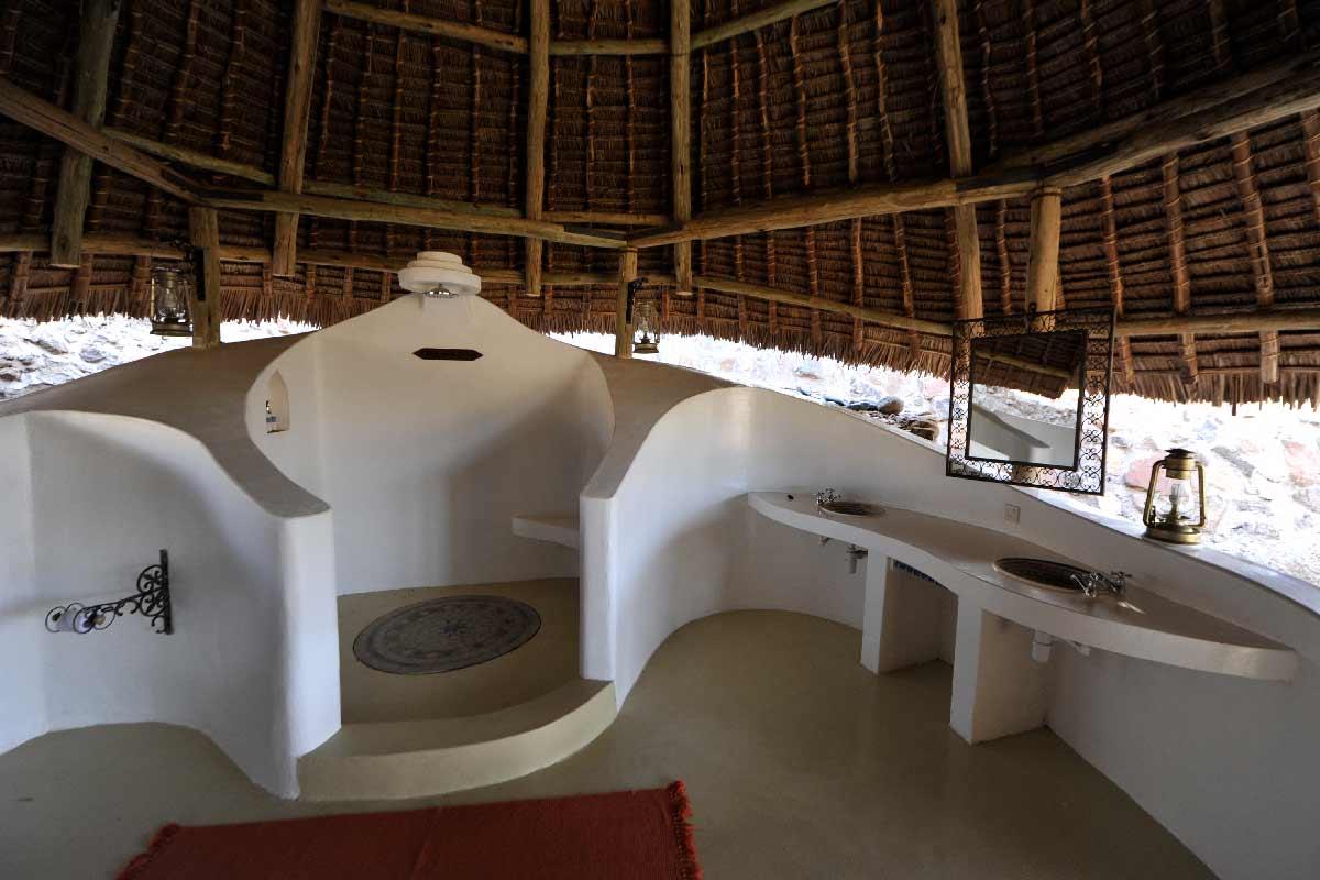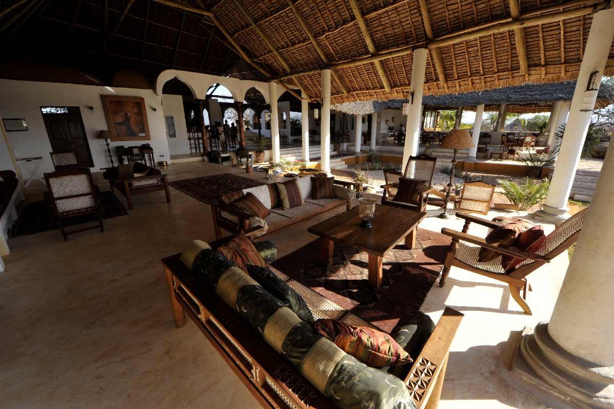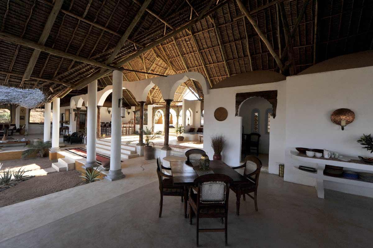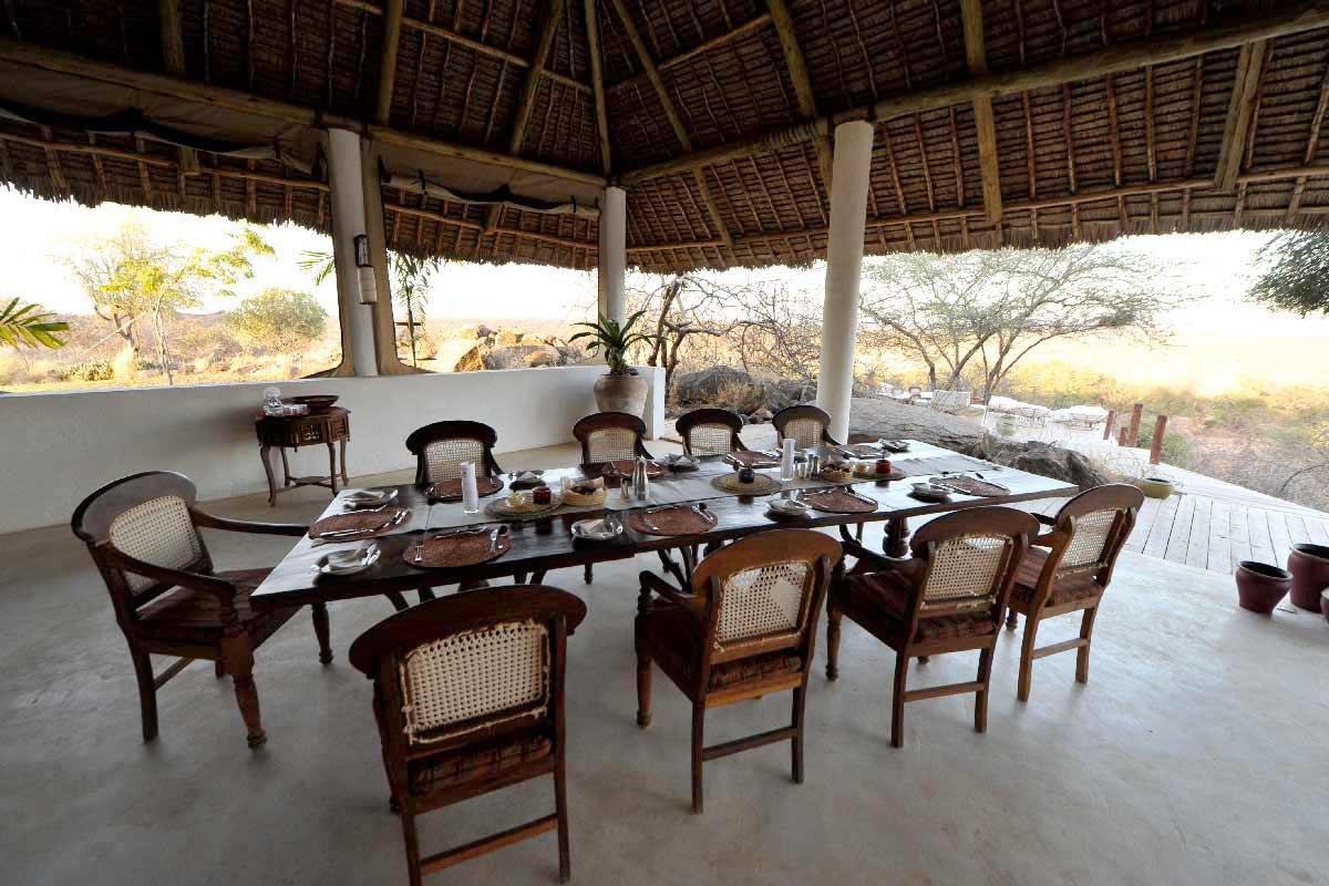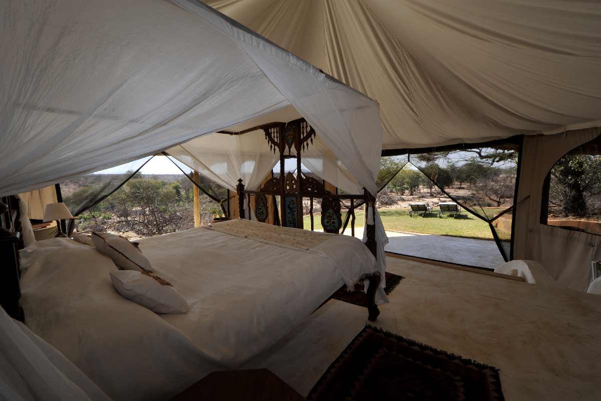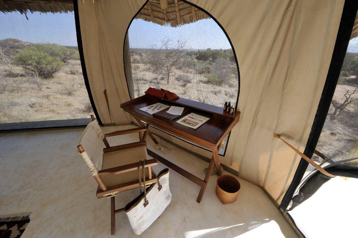 Perché sur une colline, le lodge domine la rivière Ewaso Ngiro et offre une vue spectaculaire sur des montagnes qui s’étendent au loin majestueusement. Les parties communes mêlent toits mauriciens, décoration swahilie et marocaine…Elles sont largement ouvertes sur l’extérieur et procurent une ombre bienfaitrice aux heures les plus chaudes de la journée.