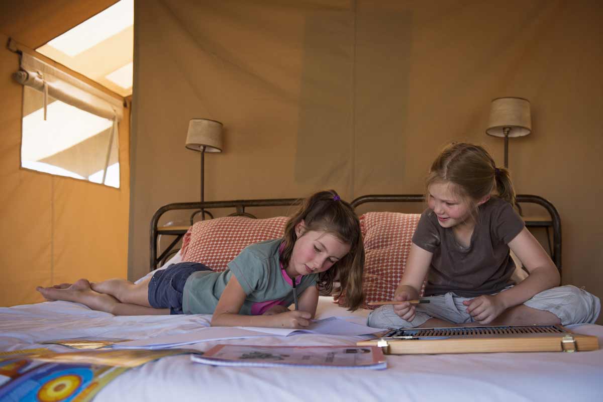 Une tente familiale est composée de 2 tentes reliées par une autre tente faisant office de salon.
