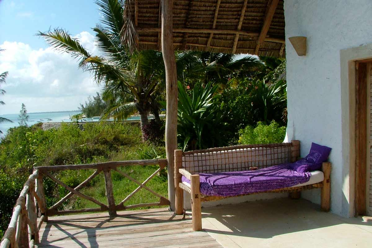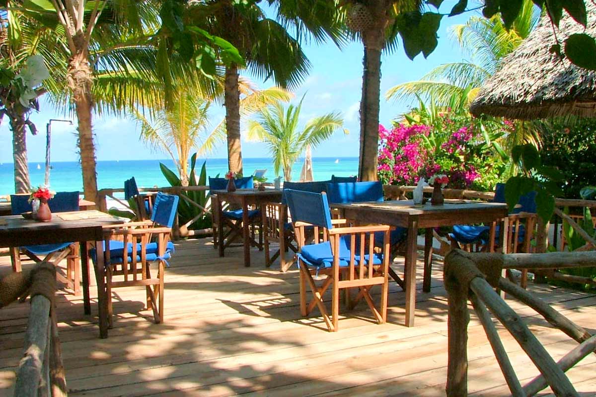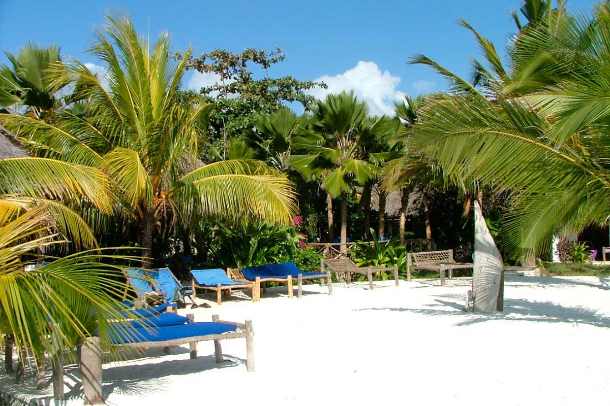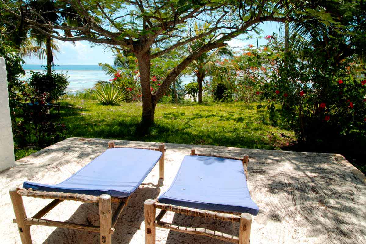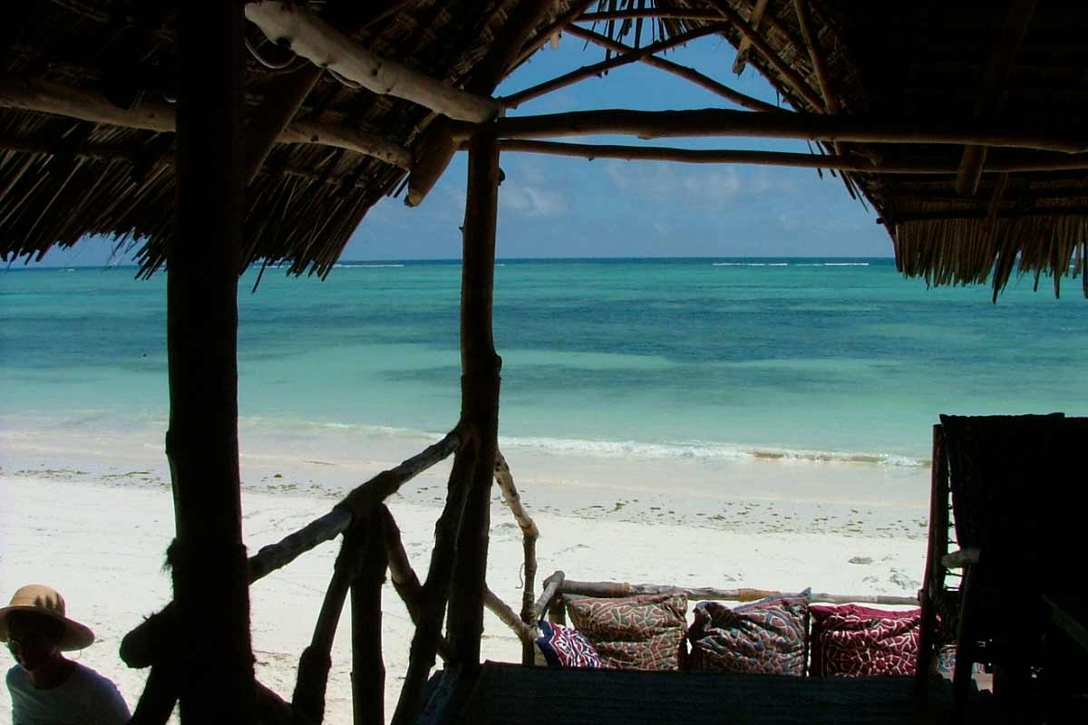En contrebas, la plage est calme et fort belle. En revanche, comme presque partout à Zanzibar, le bain n’est pas possible à marée basse, d’autant qu’il y a beaucoup de corail devant l’hôtel. Il est toutefois possible de marcher un peu vers la droite, sur la plage, pour trouver un peu de sable. Mais, dans tous les cas, il n’y a presque plus d’eau à marée basse, comme presque partout sur l’île…
