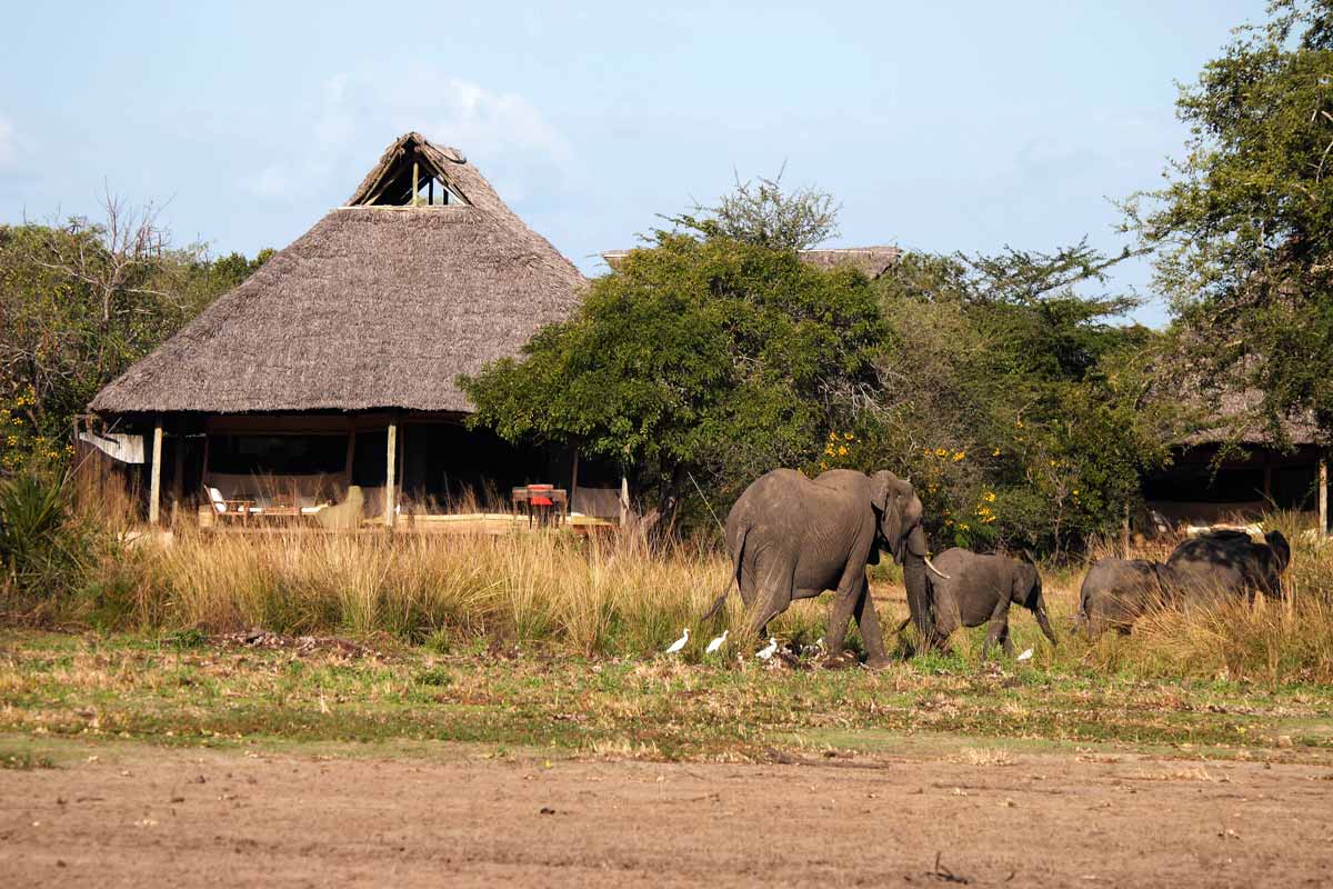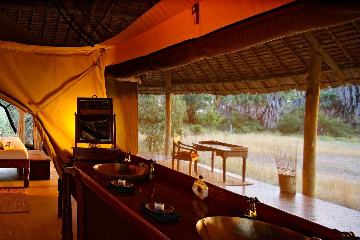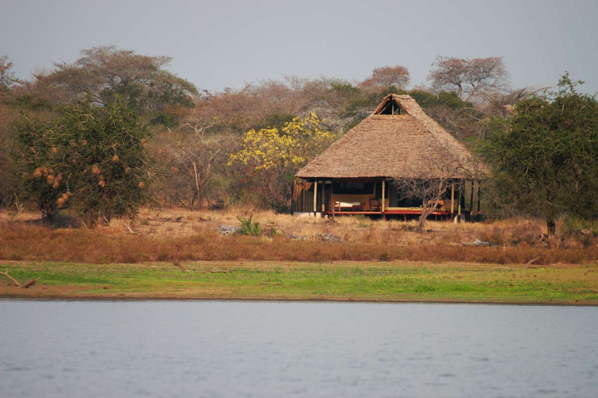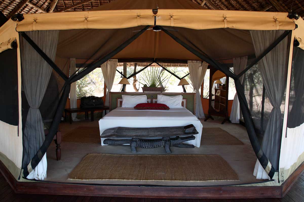 Les 13 tentes du SIWANDU (6 au North et 7 au South) se dressent sur des plateformes en bois, face au lac. Vastes, elles offrent un bon confort et une ambiance typique des safaris africains : ventilateur, grande terrasse avec canapé et fauteuils, salle de bains avec double vasque, immense douche extérieure…