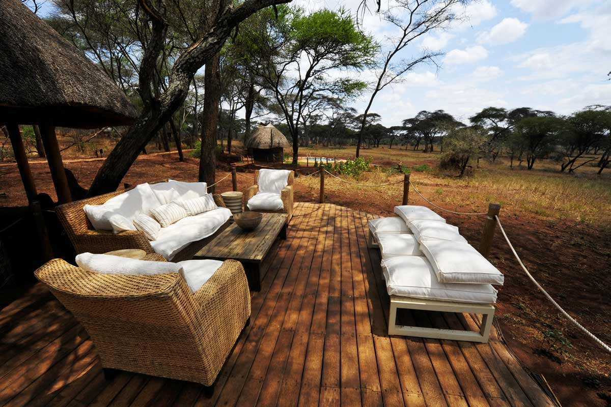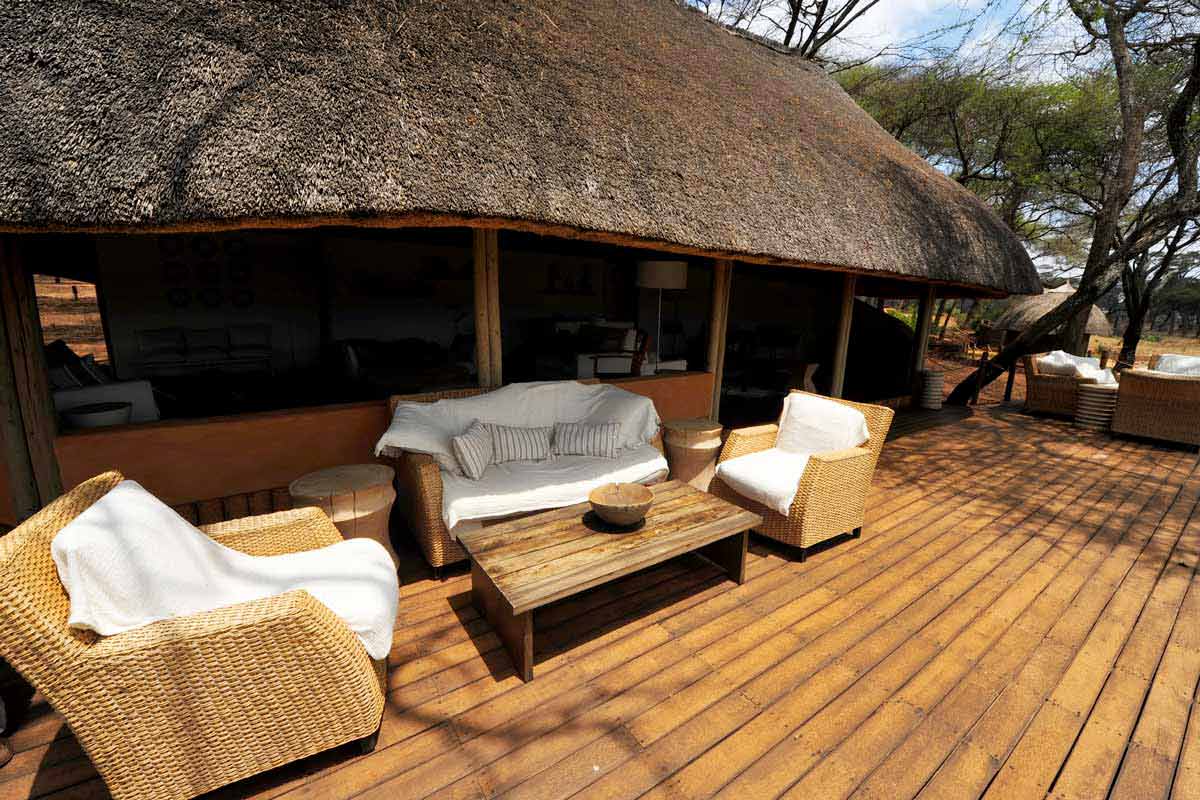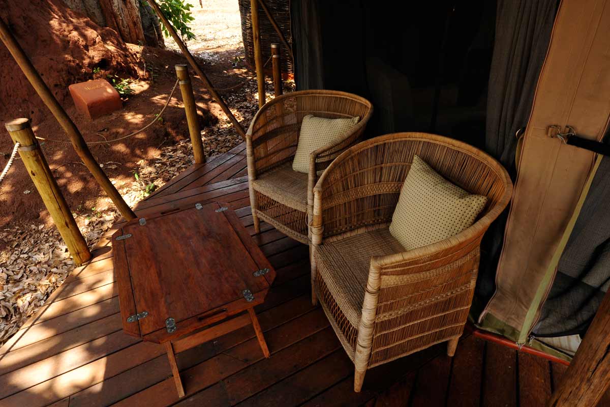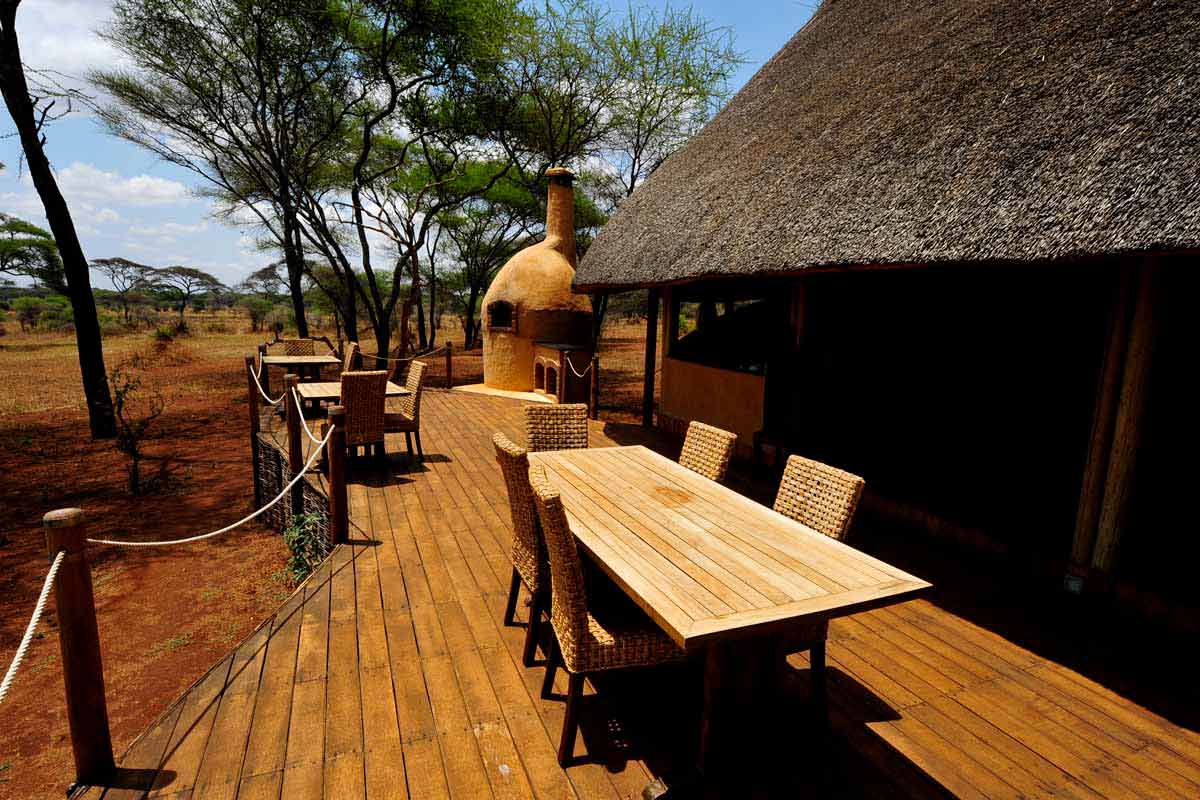 Les repas se prennent dans la « mess tent ». Depuis la terrasse, vous ne vous lasserez pas d’observer la faune et la majesté des grands acacias, un verre à la main ou en savourant votre repas.