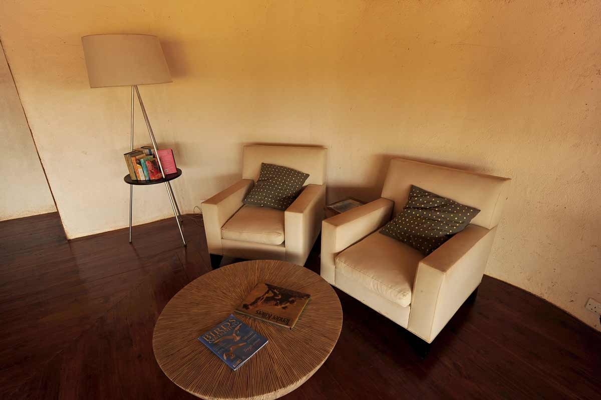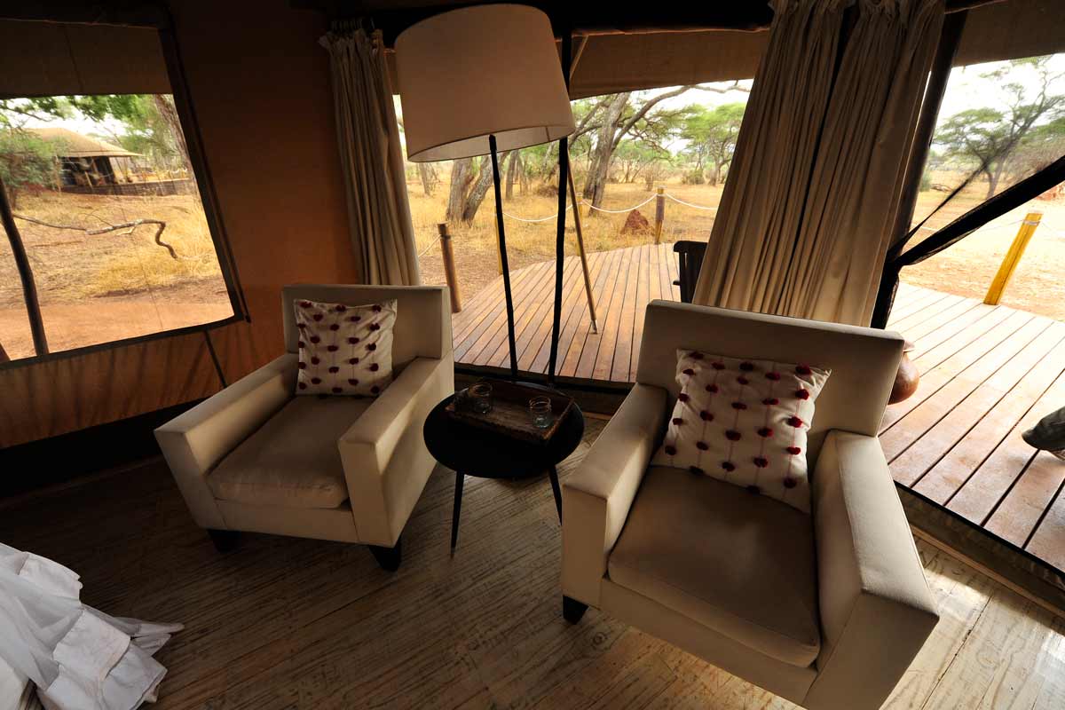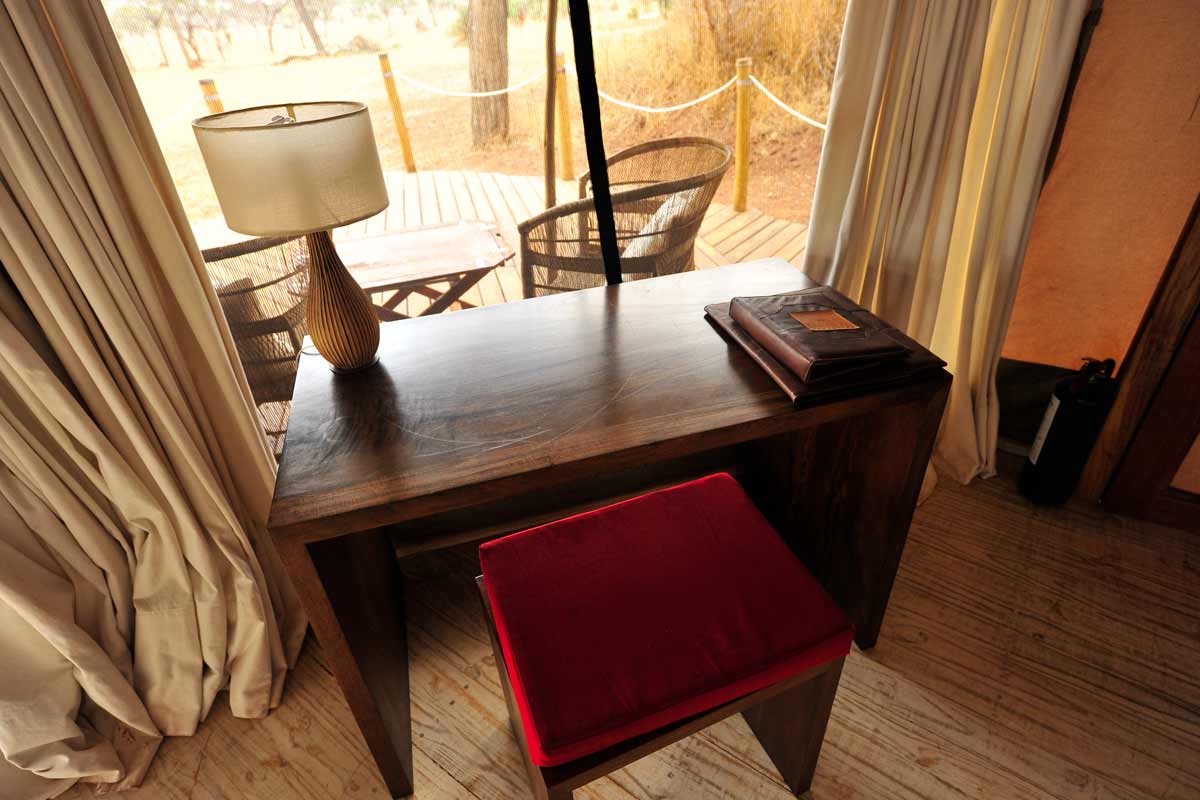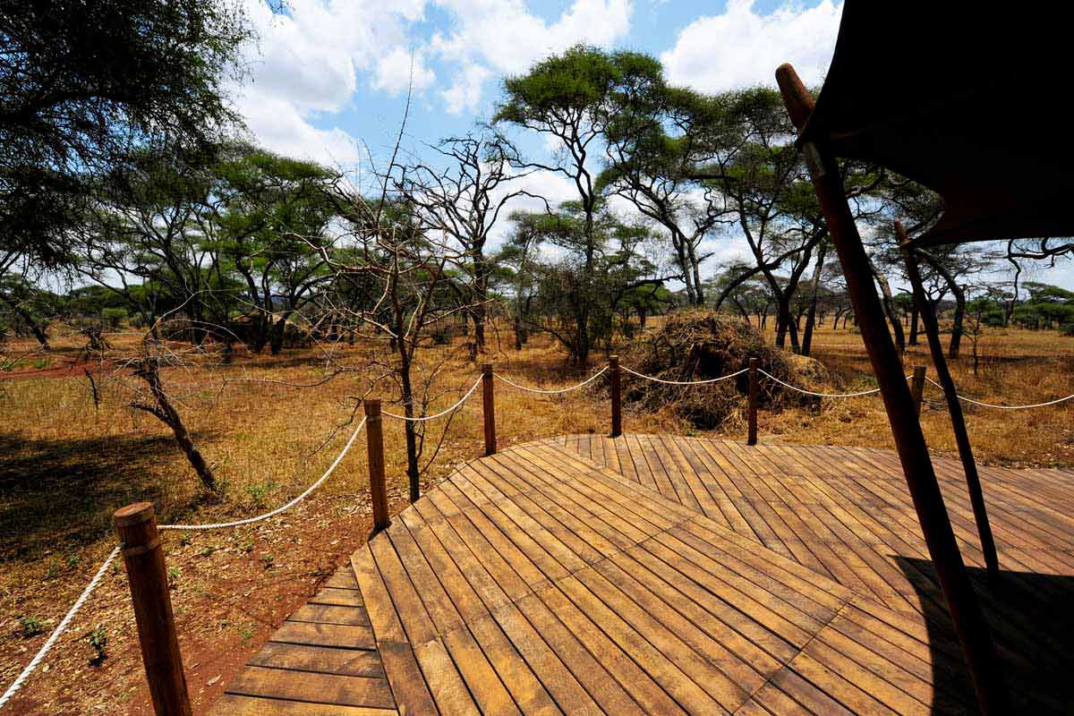 Les repas se prennent dans la « mess tent ». Depuis la terrasse, vous ne vous lasserez pas d’observer la faune et la majesté des grands acacias, un verre à la main ou en savourant votre repas.