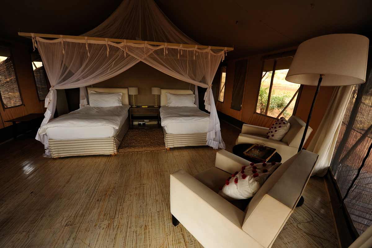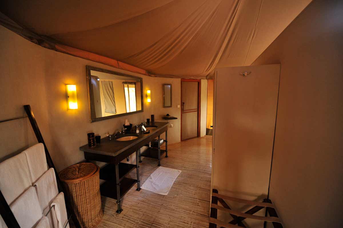 Les 12 tentes de SWALA CAMP se répartissent à l’ombre de grands acacias, au milieu d’une faune souvent abondante. Bien espacées les unes des autres, elles sont vastes, confortables, pleines de charme et s’intègrent parfaitement dans cet environnement sauvage. Depuis votre terrasse, vous pourrez observer impalas, waterbucks et éléphants qui passent régulièrement aux abords du camp. En plus de la douche intérieure, une douche extérieure permet d’assister au spectacle de la nature…