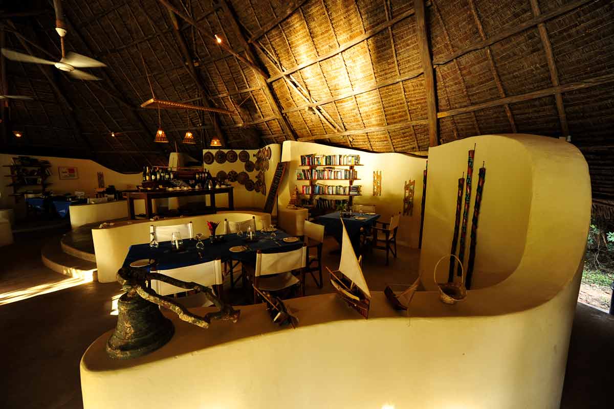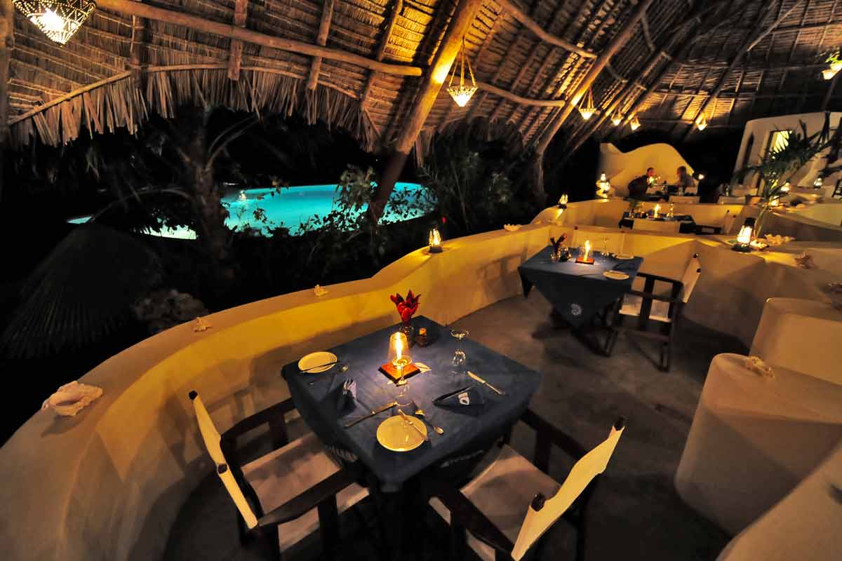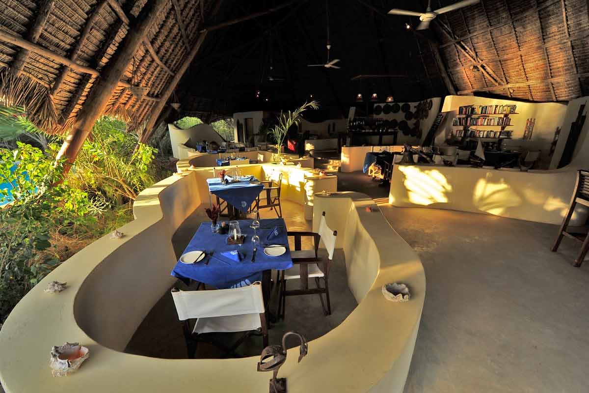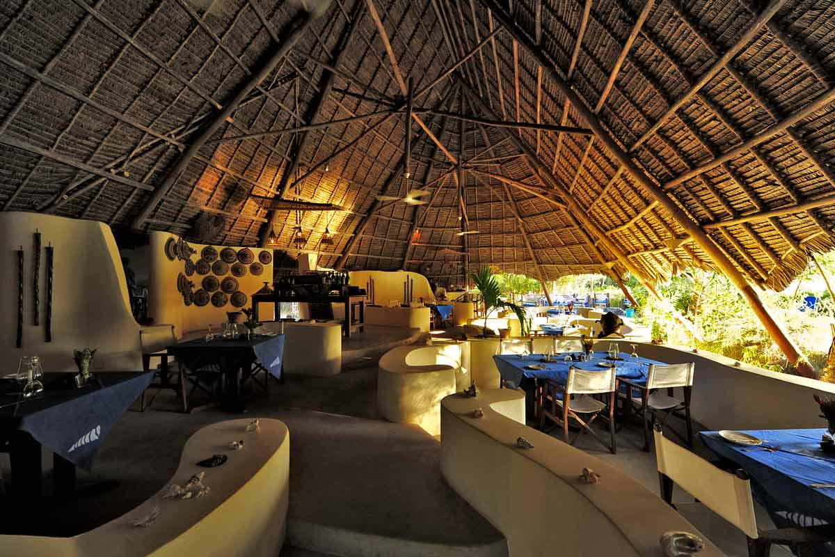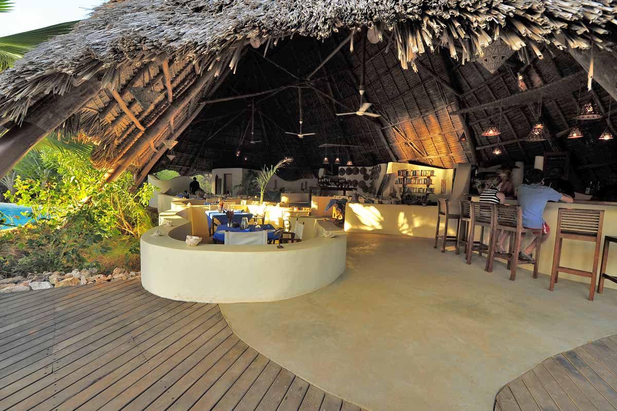 Vous apprécierez également un vaste restaurant sous un toit de makuti avec, dans son prolongement, le bar et, à l’extérieur, le salon. Les parties protégées par l’immense toit sont peut-être un peu sombres. Les parties communes donnent sur la piscine et n’offrent malheureusement pas de vue sur l’océan.