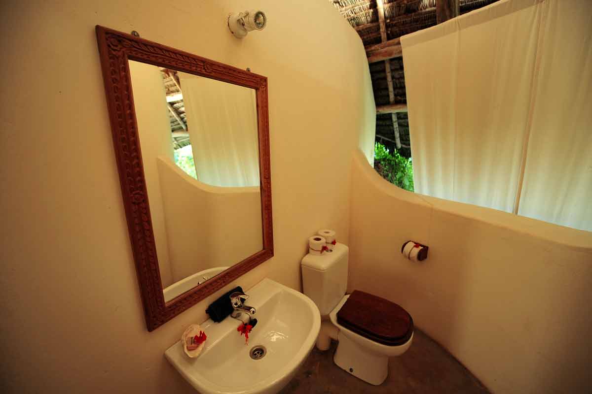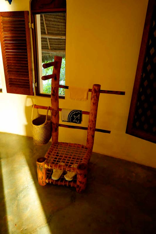 La partie « chambre » est, quant à elle, fermée. Elle compte un grand lit avec moustiquaire, un ventilateur au-dessus du lit, le dressing, 2 fauteuils et, derrière la tête de lit, 2 vasques. Aux fenêtres, des moustiquaires et des persiennes. Les chambres sont un peu sombres, afin de protéger de la chaleur extérieure.