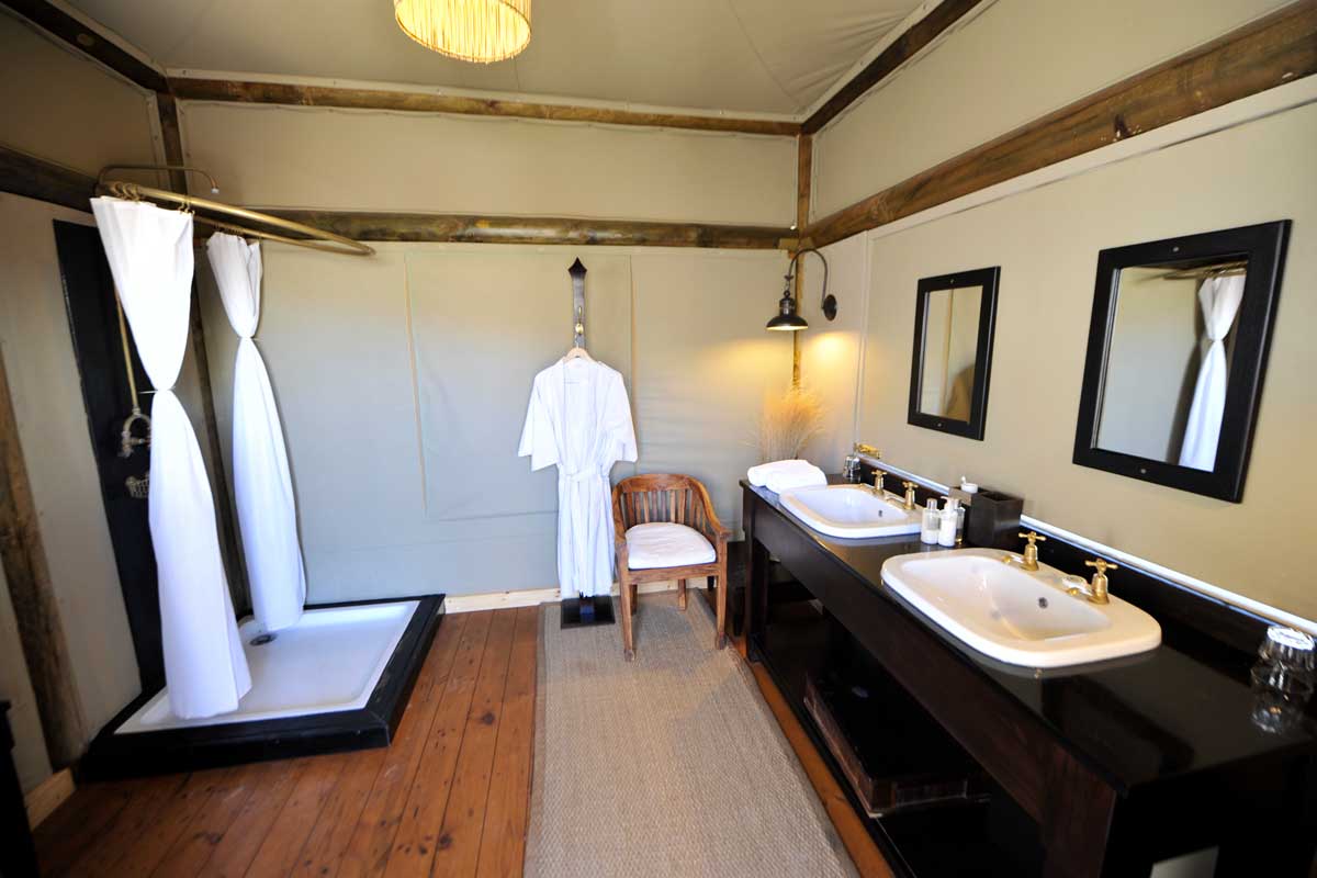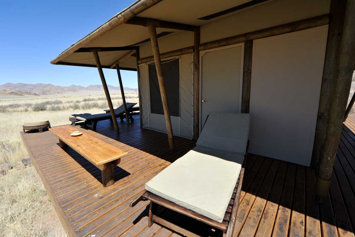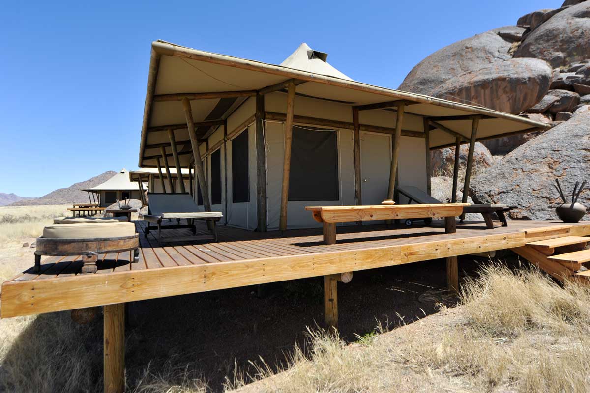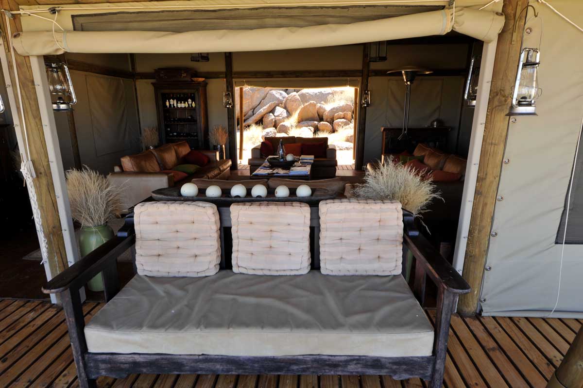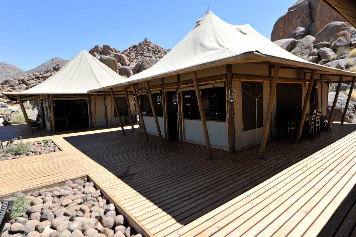 Les 4 tentes de WOLWEDANS BOULDERS CAMP sont vastes : grande terrasse, coin bureau, grande salle de bains (dans une tente à côté qui impose un petit passage à l’extérieur)…