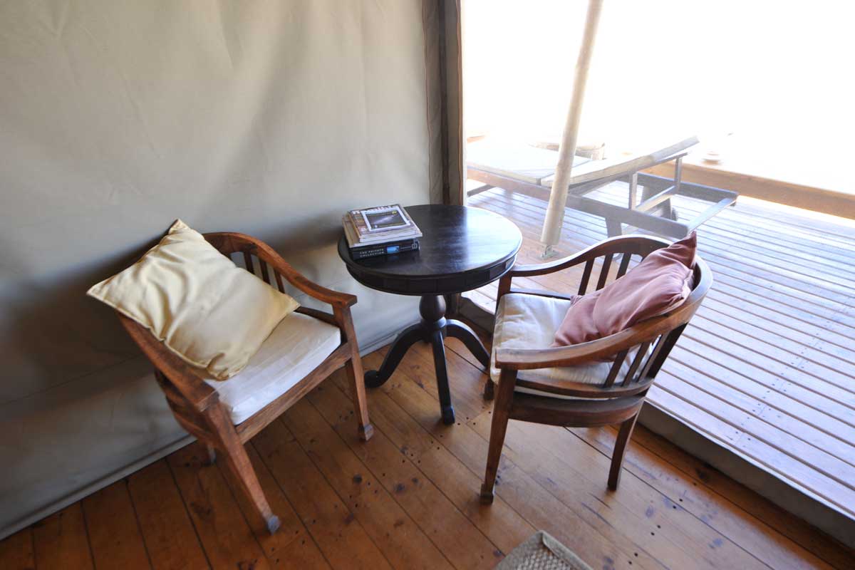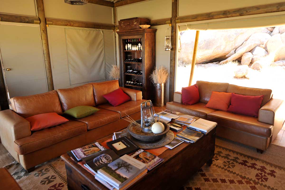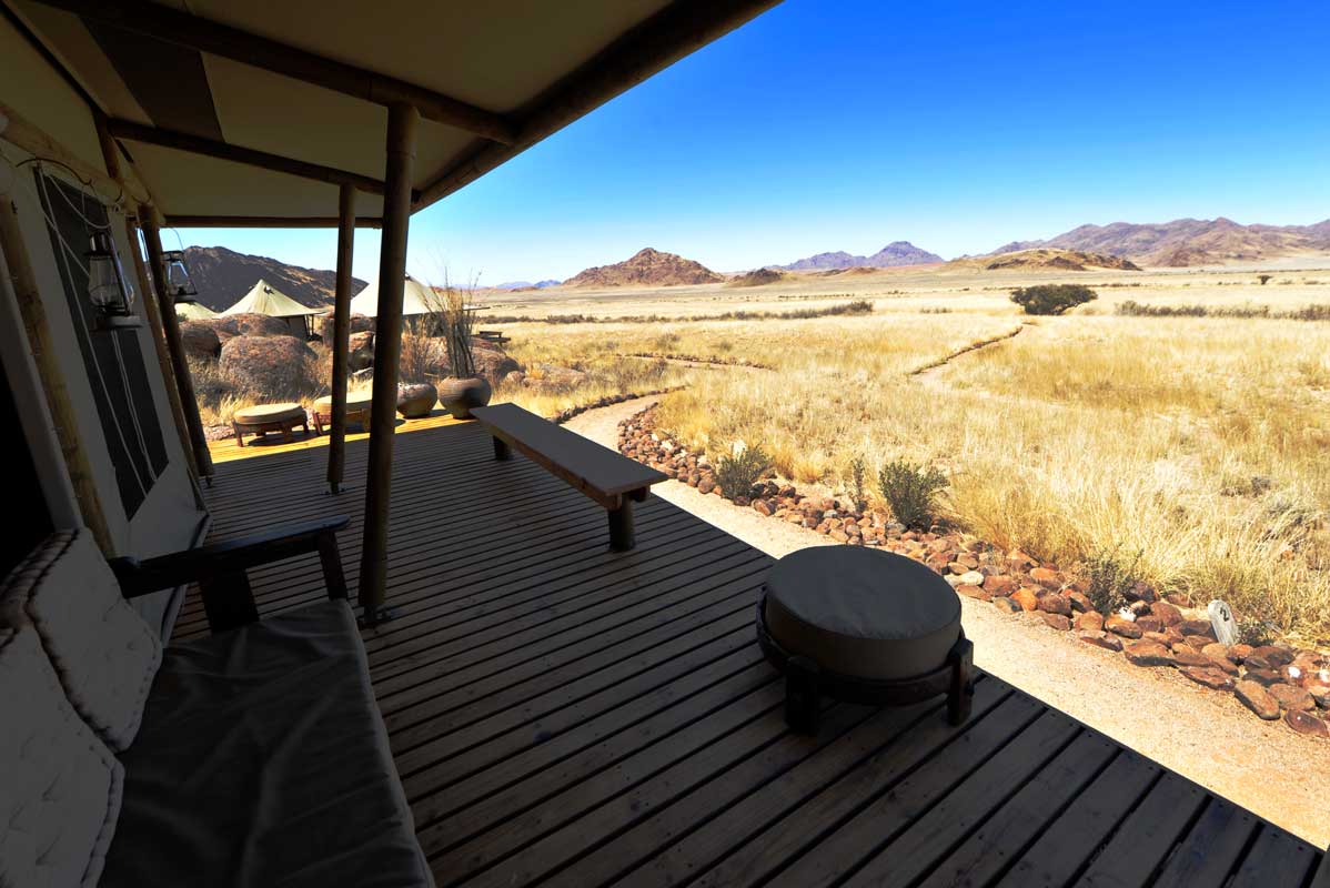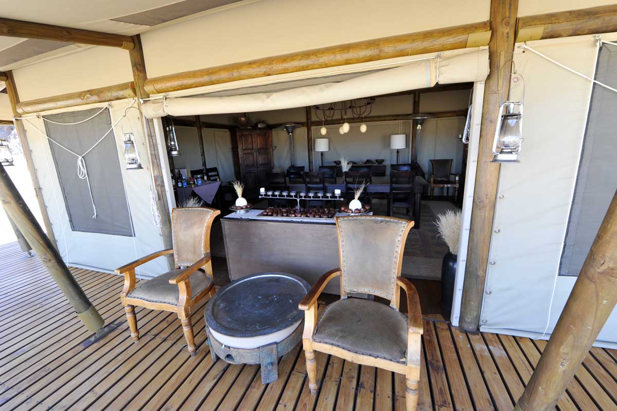 Les 4 tentes de WOLWEDANS BOULDERS CAMP sont vastes : grande terrasse, coin bureau, grande salle de bains (dans une tente à côté qui impose un petit passage à l’extérieur)…