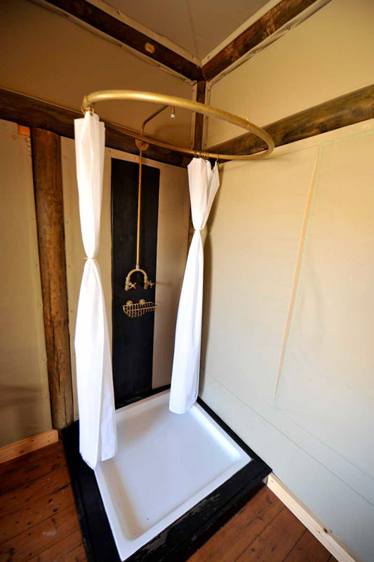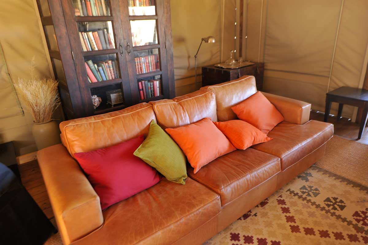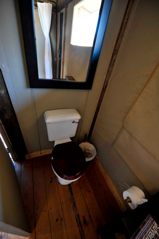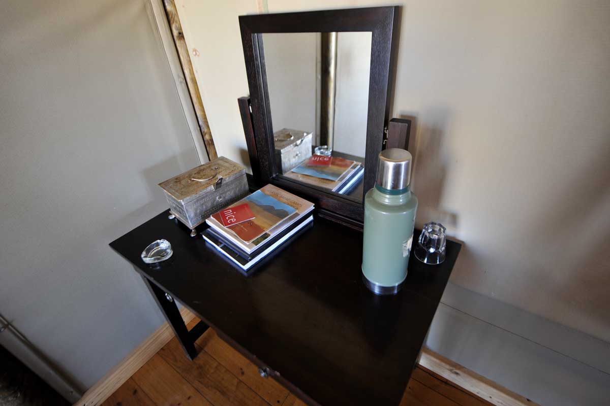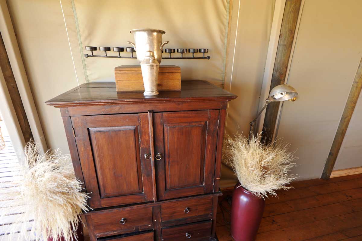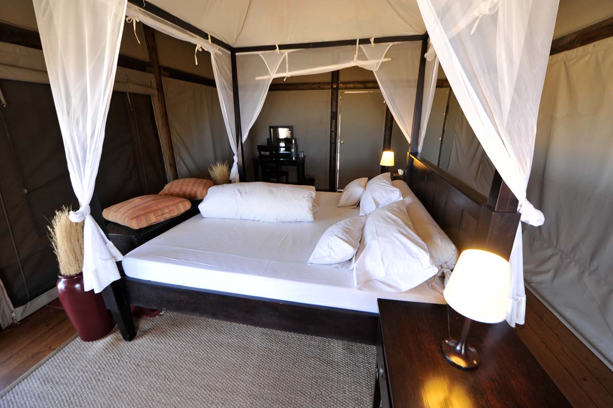 Les 4 tentes de WOLWEDANS BOULDERS CAMP sont vastes : grande terrasse, coin bureau, grande salle de bains (dans une tente à côté qui impose un petit passage à l’extérieur)…