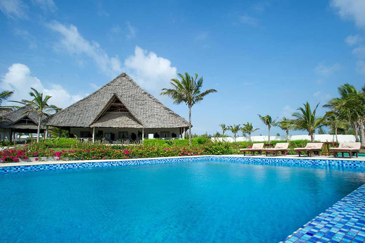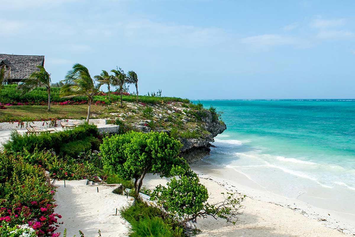 L’hôtel est construit sur le récif corallien et domine une crique où l’eau recouvre parfois complètement la plage à marée haute. De ce fait, une plage artificielle a été créée sous la piscine, au-dessus de l’eau que vous pourrez rejoindre par un escalier en bois. À marée basse, comme très souvent à Zanzibar, l’eau se retire au-delà de la barrière de corail et la baignade n’est plus possible.