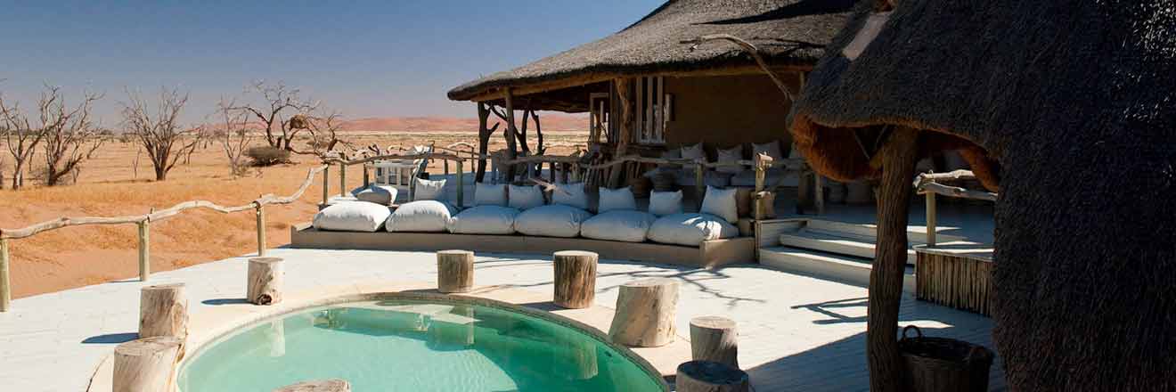 Dans tous les cas, nous avons sélectionné des hébergements exceptionnels. Parfaitement intégras dans la nature sauvage qui caractérise la Namibie, ils offrent des prestations hôtelières de grand standing, un service personnalisé, une cuisine de qualité internationale, des vins excellents… Les chambres sont immenses, les vues spectaculaires, les activités proposées sont originales (découverte de villages Himba reculés, des dunes en quad, observation des étoiles innombrables et de la voie Lactée qu’on observe ici parfaitement durant les soirées claires, de vols en montgolfière…).
