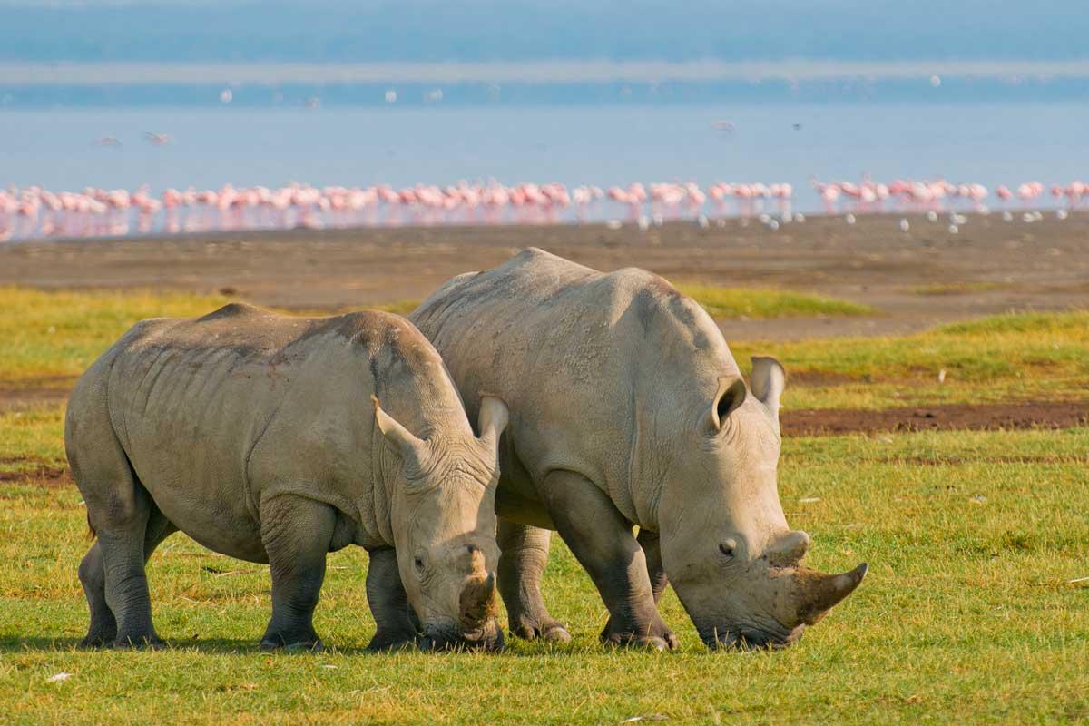 Les mammifères ne sont pas en reste au lac Nakuru avec de nombreuses espèces : gazelles, zèbres, waterbucks, girafes de Rotschild, lions, léopards mais surtout les rhinocéros blancs et les très rares rhinocéros noirs qui ont été récemment réintroduits (la différence entre les deux espèces ne provenant pas de la couleur mais de la taille et de la forme de la mâchoire : les blancs, les plus gros, ont une mâchoire carrée afin de brouter l’herbe alors que les noirs en ont une pointue afin de saisir les feuilles des arbustes dont ils se nourrissent).
